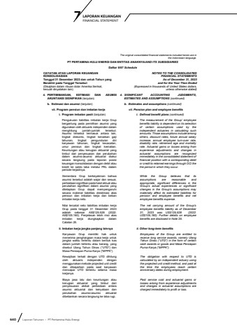 640 Laporan Tahunan %u2022 PT Pertamina Hulu EnergiLAPORAN KEUANGAN 7 FINANCIAL STATEMENTThe original consolidated financial statements included herein are in the Indonesian language.PT PERTAMINA HULU ENERGI DAN ENTITAS ANAKNYA/AND ITS SUBSIDIARIESDaftar 5/87 ScheduleCATATAN ATAS LAPORAN KEUANGANKONSOLIDASIANTanggal 31 Desember 2023 dan untuk Tahun yang Berakhir pada Tanggal Tersebut(Disajikan dalam ribuan dolar Amerika Serikat, kecuali dinyatakan lain)NOTES TO THE CONSOLIDATEDFINANCIAL STATEMENTS As of December 31, 2023and for the Year Then Ended(Expressed in thousands of United States dollars,unless otherwise stated)4. PERTIMBANGAN, ESTIMASI DAN ASUMSIAKUNTANSI SIGNIFIKAN (lanjutan)4. SIGNIFICANT ACCOUNTING JUDGMENTS, ESTIMATES AND ASSUMPTIONS (continued)b. Estimasi dan asumsi (lanjutan) b. Estimates and assumptions (continued)vii. Program pensiun dan imbalan kerja vii. Pension plan and employee benefitsi. Program imbalan pasti (lanjutan) i. Defined benefit plans (continued)Pengukuran liabilitas imbalan kerja Grupbergantung pada pemilihan asumsi yangdigunakan oleh aktuaris independen dalam menghitung jumlah-jumlah tersebut.Asumsi tersebut termasuk antara lain,tingkat diskonto, tingkat kenaikan gajitahunan, tingkat pengunduran dirikaryawan tahunan, tingkat kecacatan,umur pensiun dan tingkat kematian.Keuntungan atau kerugian aktuarial yangtimbul dari penyesuaian dan perubahandalam asumsi-asumsi aktuarial diakuisecara langsung pada laporan posisikeuangan konsolidasian dengan debit atau kredit ke saldo laba melalui PKL dalamperiode terjadinya.The measurement of the Group%u2019 employeebenefits liability is dependent on its selection of certain assumptions used by theindependent actuaries in calculating suchamounts. Those assumptions include among others, discount rates, future annual salaryincrease, annual employee turn-over rate,disability rate, retirement age and mortalityrate. Actuarial gains or losses arising fromexperience adjustments and changes inactuarial assumptions are recognizedimmediately in the consolidated statement of financial position with a corresponding debitor credit to retained earnings through OCI the the period in which they occur.Sementara Grup berkeyakinan bahwaasumsi tersebut adalah wajar dan sesuai,perbedaan signifikan pada hasil aktual atau perubahan signifikan dalam asumsi yangditetapkan Grup dapat mempengaruhisecara material liabilitas diestimasi ataspensiun dan imbalan kerja dan bebanimbalan kerja neto.While the Group believes that its assumptions are reasonable and appropriate, significant differences in the Group%u2019s actual experiences or significant changes in the Group%u2019s assumptions may materially affect its estimated liabilities for pension and employee benefits and net employee benefits expense.Nilai tercatat neto liabilitas imbalan kerjaGrup pada tanggal 31 Desember 2023adalah sebesar AS$125.528 (2022: AS$105.160). Penjelasan lebih rinci atasimbalan kerja diungkapkan dalamCatatan 25.The net carrying amount of the Group%u2019s employee benefits liability as of December 31, 2023 was US$125,528 (2022: US$105,160). Further details on employee benefits are disclosed in Note 25. ii. Imbalan kerja jangka panjang lainnya ii. Other long-term benefitsKaryawan Grup memiliki hak untukmenerima penghargaan masa kerja untukjangka waktu tertentu dalam bentuk kasdalam jumlah tertentu atau barang, yangdisebut Ulang Tahun Dinas (%u201cUTD%u201d) danMasa Persiapan Purna Karya (%u201cMPPK%u201d).Employees of the Group are entitled toreceive long service awards, namely UlangTahun Dinas (%u201cUTD%u201d) in the form of certaincash awards or goods and Masa PersiapanPurna Karya (%u201cMPPK%u201d).Kewajiban terkait dengan UTD dihitungoleh aktuaris independen denganmenggunakan metode projected unit credit dan dibayarkan pada saat karyawanmencapai UTD tertentu selama masakerjanya.The obligation with respect to UTD is calculated by an independent actuary using the projected unit credit method, and paid at the time the employees reach certain anniversary dates during employment.Biaya jasa lalu dan keuntungan ataukerugian aktuarial yang timbul daripenyesuaian akibat perbedaan antaraasumsi aktuarial dan kenyataan danperubahan asumsi-asumsi aktuarialdibebankan secara langsung ke laba rugi.Past service cost and actuarial gains or losses arising from experience adjustments and changes in actuarial assumptions are charged immediately to profit or loss.
