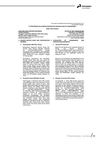 PT Pertamina Hulu Energi %u2022 Annual Report 641The original consolidated financial statements included herein are in the Indonesian language.PT PERTAMINA HULU ENERGI DAN ENTITAS ANAKNYA/AND ITS SUBSIDIARIESDaftar 5/88 ScheduleCATATAN ATAS LAPORAN KEUANGANKONSOLIDASIANTanggal 31 Desember 2023 dan untuk Tahun yang Berakhir pada Tanggal Tersebut(Disajikan dalam ribuan dolar Amerika Serikat, kecuali dinyatakan lain)NOTES TO THE CONSOLIDATEDFINANCIAL STATEMENTS As of December 31, 2023and for the Year Then Ended(Expressed in thousands of United States dollars,unless otherwise stated)5. AKUISISI ENTITAS ANAK DAN PARTICIPATING INTEREST5. ACQUISITION OF SUBSIDIARIES AND PARTICIPATING INTERESTS a. Perpanjangan KBH Blok Jabung a. Jabung PSC ExtensionBerdasarkan Keputusan Menteri Energi danSumber Daya Mineral Republik IndonesiaNo. 219.K/HK.02/MEM.M/2021 tanggal 9 November 2021 menetapkan untuk melakukanperpanjangan kontrak PSC selama lima tahun sejak berakhirnya masa perjanjian tanggal27 Februari 2023.Berdasarkan Amandemen dan PernyataanKembali Kontrak Bagi Hasil yang dibuat danditandatangani pada 12 November 2021 antaraSKK Migas dan Kontraktor, dengan tanggalefektif 27 Februari 2023 pukul 00:00, jangkawaktu kontrak adalah 20 (dua puluh) tahunterhitung sejak tanggal efektif. Kontraktor danpartisipasi interes di Wilayah Kerja Jabung terdiri dari PetroChina International Jabung Ltd. (30%)yang juga sebagai operator, PT Pertamina HuluEnergi Jabung (28%), PT GPI Jabung Indonesia(22%), dan PETRONAS Carigali (Jabung) Ltd.(20%).Based on the Decree of the Indonesian Minister ofEnergy and Mineral ResourcesNo. 219.K/HK.02/MEM.M/2021 dated November 9,2021 assign to extend PSC contract for five yearsfrom the end of the agreement period on February 27, 2023.Based on the Amendment and Restatement of the Production Sharing Contract made and signed on 12 November 2021 between SKK Migas and the Contractor, with an effective date of 27 February 2023 at 00:00, the contract period is 20 (twenty) years including from the effective date. Contractors and participating interests in the Jabung Working Area consist of PetroChina International Jabung Ltd. (30%) which is also the operator, PT Pertamina Hulu Energi Jabung (28%), PT GPI Jabung Indonesia (22%), and PETRONAS Carigali (Jabung) Ltd. (20%). b. Perubahan skema KBH Blok Corridor b. Changes of Corridor PSC schemePada tanggal 11 November 2019, PHE Corridormenandatangani KBH Gross Split Blok Corridordengan jangka waktu kontrak 20 tahun, yangberlaku efektif sejak tanggal 20 Desember 2023.Menteri Energi dan Sumber Daya MineralRepublik Indonesia, melalui Keputusan MESDMNo. 444.K/MG.01/MEM.M/2023 tanggal12 Desember 2023 tentang perubahan atasKeputusan MESDM No. 128K/10/MEM/2019tanggal 22 Juli 2019 tentang PerubahanPersetujuan Perpanjangan dan PenetapanBentuk dan Ketentuan-Ketentuan Pokok (Termsand Conditions) Kontrak Kerja Sama PadaWilayah Kerja Corridor, telah memberikanpersetujuan perubahan bentuk dan ketentuanketentuan pokok Kontrak Kerja Sama WilayahKerja Corridor dari skema gross split ke skemacost recovery.On November 11, 2019, PHE Corridor signed theCorridor Block Gross Split PSC for a contract periodof 20 years, which became effective from the dateDecember 20, 2023. Minister of Energy and MineralResources of the Republic of Indonesia, through Decree No. 444.K/MG.01/MEM.M/2023 datedDecember 12, 2023 regarding amendment toMEMR Decree 128K/10/MEM/2019 datedJuly 22, 2019 regarding Extension Approval and the stipulation of Terms and Conditions of theCooperation Contract on the Corridor Contract Area, has granted the approval to the changes of terms andconditions Corridor PSC from gross split scheme tocost recovery scheme.