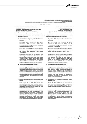PT Pertamina Hulu Energi %u2022 Annual Report 643The original consolidated financial statements included herein are in the Indonesian language.PT PERTAMINA HULU ENERGI DAN ENTITAS ANAKNYA/AND ITS SUBSIDIARIESDaftar 5/90 ScheduleCATATAN ATAS LAPORAN KEUANGANKONSOLIDASIANTanggal 31 Desember 2023 dan untuk Tahun yang Berakhir pada Tanggal Tersebut(Disajikan dalam ribuan dolar Amerika Serikat,kecuali dinyatakan lain)NOTES TO THE CONSOLIDATEDFINANCIAL STATEMENTSAs of December 31, 2023and for the Year Then Ended(Expressed in thousands of United States dollars,unless otherwise stated)5. AKUISISI ENTITAS ANAK DAN PARTICIPATING INTEREST (lanjutan)5. ACQUISITION OF SUBSIDIARIES AND PARTICIPATING INTERESTS (continued)d. Akuisisi Wilayah Kerja Bunga dan Peri Mahakam (lanjutan)d. Acquisition of the Bunga and Peri Mahakam Areas (continued)Pemerintah telah menetapkan PT Posco International ENP Indonesia (50%) dan PT Pertamina Hulu Energi North East Java (50%) sebagai pengelola WK Bunga.The government has appointed PT Posco International ENP Indonesia (50%) and PT Pertamina Hulu Energi North East Java (50%) as contractors in Bunga AreaBonus tanda tangan WK Bunga dan Peri Mahakan berturut-turut dengan nilai penuh sebesar AS$100 dan AS$50 yang dibayarkan Pada tanggal 17 April 2023.The signature bonus for Bunga and Peri Mahakam respectively with full amount are US$100 and the US$50 which has been paid in April 17, 2023.Kontrak Bagi Hasil (KBH) WK Peri Mahakam telah ditandatangani oleh Direktur PT Pertamina Hulu Borneo dengan Kepala SKK Migas pada tanggal 30 Mei 2023. KKS tersebut berlaku efektif setelah ditandatangani oleh Menteri ESDM pada tanggal 19 Juni 2023 dan akan berlaku selama 30 tahun dengan menggunakan skema KBH cost recovery.The Production Sharing Contract (PSC) for WK Peri Mahakam was signed by Director of PT Pertamina Hulu Borneo with Head of SKK Migas on May 30, 2023. The KKS is effective after being signed by the Minister of Energy and Mineral Resources on June 19, 2023 and will be valid for 30 years using PSC Cost Recovery scheme.e. Akuisisi Wilayah Kerja East Natuna e. Acquisition of the East Natuna AreaPemerintah juga menetapkan PT Pertamina East Natuna sebagai pengelola 100% WK East Natuna yang terletak pada offshore Laut Natuna dengan luas 10.484 kilometer persegi dengan bonus tanda tangan senilai AS$500 dan total investasi Komitmen Pasti tiga tahun pertama sebesar AS$12,5 Juta yang meliputi kegiatan studi G&G, akuisisi dan processing3D seismik 430 km2 serta pengemboran 1 sumur eksplorasi.The government has also appointed PT Pertamina East Natuna (100%) as contractor in East Natuna area which is located offshore the Natuna sea covering an area 10,484 km2 with signature bonus US$500 and total investment of Fixed Commitment for the first three years is US$12.5 million, which included G&G study activities, the acquisition & processing of 430 km2 of 3D seismic data and the drilling of one exploration well.f. Akuisisi Participating Interest Pada Wilayah KerjaMaselaf. Acquisition Of Participating Interest In Masela Working AreaPada tanggal 25 Juli 2023, PHE Masela dan Petronas Masela Sdn. Bhd. (%u201dPetronas Masela%u201d) menandatangani Perjanjian untuk mengakuisisi 35% Participating Interest di KBH WK Masela dari Shell Upstream Overseas Services Ltd.On July 25, 2023, PHE Masela and Petronas Masela Sdn. Bhd. (%u201cPetronas Masela%u201d) signed an Agreement to acquire 35% Participating Interest in KBH WK Masela from Shell Upstream Overseas Services Ltd.Berdasarkan dokumen Agreement for the Sale and Purchase (SPA) dan Deed of Assignment, PHE Masela memiliki PI sebesar 20% di blok Masela, sementara Petronas Masela memiliki PI sebesar 15%. Mengacu pada SPA, tanggal akuisi atau completion date adalah 18 Oktober 2023 dimana semua kondisi dan dokumen yang dipersyaratkan sudah terpenuhi dan pengendalian telah berpindah.Based on the Agreement for the Sale and Purchase (SPA) and Deed of Assignment documents, PHE Masela has 20% PI in the Masela block whilePetronas Masela own 15%. Referring to the SPA, the acquisition date or completion date is October 18, 2023 where all the required conditions and documents have been fulfilled and the control has been transferred.