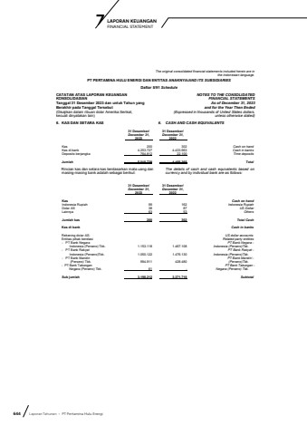 644 Laporan Tahunan %u2022 PT Pertamina Hulu EnergiLAPORAN KEUANGAN 7 FINANCIAL STATEMENTThe original consolidated financial statements included herein are in the Indonesian language.PT PERTAMINA HULU ENERGI DAN ENTITAS ANAKNYA/AND ITS SUBSIDIARIESDaftar 5/91 ScheduleCATATAN ATAS LAPORAN KEUANGANKONSOLIDASIANTanggal 31 Desember 2023 dan untuk Tahun yang Berakhir pada Tanggal Tersebut(Disajikan dalam ribuan dolar Amerika Serikat, kecuali dinyatakan lain)NOTES TO THE CONSOLIDATEDFINANCIAL STATEMENTS As of December 31, 2023and for the Year Then Ended(Expressed in thousands of United States dollars,unless otherwise stated)6. KAS DAN SETARA KAS 6. CASH AND CASH EQUIVALENTS31 Desember/ 31 Desember/December 31, December 31, 2023 2022Kas 200 302 Cash on handKas di bank 4.253.727 4.433.963 Cash in banksDeposito berjangka 764.812 22.100 Time depositsJumlah 5.018.739 4.456.365 TotalRincian kas dan setara kas berdasarkan mata uang dannmasing-masing bank adalah sebagai berikut:The details of cash and cash equivalents based on currency and by individual bank are as follows:31 Desember/ 31 Desember/December 31, December 31, 2023 2022Kas Cash on handIndonesia Rupiah 99 162 Indonesia RupiahDolar AS 38 87 US DollarLainnya 63 53 OthersJumlah kas 200 302 Total CashKas di bank Cash in banksRekening dolar AS: US dollar accounts:Entitas pihak berelasi Related party entities - PT Bank Negara PT Bank Negara -Indonesia (Persero) Tbk. 1.153.118 1.467.108 Indonesia (Persero)Tbk.- PT Bank Rakyat PT Bank Rakyat - Indonesia (Persero)Tbk. 1.050.122 1.476.130 Indonesia (Persero)Tbk. - PT Bank Mandiri PT Bank Mandiri -(Persero) Tbk. 994.911 428.480 (Persero)Tbk.- PT Bank Tabungan PT Bank Tabungan -Negara (Persero) Tbk. 61 - Negara (Persero) Tbk.Sub jumlah 3.198.212 3.371.718 Subtotal