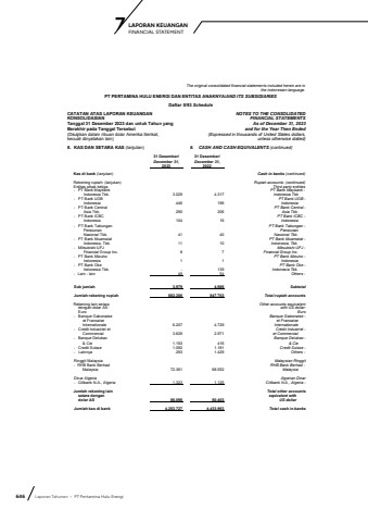 646 Laporan Tahunan %u2022 PT Pertamina Hulu EnergiLAPORAN KEUANGAN 7 FINANCIAL STATEMENTThe original consolidated financial statements included herein are in the Indonesian language.PT PERTAMINA HULU ENERGI DAN ENTITAS ANAKNYA/AND ITS SUBSIDIARIESDaftar 5/93 ScheduleCATATAN ATAS LAPORAN KEUANGANKONSOLIDASIANTanggal 31 Desember 2023 dan untuk Tahun yang Berakhir pada Tanggal Tersebut(Disajikan dalam ribuan dolar Amerika Serikat, kecuali dinyatakan lain)NOTES TO THE CONSOLIDATEDFINANCIAL STATEMENTS As of December 31, 2023and for the Year Then Ended(Expressed in thousands of United States dollars,unless otherwise stated)6. KAS DAN SETARA KAS (lanjutan) 6. CASH AND CASH EQUIVALENTS (continued)31 Desember/ 31 Desember/December 31, December 31, 2023 2022Kas di bank (lanjutan) Cash in banks (continued)Rekening rupiah: (lanjutan) Rupiah accounts: (continued)Entitas pihak ketiga Third party entities- PT Bank Maybank PT Bank Maybank -Indonesia Tbk. 3.029 4.317 Indonesia Tbk- PT Bank UOB PT Bank UOB - Indonesia 446 196 Indonesia- PT Bank Central PT Bank Central - Asia Tbk. 290 206 Asia Tbk.- PT Bank ICBC PT Bank ICBC -Indonesia 104 16 Indonesia- PT Bank Tabungan PT Bank Tabungan - Pensiunan PensiunanNasional Tbk. 41 40 Nasional Tbk.- PT Bank Muamalat PT Bank Muamalat -Indonesia, Tbk. 11 10 Indonesia, Tbk.- Mitsubishi UFJ Mitsubishi UFJ - Financial Group Inc. 8 7 Financial Group Inc.- PT Bank Mizuho PT Bank Mizuho -Indonesia 1 1 Indonesia - PT Bank Oke PT Bank Oke - Indonesia Tbk. - 139 Indonesia Tbk.- Lain - lain 49 54 Others -Sub jumlah 3.979 4.986 SubtotalJumlah rekening rupiah 882.288 847.703 Total rupiah accountsRekening lain setara Other accounts equivalentdengan dolar AS: with US dollar:Euro Euro - Banque Gabonaise Banque Gabonaise - et Francaise et Francaise Internationale 6.207 4.729 Internationale- Cr%u00e9dit Industriel et Cr%u00e9dit Industriel -Commercial 3.629 2.971 et Commercial - Banque Delubac Banque Delubac -& Cie 1.193 416 & Cie - Credit Suisse 1.092 1.181 Credit Suisse - - Lainnya 293 1.429 Others - Ringgit Malaysia Malaysian Ringgit - RHB Bank Berhad RHB Bank Berhad -Malaysia 72.361 68.552 MalaysiaDinar Algeria Algerian Dinar - Citibank N.A., Algeria 1.323 1.125 Citibank N.A., Algeria -Jumlah rekening lain Total other accountssetara dengan equivalent withdolar AS 86.098 80.403 US dollarJumlah kas di bank 4.253.727 4.433.963 Total cash in banks