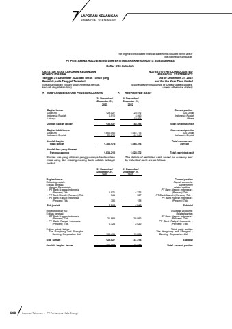 648 Laporan Tahunan %u2022 PT Pertamina Hulu EnergiLAPORAN KEUANGAN 7 FINANCIAL STATEMENTThe original consolidated financial statements included herein are in the Indonesian language.PT PERTAMINA HULU ENERGI DAN ENTITAS ANAKNYA/AND ITS SUBSIDIARIESDaftar 5/95 ScheduleCATATAN ATAS LAPORAN KEUANGANKONSOLIDASIANTanggal 31 Desember 2023 dan untuk Tahun yang Berakhir pada Tanggal Tersebut(Disajikan dalam ribuan dolar Amerika Serikat, kecuali dinyatakan lain)NOTES TO THE CONSOLIDATEDFINANCIAL STATEMENTS As of December 31, 2023and for the Year Then Ended(Expressed in thousands of United States dollars,unless otherwise stated)7. KAS YANG DIBATASI PENGGUNAANNYA 7. RESTRICTED CASH31 Desember/ 31 Desember/December 31, December 31, 2023 2022Bagian lancar Current portionDolar AS 128.027 23.512 US DollarIndonesia Rupiah 5.510 4.940 Indonesia RupiahLainnya - 13.804 OthersJumlah bagian lancar 133.537 42.256 Total current portionBagian tidak lancar Non-current portionDolar AS 1.650.050 1.541.776 US DollarIndonesia Rupiah 50.625 44.540 Indonesia RupiahJumlah bagian Total non-currenttidak lancar 1.700.675 1.586.316 portionJumlah kas yang dibatasiPenggunaannya 1.834.212 1.628.572 Total restricted cashRincian kas yang dibatasi penggunaanya berdasarkan mata uang dan masing-masing bank adalah sebagai berikut:The details of restricted cash based on currency and by individual bank are as follows:31 Desember/ 31 Desember/December 31, December 31, 2023 2022Bagian lancar Current portionRekening rupiah: Rupiah accounts:Entitas berelasi Government dengan Pemerintah related entities- PT Bank Negara Indonesia PT Bank Negara Indonesia -(Persero) Tbk. 4.571 4.275 (Persero) Tbk.- PT Bank Mandiri (Persero) Tbk. 544 507 PT Bank Mandiri (Persero) Tbk. -- PT Bank Rakyat Indonesia PT Bank Rakyat Indonesia - (Persero) Tbk. 395 158 (Persero) Tbk.Sub jumlah 5.510 4.940 Subtotal Rekening dolar AS: US dollar accounts:Entitas berelasi Related parties- PT Bank Negara Indonesia PT Bank Negara Indonesia -(Persero) Tbk. 21.869 20.992 (Persero) Tbk.- PT Bank Rakyat Indonesia PT Bank Rakyat Indonesia -(Persero) Tbk. 5.724 2.520 (Persero) Tbk.Entitas pihak ketiga Third party entities- The Hongkong and Shanghai The Hongkong and Shanghai - Banking Corporation Ltd. 100.434 13.804 Banking Corporation Ltd.Sub jumlah 128.027 37.316 SubtotalJumlah bagian lancar 133.537 42.256 Total current portion