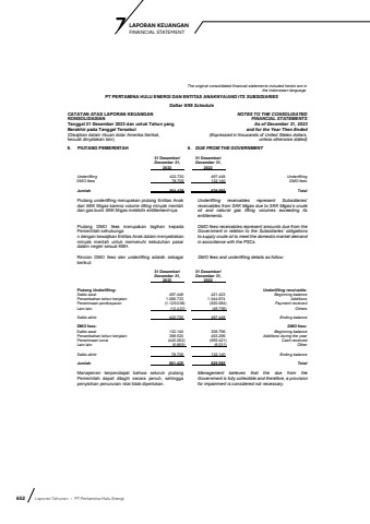 652 Laporan Tahunan %u2022 PT Pertamina Hulu EnergiLAPORAN KEUANGAN 7 FINANCIAL STATEMENTThe original consolidated financial statements included herein are in the Indonesian language.PT PERTAMINA HULU ENERGI DAN ENTITAS ANAKNYA/AND ITS SUBSIDIARIESDaftar 5/99 ScheduleCATATAN ATAS LAPORAN KEUANGANKONSOLIDASIANTanggal 31 Desember 2023 dan untuk Tahun yang Berakhir pada Tanggal Tersebut(Disajikan dalam ribuan dolar Amerika Serikat,kecuali dinyatakan lain)NOTES TO THE CONSOLIDATEDFINANCIAL STATEMENTSAs of December 31, 2023and for the Year Then Ended(Expressed in thousands of United States dollars,unless otherwise stated)9. PIUTANG PEMERINTAH 9. DUE FROM THE GOVERNMENT31 Desember/ 31 Desember/December 31, December 31,2023 2022Underlifting 422.720 497.448 UnderliftingDMO fees 78.709 132.140 DMO feesJumlah 501.429 629.588 TotalPiutang underlifting merupakan piutang Entitas Anak dari SKK Migas karena volume lifting minyak mentah dan gas bumi SKK Migas melebihi entitlement-nya.Underlifting receivables represent Subsidiaries%u2019 receivables from SKK Migas due to SKK Migas%u2019s crude oil and natural gas lifting volumes exceeding its entitlements.Piutang DMO fees merupakan tagihan kepada Pemerintah sehubungan dengan kewajiban Entitas Anak dalam menyediakan minyak mentah untuk memenuhi kebutuhan pasar dalam negeri sesuai KBH.DMO fees receivables represent amounts due from the Government in relation to the Subsidiaries%u2019 obligations to supply crude oil to meet the domestic market demand in accordance with the PSCs.Rincian DMO fees dan underlifting adalah sebagai berikut:DMO fees and underlifting details as follo31 Desember/ 31 Desember/December 31, December 31,2023 2022Piutang Underlifting: Underlifting receivable:Saldo awal 497.448 421.423 Beginning balancePenambahan tahun berjalan 1.066.733 1.044.874 AdditionsPenerimaan pembayaran (1.129.038) (920.084) Payment receivedLain-lain (12.423) (48.765) OthersSaldo akhir 422.720 497.448 Ending balanceDMO fees: DMO fees:Saldo awal 132.140 306.796 Beginning balancePenambahan tahun berjalan 398.520 493.296 Additions during the yearPenerimaan tunai (445.082) (659.421) Cash receivedLain-lain (6.869) (8.531) OtherSaldo akhir 78.709 132.140 Ending balanceJumlah 501.429 629.588 TotalManajemen berpendapat bahwa seluruh piutang Pemerintah dapat ditagih secara penuh, sehingga penyisihan penurunan nilai tidak diperlukan.Management believes that the due from the Government is fully collectible and therefore, a provision for impairment is considered not necessary.