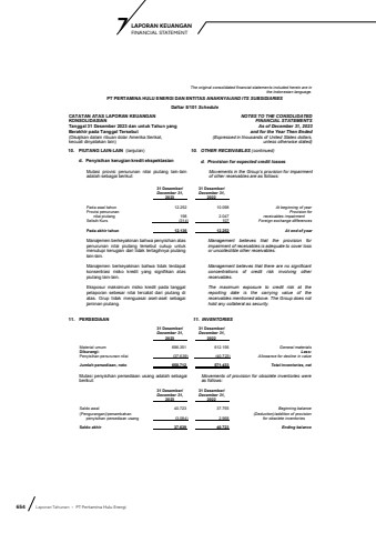 654 Laporan Tahunan %u2022 PT Pertamina Hulu EnergiLAPORAN KEUANGAN 7 FINANCIAL STATEMENTThe original consolidated financial statements included herein are in the Indonesian language.PT PERTAMINA HULU ENERGI DAN ENTITAS ANAKNYA/AND ITS SUBSIDIARIESDaftar 5/101 ScheduleCATATAN ATAS LAPORAN KEUANGANKONSOLIDASIANTanggal 31 Desember 2023 dan untuk Tahun yang Berakhir pada Tanggal Tersebut(Disajikan dalam ribuan dolar Amerika Serikat, kecuali dinyatakan lain)NOTES TO THE CONSOLIDATEDFINANCIAL STATEMENTS As of December 31, 2023and for the Year Then Ended(Expressed in thousands of United States dollars,unless otherwise stated)10. PIUTANG LAIN-LAIN (lanjutan) 10. OTHER RECEIVABLES (continued)d. Penyisihan kerugian kredit ekspektasian d. Provision for expected credit lossesMutasi provisi penurunan nilai piutang lain-lain adalah sebagai berikut:Movements in the Group%u2019s provision for impairmentof other receivables are as follows:31 Desember/ 31 Desember/December 31, December 31, 2023 2022Pada awal tahun 12.252 10.098 At beginning of yearProvisi penurunan Provision fornilai piutang 198 2.047 receivables impairmentSelisih Kurs (314) 107 Foreign exchange differencesPada akhir tahun 12.136 12.252 At end of yearManajemen berkeyakinan bahwa penyisihan atas penurunan nilai piutang tersebut cukup untuk menutupi kerugian dari tidak tertagihnya piutang lain-lain. Manajemen berkeyakinan bahwa tidak terdapat konsentrasi risiko kredit yang signifikan atas piutang lain-lain. Eksposur maksimum risiko kredit pada tanggal pelaporan sebesar nilai tercatat dari piutang di atas. Grup tidak menguasai aset-aset sebagai jaminan piutang.Management believes that the provision for impairment of receivables is adequate to cover loss or uncollectible other receivables.Management believes that there are no significant concentrations of credit risk involving otherreceivables.The maximum exposure to credit risk at the reporting date is the carrying value of the receivables mentioned above. The Group does not hold any collateral as security.11. PERSEDIAAN 11. INVENTORIES31 Desember/ 31 Desember/December 31, December 31, 2023 2022Material umum 696.351 612.156 General materialsDikurangi: Less:Penyisihan penurunan nilai (37.639) (40.723) Allowance for decline in valueJumlah persediaan, neto 658.712 571.433 Total inventories, netMutasi penyisihan persediaan usang adalah sebagai berikut:Movements of provision for obsolete inventories were as follows:31 Desember/ 31 Desember/December 31, December 31, 2023 2022Saldo awal 40.723 37.755 Beginning balance(Pengurangan)/penambahan (Deduction)/addition of provision penyisihan persediaan usang (3.084) 2.968 for obsolete inventoriesSaldo akhir 37.639 40.723 Ending balance