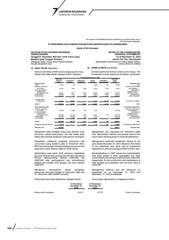 656 Laporan Tahunan %u2022 PT Pertamina Hulu EnergiLAPORAN KEUANGAN 7 FINANCIAL STATEMENTThe original consolidated financial statements included herein are in the Indonesian language.PT PERTAMINA HULU ENERGI DAN ENTITAS ANAKNYA/AND ITS SUBSIDIARIESDaftar 5/103 ScheduleCATATAN ATAS LAPORAN KEUANGANKONSOLIDASIANTanggal 31 Desember 2023 dan untuk Tahun yang Berakhir pada Tanggal Tersebut(Disajikan dalam ribuan dolar Amerika Serikat, kecuali dinyatakan lain)NOTES TO THE CONSOLIDATEDFINANCIAL STATEMENTS As of December 31, 2023and for the Year Then Ended(Expressed in thousands of United States dollars,unless otherwise stated)12. ASET TETAP (lanjutan) 12. FIXED ASSETS (continued)Seluruh aset tetap dimiliki secara langsung oleh Grup. Mutasi aset tetap adalah sebagai berikut: (lanjutan)All fixed assets are directly owned by the Group. Themovements in fixed assets are as follows: (continued)31 Desember/December 31, 2022Saldo awal/ Saldo akhir/Beginning Penambahan/ Pengurangan/ Koreksi/ Reklasifikasi/ Endingbalance Additions Deductions Correction Reclassifications balanceBiaya perolehan Acquisition costTanah 21.632 39 - (1.555) 264 20.380 LandBangunan, prasarana Buildings, improvements dan instalasi 38.278 1.099 (338) (3.023) 1.929 37.945 and installationsMesin dan peralatan Machinery andperabotan dan equipment, fixtureperlengkapan kantor 149.625 2.571 (1.615) (12.609) 4.658 142.630 and office furnitureHarta bergerak 800.598 8.221 (373) (2.607) 21.924 827.763 Movable assetsKonstruksi baja 134.777 30 (996) (11.357) 7.216 129.670 Steel constructionsAset tetap dalam pembangunan 24.152 36.559 - (1.672) (42.124 ) 16.915 Construction in progressJumlah 1.169.062 48.519 (3.322) (32.823) (6.133 ) 1.175.303 TotalAkumulasi penyusutan Accumulated depreciation Bangunan, prasarana Buildings, improvements dan instalasi (27.676) (1.890) 267 2.244 - (27.055) and installationsMesin dan peralatan Machinery andperabotan dan equipment, fixtureperlengkapan kantor (122.259) (10.187) 1.595 10.531 195 (120.125) and office furnitureHarta bergerak (377.281) (42.665) 373 1.537 - (418.036) Movable assetsKonstruksi baja (97.173) (8.030) 996 8.752 - (95.455) Steel constructionsJumlah (624,389) (62.772) 3,231 23.064 195 (660.671) TotalPenyisihan penurunan nilai (9.710) - 4.127 89 433 (5.061) Provision for impairmentNilai buku neto 534.963 509.571 Net book valueManajemen telah mengkaji ulang atas estimasi umur ekonomis, metode penyusutan, dan nilai residu pada setiap akhir periode pelaporan pada laporan keuangan.Manajemen melakukan pengujian penurunan nilai untuk tahun yang berakhir pada 31 Desember 2023. Dari hasil perhitungan tersebut terdapat penurunan nilai pada tahun 2023 sebesar AS$319 (2022: $nihil).Management has reassesed the estimated useful lives, depreciation method, and residual value at the end of each reporting period in financial statements. Management performed impairment testing for the year ended December 31, 2023. Based on the results of the impairment test, there was an impairmentadjustment in 2023 amounting to US$319 (2022: $nil).Reklasifikasi pada tahun 2022 termasuk reklasifikasi dari aset tetap ke akun piutang lain-lain dan aset lancar lainnya masing-masing sebesar AS$3.322 dan AS$2.265 atas pembangunan dan pemeliharaan fasilitas dan instalasi VHS dengan nilai buku sebesar AS$5.587.Reclassifications in 2022 include the reclassification from fixed assets to other receivables and other current assets amounting to US$3,322 and US$2,265, respectively, for the construction and maintenance of VHS facilities and installation with net book value of US$5,587.Manajemen berkeyakinan bahwa penyisihan penurunan nilai pada tanggal 31 Desember 2023 dan31 Desember 2022 adalah memadai.Management believes that the allowance for impairment as of, December 31, 2023 andDecember 31, 2022 is adequate.Penyusutan aset tetap dibebankan sebagai berikut: Fixed assets depreciation is charged as follows:31 Desember/ 31 Desember/December 31, December 31, 2023 2022Beban pokok penjualan 68.401 62.772 Costs of revenues
