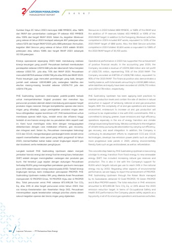 LAPORAN MANAJEMENMANAGEMENT REPORT 2 3 4 5 6 7Sumber Daya 2C tahun 2023 mencapai 488 MMBOE, atau 168% dari RKAP dan penambahan cadangan 1P sebesar 450 MMBOE atau 109% dari target RKAP 2023. Selain itu, kegiatan Workover yang selesai di tahun 2023 terdapat sebanyak 837 pekerjaan atau setara 122% dari target RKAP 2023 yaitu 688 pekerjaan. Kemudian, kegiatan Well Service yang selesai di tahun 2023 adalah 32.624 pekerjaan atau setara 108% dari target RKAP 2023 sebanyak 30.159 pekerjaan. Kinerja operasional sepanjang 2023 telah mendukung realisasi kinerja keuangan yang positif. Perusahaan berhasil membukukan pendapatan sebesar USD14.568 juta dan laba bersih tahun berjalan sebesar USD2.725 juta atau 70% dari RKAP 2023. Perusahaan mencatat EBITDA sebesar USD8.738 juta atau 95% dari RKAP 2023.Posisi keuangan juga mencatat perimbangan yang baik, dengan jumlah aset sebesar USD30.889 juta; sedangkan liabilitas dan ekuitas masing-masing tercatat sebesar USD16.710 juta dan USD14.178 juta.PHE Subholding Upstream menerapkan praktik-praktik terbaik untuk mempertahankan tingkat produksi dan menahan laju penurunan produksi alamiah dalam mendukung pencapaian target produksi migas nasional. Dengan kompleksitas operasi dan bisnis migas yang dihadapi, upaya peningkatan produksi migas akan terus ditingkatkan sejalan komitmen LST. PHE berkomitmen untuk membawa operasi lebih hijau, rendah emisi dan efisiensi tinggi terlebih di era transisi energi dan isu perubahan iklim seperti saat ini. Kami turut memitigasi risiko iklim dengan mengupayakan dekarbonisasi dengan cara melakukan efisiensi, gas recovery, dan integrasi aset. Selain itu, Perusahaan menerapkan teknologi CCS dan CCUS, mengembangkan pembangkit listrik rendah emisi seperti memanfaatkan solar panel yang lebih progressif di tahun 2023, memanfaatkan bahan bakar ramah lingkungan seperti gas dan biodiesel, serta melakukan penghijauan. Langkah konkret PHE Subholding Upstream dalam menjadi jembatan transisi energi dari energi fosil ke energi baru terbarukan (EBT) adalah dengan meningkatkan cadangan dan produksi gas bumi. Hal tersebut juga sejalan dengan dukungan Perusahaan terhadap RUEN yang menargetkan pemakaian gas bumi mencapai porsi 24% dalam bauran energi nasional pada 2050. Terkait kinerja lingkungan lainnya, kami melaporkan pencapaian PROPER. PHE Subholding Upstream melalui WK yang dikelola Anak Perusahaan memperoleh 12 PROPER Emas, 19 PROPER Hijau dan 6 PROPER Biru. Total penurunan emisi PHE sebesar 872.495,58 Ton CO%u2082 Eq, atau 24% di atas target penurunan emisi tahun 2023. Dari sisi kinerja Keselamatan dan Kesehatan Kerja (K3), Perusahaan menempatkan aspek keselamatan sebagai prioritas utama dalam seluruh kegiatan operasi dan bisnis migas yang dijalankan. Resources in 2023 totaled 488 MMBOE, or 168% of the RKAP and the addition of 1P reserves totaled 450 MMBOE or 109% of the 2023 RKAP target. In addition to the foregoing, Workover activities completed in 2023 included 837 works, equivalent to 122% of the 2023 RKAP target of 688 works. Also, the Well Service activities completed in 2023 totalled 32,624 works or equivalent to 108% of the 2023 RKAP target of 30,159 works. Operational performance in 2023 has supported the achievement of positive financial results. In the accounting year 2023, the Company recorded a revenue of USD14,568 million and net profit of USD2,725 million, representing 70% of the 2023 RKAP. The Company recorded an EBITDA of USD8,738 million, equivalent to 95% of the 2023 RKAP. The financial position also demonstrates a healthy balance, with total assets amounting to USD30,889 million; while liabilities and equity have been recorded at USD16,710 million and USD14,178 million, respectively.PHE Subholding Upstream has been applying best practices to maintain production levels and contain the rate of decline in natural production in support of achieving national oil and gas production targets. With the complexity of oil and gas operations and business environment, endeavours to increase oil and gas production will continue to be implemented in line with ESG commitments. PHE is committed to bringing greener, lower emissions and high efficiency operations especially in the era of energy transition and climate change issues being faced today. We also contribute to the mitigation of climate risk by pursuing decarbonization by carrying out efficiency, gas recovery, and asset integration. In addition, the Company is continuing its development efforts to implement CCS and CCUS technologies, develops low-emission power plants such as utilizing more progressive solar panels in 2023, utilizing environmentally friendly fuels such as gas and biodiesel, as well as reforestation. The concrete step taken by PHE Subholding Upstream in becoming a bridge to energy transition from fossil energy to new renewable energy (EBT) has included increasing natural gas reserves and production. This is also in line with the Company%u2019s support for RUEN which targets natural gas use to reach 24% in the national energy mix by 2050. Regarding other aspects of environmental performance, we are happy to report the achievement of PROPER. PHE Subholding Upstream through the Rokan Block managed by its Subsidiaries obtained 12 Gold PROPER, 19 Green PROPER and 6 Blue PROPER awards. The total reduction in PHE emissions amounted to 872,495.58 Tons CO%u2082 Eq, or 24% above the 2023 emission reduction target. In terms of Occupational Safety and Health (K3) performance, the Company places safety aspects as a top priority in all of its oil and gas operations and business activities..64 Laporan Tahunan %u2022 PT Pertamina Hulu Energi
