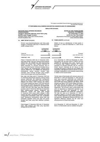 658 Laporan Tahunan %u2022 PT Pertamina Hulu EnergiLAPORAN KEUANGAN 7 FINANCIAL STATEMENTThe original consolidated financial statements included herein are in the Indonesian language.PT PERTAMINA HULU ENERGI DAN ENTITAS ANAKNYA/AND ITS SUBSIDIARIESDaftar 5/105 ScheduleCATATAN ATAS LAPORAN KEUANGANKONSOLIDASIANTanggal 31 Desember 2023 dan untuk Tahun yang Berakhir pada Tanggal Tersebut(Disajikan dalam ribuan dolar Amerika Serikat,kecuali dinyatakan lain)NOTES TO THE CONSOLIDATEDFINANCIAL STATEMENTSAs of December 31, 2023and for the Year Then Ended(Expressed in thousands of United States dollars,unless otherwise stated)12. ASET TETAP (lanjutan) 12. FIXED ASSETS (continued)Rincian rugi penjualan/pelepasan aset tetap pada tanggal 31 Desember 2023 dan 31 Desember 2022adalah sebagai berikut:Details of loss on sale/disposal of fixed assets in December 31, 2023 and December 31, 2022 are as follows:31 Desember/ 31 Desember/December 31, December 31,2023 2022Harga jual 55 164 ProceedsDikurangi: Nilai buku neto (53) (91) Less: Net book valueLaba/(rugi) - neto 2 73 Gain/(loss) %u2013 netPada 31 Desember 2023 dan 31 Desember 2022, aset tetap dengan nilai buku masing-masing sebesarAS$472.753 dan AS$488.145, telah diasuransikankepada PT Asuransi Tugu Pratama Indonesia, PT Marsh Indonesia, PT Asuransi Sinarmas, dan PT Asuransi Chubb Syariah Indonesia terhadap semua risiko dengan nilai pertanggungan masing-masingsebesar AS$767.941 dan AS$804.745. Manajemen berkeyakinan bahwa asuransi tersebut telah memadai untuk menutup kerugian yang mungkin timbul terkait dengan aset yang diasuransikan.As of December 31, 2023 and December 31, 2022,fixed assets with net book value of US$472,753 and US$488,145 respectively, have been insured with PT Asuransi Tugu Pratama Indonesia, PT Marsh Indonesia, PT Asuransi Sinarmas, dan PT Asuransi Chubb Syariah Indonesia for all risks at a total coverage amounting to US$767,941 and US$804,745respectively. Management believes that the insurance coverage is adequate to cover possible losses arising in relation to the insured assets.Nilai wajar aset tetap pada 31 Desember 2023 dan 31 Desember 2022 dengan nilai buku masing-masing sebesar AS$53.695, dan AS$33.587, berdasarkan laporan dari penilai independen KJPP Amin Nirwan Alfiantori dan Rekan, KJPP Iskandar dan Rekan, KJPP Susan Widjojo dan Rekan, KJPP Ruki Safrudin dan Rekan, dan KJPP Asmawi dan Rekan, masingmasing adalah sebesar AS$105.541 dan AS$53.230.Jumlah nilai buku aset tetap yang tidak dilakukan penilaian pada 31 Desember 2023 dan 31 Desember 2022 masing-masing sebesar AS$68.670 dan AS$76.391. Jumlah nilai wajar pada tanggal 31 Desember 2023 masuk dalam kategori 3 pada hirearki nilai wajar. Pendekatan peniliaian nilai wajar menggunakan pendekatan pasar dan pendekatan biaya. Manajemen berkeyakinan bahwa tidak ada perbedaan signifikan antara nilai wajar dan jumlah tercatat aset tetap yang tidak dilakukan penilaian tersebut.The fair value of fixed assets with net book value as ofDecember 31, 2023 and December 31, 2022 with net book value amounted US$53,695 and US$33,587respectively, base on independent appraisal reportsfrom KJPP Amin Nirwan Alfiantori dan Rekan, KJPP Iskandar dan Rekan, KJPP Susan Widjojo dan Rekan, KJPP Ruki Safrudin dan Rekan, dan KJPP Asmawi dan Rekan amounted US$105,541 and US$53,230respectively. The net book value of fixed assets that were not appraised by independent appraiser as of December 31, 2023 and December 31, 2022 amounted US$68,670 and US$76,391 respectively.The total fair value as of December 31, 2023 is included in category 3 on the fair value hierarchy. Fair value valuation approach using market approach and cost approach. Management believes that there is no significant difference between the fair value and carrying amount of these fixed assets.Pada tanggal 31 Desember 2023 dan 31 Desember 2022, tidak terdapat aset tetap yang digunakan sebagai jaminan dan hibah.As of December 31, 2023 and December 31, 2022,there is no fixed assets used as collateral and grant.