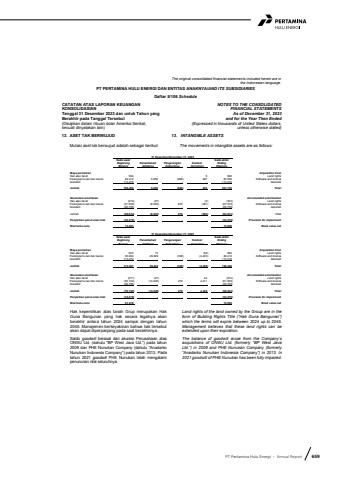 PT Pertamina Hulu Energi %u2022 Annual Report 659The original consolidated financial statements included herein are in the Indonesian language.PT PERTAMINA HULU ENERGI DAN ENTITAS ANAKNYA/AND ITS SUBSIDIARIESDaftar 5/106 ScheduleCATATAN ATAS LAPORAN KEUANGANKONSOLIDASIANTanggal 31 Desember 2023 dan untuk Tahun yang Berakhir pada Tanggal Tersebut(Disajikan dalam ribuan dolar Amerika Serikat,kecuali dinyatakan lain)NOTES TO THE CONSOLIDATEDFINANCIAL STATEMENTSAs of December 31, 2023and for the Year Then Ended(Expressed in thousands of United States dollars,unless otherwise stated)13. ASET TAK BERWUJUD 13. INTANGIBLE ASSETSMutasi aset tak berwujud adalah sebagai berikut: The movements in intangible assets are as follows:31 Desember/December 31, 2023Saldo awal/ Saldo akhir/Beginning Penambahan/ Pengurangan/ Koreksi/ EndingBalance Additions Deductions Correction RbalanceBiaya perolehan Acquisition CostHak atas tanah 584 - - 6 590 Land rightsPerangkat lunak dan lisensi 82.412 5.659 (865) 487 87.693 Software and licenseGoodwill 113.470 - - - 113.470 GoodwillJumlah 196.466 5.659 (865) 493 201.753 TotalAkumulasi amortisasi Accumulated amortizationHak atas tanah (274) (27) - (2) (303) Land rightsPerangkat lunak dan lisensi (61.505) (6.505) 875 (381) (67.516) Software and licenseGoodwill (26.755) - - - (26.755) GoodwillJumlah (88.534) (6.532) 875 (383) (94.574) TotalPenyisihan penurunan nilai (33.379) - - - (33.379) Provision for impairmentNilai buku-neto 74.553 73.800 Book value-net31 Desember/December 31, 2022Saldo awal/ Saldo akhir/Beginning Penambahan/ Pengurangan/ Koreksi/ EndingBalance Additions Deductions Correction RbalanceBiaya perolehan Acquisition CostHak atas tanah 623 13 - (52) 584 Land rightsPerangkat lunak dan lisensi 60.294 26.829 (308) (4.403) 82.412 Software and licenseGoodwill 113.470 - - - 113.470 GoodwillJumlah 174.387 26.842 (308) (4.455) 196.466 TotalAkumulasi amortisasi Accumulated amortizationHak atas tanah (271) (27) - 24 (274) Land rightsPerangkat lunak dan lisensi (52.164) (14.022) 270 4.411 (61.505) Software and licenseGoodwill (26.755) - - - (26.755) GoodwillJumlah (79.190) (14.049) 270 4.435 (88.534) TotalPenyisihan penurunan nilai (33.379) - - - (33.379) Provision for impairmentNilai buku-neto 61.818 74.553 Book value-netHak kepemilikan atas tanah Grup merupakan Hak Guna Bangunan yang hak secara legalnya akan berakhir antara tahun 2024 sampai dengan tahun 2045. Manajemen berkeyakinan bahwa hak tersebut akan dapat diperpanjang pada saat berakhirnya.Land rights of the land owned by the Group are in the form of Building Rights Title (%u201cHak Guna Bangunan%u201d) which the terms will expire between 2024 up to 2045. Management believes that these land rights can be extended upon their expiration.Saldo goodwill berasal dari akuisisi Perusahaan atas ONWJ Ltd. (dahulu %u201cBP West Java Ltd.%u201d) pada tahun 2009 dan PHE Nunukan Company (dahulu %u201cAnadarko Nunukan Indonesia Company%u201d) pada tahun 2013. Pada tahun 2021 goodwill PHE Nunukan telah mengalami penurunan nilai seluruhnya.The balance of goodwill arose from the Company%u2019s acquisitions of ONWJ Ltd. (formerly %u201cBP West Java Ltd.%u201d) in 2009 and PHE Nunukan Company (formerly %u201cAnadarko Nunukan Indonesia Company%u201d) in 2013. In 2021 goodwill of PHE Nunukan has been fully impaired.