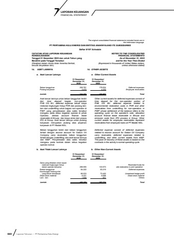 660 Laporan Tahunan %u2022 PT Pertamina Hulu EnergiLAPORAN KEUANGAN 7 FINANCIAL STATEMENTThe original consolidated financial statements included herein are in the Indonesian language.PT PERTAMINA HULU ENERGI DAN ENTITAS ANAKNYA/AND ITS SUBSIDIARIESDaftar 5/107 ScheduleCATATAN ATAS LAPORAN KEUANGANKONSOLIDASIANTanggal 31 Desember 2023 dan untuk Tahun yang Berakhir pada Tanggal Tersebut(Disajikan dalam ribuan dolar Amerika Serikat, kecuali dinyatakan lain)NOTES TO THE CONSOLIDATEDFINANCIAL STATEMENTS As of December 31, 2023and for the Year Then Ended(Expressed in thousands of United States dollars,unless otherwise stated)14. ASET LAINNYA 14. OTHER ASSETSa. Aset Lancar Lainnya a. Other Current Assets31 Desember/ 31 Desember/December 31, December 31, 2023 2022Beban tangguhan 206.781 176.634 Deferred expensesPiutang karyawan 3.472 4.333 Employee receivablesJumlah 210.253 180.967 TotalAset lancar lainnya untuk beban tangguhan terdiri dari time deposit bagian non-operator PHE OG BV, deferred expense terkait biaya restorasi lingkungan hidup PHR dan piutang lainlain dari underlifting untuk bagian non-operator diPIEP yang penyelesaian atas saldo tersebut mengacu pada siklus kegiatan operasi di pihak Operator, alokasi account finance leasereceivable di Elnusa dan biaya emisi dari proses IPO di Group. Aset lancar lainnya untuk piutang karyawan merupakan piutang atas pinjaman karyawan di PT Badak NGL.Other current assets for deferred expenses consist of time deposit for the non-operator portion of PHE OG BV, deferred expense related to environmental restoration costs in PHR and other receivables from underlifting for non-operators in PIEP whose settlement of the balance refers to the operating cycle on the operator's side, allocation account finance lease receivable in Elnusa and emission costs from IPO process in Group. Other current assets for employee receivables represent receivables from employee loans at PT Badak NGL.Beban tangguhan terdiri dari beban tangguhan terkait dengan escrow account for Gabon Oil Company carry receivable, beban tangguhan terkait dengan underlifting, dan aset lancar lainnya dari M&P. Penyelesaian atas saldo tersebut mengacu pada kontrak dalam siklus kegiatan operasi normal. Deferred expense consist of deferred expenses related to escrow account for Gabon Oil Company carry receivable, deferred expenses related to underlifting, and other current assets from M&P. The pace of recovery of these assets is based on the contracts in the activity%u2019s normal operating cycle.b. Aset Tidak Lancar Lainnya b. Other Non-Current Assets31 Desember/ 31 Desember/December 31, December 31, 2023 2022Dana yang dibatasi untuk tujuanrestorasi lingkungan hidup Restricted funds for dalam operasi bersama 296.555 103.573 site restoration in joint operationBeban tangguhan 84.222 83.219 Deferred expensesKeuntungan lindung nilaiyang belum terealisasi 66.533 73.400 Unrealized hedge profitDead stock material 6.231 6.698 Dead stock materialLain - lain 1.839 831 OthersJumlah 455.380 267.721 Total