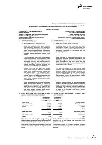 PT Pertamina Hulu Energi %u2022 Annual Report 661The original consolidated financial statements included herein are in the Indonesian language.PT PERTAMINA HULU ENERGI DAN ENTITAS ANAKNYA/AND ITS SUBSIDIARIESDaftar 5/108 ScheduleCATATAN ATAS LAPORAN KEUANGANKONSOLIDASIANTanggal 31 Desember 2023 dan untuk Tahun yang Berakhir pada Tanggal Tersebut(Disajikan dalam ribuan dolar Amerika Serikat, kecuali dinyatakan lain)NOTES TO THE CONSOLIDATEDFINANCIAL STATEMENTS As of December 31, 2023and for the Year Then Ended(Expressed in thousands of United States dollars,unless otherwise stated)14. ASSET LAINNYA (lanjutan) 14. OTHER ASSETS (continued)b. Aset Tidak Lancar Lainnya (lanjutan) b. Other Non-Current Assets (continued)Dana yang dibatasi untuk tujuan restorasilingkungan hidup adalah kas yang disetorkanoleh operator KBH sebagai pencadangan danaterkait untuk restorasi lingkungan hidup dalamjoint operation dimana anak perusahaanmengakui sesuai participating interest yang dimiliki.Restricted funds for site restoration are cashdeposited by the PSC Operators to fund asset siterestoration in a joint operation which the subsidiarycompanies recognizes in accordance with itsparticipating interest.Per 31 Desember 2023, Dana yang dibatasiuntuk tujuan restorasi lingkungan hidup yangbelum dialihkan oleh SKK Migas besertapendapatan bunganya, telah dipindah-bukukan oleh SKK Migas (beserta Operator lama,sebagai pemegang rekening bersama) kerekening bersama PHR dengan SKK Migas.As of December 31, 2023, Restricted funds for site restoration which has not been transferred by the SKK Migas, together with the interest income, have been transferred by SKK Migas (along with the former Operators, as joint account holders) to SKK Migas and PHR joint account.Lindung nilai arus kas atas suku bungapinjaman terkait dengan JTB Loan Agreementdinilai efektif, kecuali atas porsi lindung nilaitidak efektif. Pada 31 Desember 2023,keuntungan bersih yang belum direalisasikan sebesar AS$66.533, dengan porsi lindung nilaitidak efektif sebesar AS$3.567 dimasukkandalam beban keuangan sehubungan dengankontrak-kontrak ini.The cash flow hedges of the loan interest rates related to JTB Loan Agreement were assessed to be effective, except for the ineffective portion of the hedging. As at December 31, 2023, a net unrealized gain of US$66,533, with portion of hedge ineffectiveness of US$3,567 was included in finance costs in respect of these contracts.Beban tangguhan terdiri dari beban tangguhanterkait dengan escrow account for Gabon OilCompany carry receivable, beban tangguhanterkait dengan underlifting, bank guarantee dan aset lancar lainnya dari M&P. Penyelesaianatas saldo tersebut mengacu pada kontrak dalam siklus kegiatan operasi normal.Deferred expense consist of deferred expenses related to escrow account for Gabon Oil Company carry receivable, deferred expenses related to underlifting, bank guarantee and other current assets from M&P. The pace of recovery of these assets is based on the contracts in the activity%u2019s normal operating cycle.15. UANG MUKA DAN BIAYA DIBAYAR DI MUKABAGIAN LANCAR DAN TIDAK LANCAR15. ADVANCES AND PREPAYMENTS CURRENT ANDNON-CURRENT31 Desember/ 31 Desember/December 31, December 31, 2023 2022Bagian lancar Current portionUang muka cash call 132.275 119.696 Cash call advancesBiaya dibayar di muka 24.188 21.221 PrepaymentsLain-lain 20.966 18.842 OthersJumlah 177.429 159.759 TotalBagian tidak lancar Non-current portionUang muka 2.180 2.036 AdvancesBiaya dibayar di muka 62 57 PrepaymentsJumlah 2.242 2.093 TotalUang muka cash call merupakan uang muka yang diberikan kepada operator KBH dalam rangka melakukan aktivitas eksplorasi dan produksi minyak dan gas bumi.Cash call advances represent advances made to PSC operators for oil and natural gas exploration and production activities.Biaya dibayar di muka terdiri dari pembayaran di muka atas asuransi, sewa, biaya perjalanan dan kegiatan operasi lainnya.Prepayments consist of prepaid insurance, prepaid rentals, prepaid travel expense and other operating activities.
