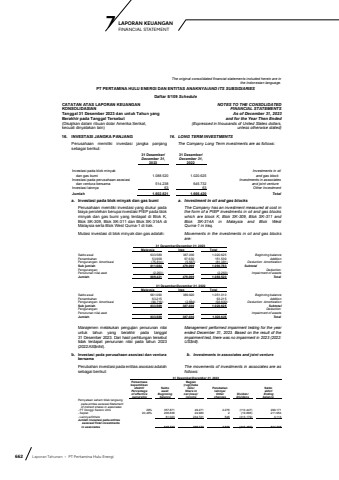 662 Laporan Tahunan %u2022 PT Pertamina Hulu EnergiLAPORAN KEUANGAN 7 FINANCIAL STATEMENTThe original consolidated financial statements included herein are in the Indonesian language.PT PERTAMINA HULU ENERGI DAN ENTITAS ANAKNYA/AND ITS SUBSIDIARIESDaftar 5/109 ScheduleCATATAN ATAS LAPORAN KEUANGANKONSOLIDASIANTanggal 31 Desember 2023 dan untuk Tahun yang Berakhir pada Tanggal Tersebut(Disajikan dalam ribuan dolar Amerika Serikat,kecuali dinyatakan lain)NOTES TO THE CONSOLIDATEDFINANCIAL STATEMENTSAs of December 31, 2023and for the Year Then Ended(Expressed in thousands of United States dollars,unless otherwise stated)16. INVESTASI JANGKA PANJANG 16. LONG TERM INVESTMENTS Perusahaan memiliki investasi jangka panjang sebagai berikut:The Company Long Term investments are as follows:31 Desember/ 31 Desember/December 31, December 31,2023 2022Investasi pada blok minyak Investments in oil dan gas bumi 1.088.520 1.020.625 and gas blockInvestasi pada perusahaan asosiasi Investments in associates dan ventura bersama 514.238 645.732 and joint ventureInvestasi lainnya 63 63 Other InvestmentJumlah 1.602.821 1.666.420 Totala. Investasi pada blok minyak dan gas bumi a. Investment in oil and gas blocksPerusahaan memiliki investasi yang diukur pada biaya perolehan berupa investasi PIEP pada blok minyak dan gas bumi yang terdapat di Blok K, Blok SK-309, Blok SK-311 dan Blok SK-314A di Malaysia serta Blok West Qurna-1 di Irak.The Company has an investment measured at cost in the form of a PIEP investments in oil and gas blocks which are block K, Blok SK-309, Blok SK-311 andBlok SK-314A in Malaysia and Blok West Qurna-1 in Iraq.Mutasi investasi di blok minyak dan gas adalah: Movements in the investments in oil and gas blocks are: _________ 31 Desember/December 31, 2023__Malaysia Iraq TotalSaldo awal 633.589 387.036 1.020.625 Beginning balancePenambahan 53.909 97.630 151.539 AdditionPengurangan: Amortisasi (75.814) (5.567) (81.381) Deduction: AmortizationSub jumlah 611.684 479.099 1.090.783 SubtotalPengurangan: Deduction:Penurunan nilai aset (2.263) - (2.263) Impairment of assetsJumlah 609.421 479.099 1.088.520 Total31 Desember/December 31, 2022Malaysia Iraq TotalSaldo awal 661.090 389.920 1.051.010 Beginning balancePenambahan 63.215 - 63.215 AdditionPengurangan: Amortisasi (90.716) (2.884) (93.600) Deduction: AmortizationSub jumlah 633.589 387.036 1.020.625 SubtotalPengurangan: Deduction:Penurunan nilai aset - - - Impairment of assetsJumlah 633.589 387.036 1.020.625 TotalManajemen melakukan pengujian penurunan nilai untuk tahun yang berakhir pada tanggal 31 Desember 2023. Dari hasil perhitungan tersebut tidak terdapat penurunan nilai pada tahun 2023 (2022:AS$nihil).Management performed impairment testing for the year ended December 31, 2023. Based on the result of the impairment test, there was no impairment in 2023 (2022: US$nill).b. Investasi pada perusahaan asosiasi dan venturabersamab. Investments in associates and joint venturePerubahan investasi pada entitas asosiasi adalah sebagai berikut:The movements of investments in associates are as follows:31 Desember/December 31, 2023Persentase Bagiankepemilikan (rugi)/labaefektif/ Saldo neto/ Perubahan SaldoPercentage awal/ Share in lainnya/ akhir/of effective Beginning net (loss)/ Other Dividen/ Endingownership balance income changes Dividens balancePernyataan saham tidak langsungpada entitas asosiasi/Statementof indirect shares in associates- PT Donggi Senoro LNG 29% 357.871 49.471 2.276 (110.447) 299.171- Seplat 20,46% 206.838 24.980 2 (19.866) 211.954- Lainnya/Others 81.023 234.721 548 (313.179) 3.113Jumlah investasi pada entitas asosiasi/Total investments in associates 645.732 309.172 2.826 (443.492) 514.238