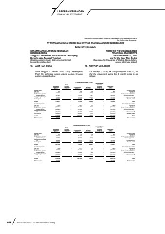 668 Laporan Tahunan %u2022 PT Pertamina Hulu EnergiLAPORAN KEUANGAN 7 FINANCIAL STATEMENTThe original consolidated financial statements included herein are in the Indonesian language.PT PERTAMINA HULU ENERGI DAN ENTITAS ANAKNYA/AND ITS SUBSIDIARIESDaftar 5/115 ScheduleCATATAN ATAS LAPORAN KEUANGANKONSOLIDASIANTanggal 31 Desember 2023 dan untuk Tahun yang Berakhir pada Tanggal Tersebut(Disajikan dalam ribuan dolar Amerika Serikat, kecuali dinyatakan lain)NOTES TO THE CONSOLIDATEDFINANCIAL STATEMENTS As of December 31, 2023and for the Year Then Ended(Expressed in thousands of United States dollars,unless otherwise stated)18. ASET HAK GUNA 18. RIGHT OF USE ASSETPada tanggal 1 Januari 2020, Grup menerapkanPSAK 73, sehingga mutasi selama periode 6 bulan adalah sebagai berikut:On January 1, 2020, the Group adopted SFAS 73, sothat the movement during the 6 month period is asfollows:31 Desember/December 31, 2023 beban dibayarSaldo dimuka/Saldo awal/ transisi/ prepaid Saldo akhir/Beginning Transition Penambahan/ Koreksi/ expense EndingBalance balance Additions Correction reclassifications balanceBiaya perolehan Acquisition costsHak tanah 505 - 188 (148 ) - 545 Land rightsBangunan 141.996 - 3.177 (6.960 ) - 138.213 BuildingsTanki, instalasi pipa dan Tanks, pipeline installationsperalatan lainnya 427.503 - 10.104 7.447 - 445.054 and other equipmentKapal terbang dan kapallaut 342.589 - (36.852 ) (33.675 ) - 272.062 Ships and aircraftAset bergerak 263.614 - 14.493 891 - 278.998 Moveable assetsJumlah 1.176.207 - (8.890 ) (32.445 ) - 1.134.872 TotalAkumulasi depresiasi Accumulated depreciation Hak tanah (340) - (181 ) 152 - (369 ) Land rightsBangunan (103.261) - (19.701 ) 7.117 - (115.845 ) BuildingsTanki, instalasi pipa dan Tanks, pipeline installationsperalatan lainnya (356.283) - (33.866 ) 55 - (390.094 ) and other equipmentKapal terbang dan kapallaut (221.743) - (27.882 ) 33.770 - (215.855 ) Ships and aircraftAset bergerak (164.093) - (46.380 ) 1.143 - (209.330 ) Moveable assetsJumlah (845.720) - (128.010 ) 42.237 - (931.493 ) TotalNilai buku neto 330.487 203.379 Net book value 31 Desember/December 31, 2022beban dibayarSaldo dimuka/Saldo awal/ transisi/ prepaid Saldo akhir/Beginning Transition Penambahan/ Koreksi/ expense EndingBalance balance Additions Correction reclassifications balanceBiaya perolehan Acquisition costsHak tanah 570 - 70 (135 ) - 505 Land rightsBangunan 103.619 - 38.207 170 - 141.996 BuildingsTanki, instalasi pipa dan Tanks, pipeline installationsperalatan lainnya 407.290 - 29.322 (9.109 ) - 427.503 and other equipmentKapal terbang dan kapallaut 306.306 - 49.023 (12.740 ) - 342.589 Ships and aircraftAset bergerak 239.610 - 62.867 (38.863 ) - 263.614 Moveable assetsJumlah 1.057.395 - 179.489 (60.677 ) - 1.176.207 TotalAkumulasi depresiasi Accumulated depreciation Hak tanah (282) - (177 ) 119 - (340 ) Land rightsBangunan (79.208) - (24.433 ) 380 - (103.261 ) BuildingsTanki, instalasi pipa dan Tanks, pipeline installationsperalatan lainnya (325.465) - (30.542 ) (276 ) - (356.283 ) and other equipmentKapal terbang dan kapallaut (172.416) - (60.178 ) 10.851 - (221.743 ) Ships and aircraftAset bergerak (145.735) - (52.452 ) 34.094 - (164.093 ) Moveable assetsJumlah (723.106) - (167.782 ) 45.168 - (845.720 ) TotalNilai buku neto 334.289 330.487 Net book value