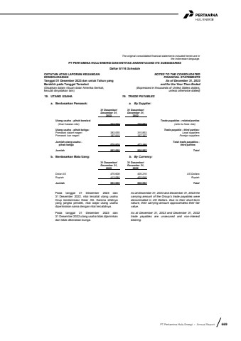 PT Pertamina Hulu Energi %u2022 Annual Report 669The original consolidated financial statements included herein are in the Indonesian language.PT PERTAMINA HULU ENERGI DAN ENTITAS ANAKNYA/AND ITS SUBSIDIARIESDaftar 5/116 ScheduleCATATAN ATAS LAPORAN KEUANGANKONSOLIDASIANTanggal 31 Desember 2023 dan untuk Tahun yang Berakhir pada Tanggal Tersebut(Disajikan dalam ribuan dolar Amerika Serikat,kecuali dinyatakan lain)NOTES TO THE CONSOLIDATEDFINANCIAL STATEMENTSAs of December 31, 2023and for the Year Then Ended(Expressed in thousands of United States dollars,unless otherwise stated)19. UTANG USAHA 19. TRADE PAYABLESa. Berdasarkan Pemasok: a. By Supplier:31 Desember/ 31 Desember/December 31, December 31,2023 2022Utang usaha - pihak berelasi Trade payables - related parties(lihat Catatan 44e) 312.718 335.682 (refer to Note 44e)Utang usaha - pihak ketiga: Trade payable - third parties:Pemasok dalam negeri 383.055 315.853 Local suppliersPemasok luar negeri 187.915 157.327 Foreign suppliersJumlah utang usaha - Total trade payables -pihak ketiga 570.970 473.180 third partiesJumlah 883.688 808.862 Totalb. Berdasarkan Mata Uang: b. By Currency:31 Desember/ 31 Desember/December 31, December 31,2023 2022Dolar AS 470.608 405.216 US DollarsRupiah 413.080 403.646 RupiahJumlah 883.688 808.862 TotalPada tanggal 31 Desember 2023 dan31 Desember 2022, nilai tercatat utang usahaGrup berdominasi Dolar AS. Karena sifatnya yang jangka pendek, nilai wajar utang usahadiperkirakan sama dengan nilai tercatatnya.Pada tanggal 31 Desember 2023 dan 31 Desember 2022 utang usaha tidak dijaminkan dan tidak dikenakan bunga.As at December 31, 2023 and December 31, 2022 the carrying amount of the Group%u2019s trade payables were denominated in US Dollars. Due to their short-term nature, their carrying amount approximates their fair value.As at December 31, 2023 and December 31, 2022trade payables are unsecured and non-interestbearing.