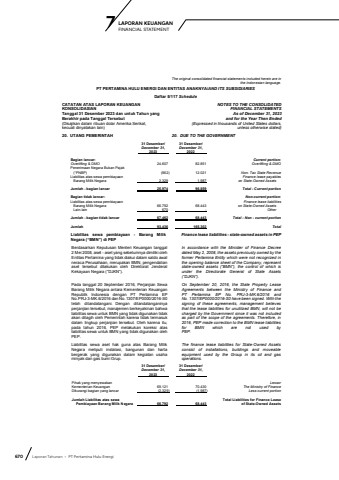 670 Laporan Tahunan %u2022 PT Pertamina Hulu EnergiLAPORAN KEUANGAN 7 FINANCIAL STATEMENTThe original consolidated financial statements included herein are in the Indonesian language.PT PERTAMINA HULU ENERGI DAN ENTITAS ANAKNYA/AND ITS SUBSIDIARIESDaftar 5/117 ScheduleCATATAN ATAS LAPORAN KEUANGANKONSOLIDASIANTanggal 31 Desember 2023 dan untuk Tahun yang Berakhir pada Tanggal Tersebut(Disajikan dalam ribuan dolar Amerika Serikat, kecuali dinyatakan lain)NOTES TO THE CONSOLIDATEDFINANCIAL STATEMENTS As of December 31, 2023and for the Year Then Ended(Expressed in thousands of United States dollars,unless otherwise stated)20. UTANG PEMERINTAH 20. DUE TO THE GOVERNMENT31 Desember/ 31 Desember/December 31, December 31, 2023 2022Bagian lancar: Current portion:Overlifting & DMO 24.607 82.851 Overlifting & DMOPenerimaan Negara Bukan Pajak(%u201cPNBP) (962) 12.021 Non- Tax State RevenueLiabilitas atas sewa pembiayaan Finance lease payables Barang Milik Negara 2.329 1.987 on State-Owned Assets Jumlah - bagian lancar 25.974 96.859 Total - Current portionBagian tidak lancar: Non-current portion:Liabilitas atas sewa pembiayaan Finance lease liabilities Barang Milik Negara 66.792 68.443 on State-Owned AssetsLain-lain 670 - OtherJumlah - bagian tidak lancar 67.462 68.443 Total - Non - current portionJumlah 93.436 165.302 TotalLiabilitas sewa pembiayaan - Barang MilikNegara (%u201cBMN%u201d) di PEPFinance lease liabilities - state-owned assets in PEPBerdasarkan Keputusan Menteri Keuangan tanggal 2 Mei 2008, aset - aset yang sebelumnya dimiliki oleh Entitas Pertamina yang tidak diakui dalam saldo awal neraca Perusahaan, merupakan BMN, pengendalian aset tersebut dilakukan oleh Direktorat Jenderal Kekayaan Negara (%u201cDJKN%u201d).In accordance with the Minister of Finance Decree dated May 2, 2008, the assets previously owned by the former Pertamina Entity which were not recognized in the opening balance sheet of the Company, represent state-owned assets (%u201cBMN%u201d), the control of which is under the Directorate General of State Assets (%u201cDJKN%u201d).Pada tanggal 20 September 2016, Perjanjian Sewa Barang Milik Negara antara Kementerian Keuangan Republik Indonesia dengan PT Pertamina EP No.PRJ-3-MK.6/2016 danNo.1307/EP0000/2016-S0 telah ditandatangani. Dengan ditandatanganinya perjanjian tersebut, manajemen berkeyakinan bahwa liabilitas sewa untuk BMN yang tidak digunakan tidak akan ditagih oleh Pemerintah karena tidak termasuk dalam lingkup perjanjian tersebut. Oleh karena itu, pada tahun 2016, PEP melakukan koreksi atas liabilitas sewa untuk BMN yang tidak digunakan olehPEP.On September 20, 2016, the State Property Lease Agreements between the Ministry of Finance and PT Pertamina EP No. PRJ-3-MK.6/2016 and No. 1307/EP0000/2016-S0 have been signed. With the signing of these agreements, management believes that the lease liabilities for unutilized BMN, will not be charged by the Government since it was not included as part of the scope of the agreements. Therefore, in 2016, PEP made correction to the BMN lease liabilitiesfor BMN which are not used by PEP.Liabilitas sewa aset hak guna atas Barang Milik Negara meliputi instalasi, bangunan dan harta bergerak yang digunakan dalam kegiatan usaha minyak dan gas bumi Grup.The finance lease liabilities for State-Owned Assets consist of installations, buildings and moveableequipment used by the Group in its oil and gas operations.31 Desember/ 31 Desember/December 31, December 31, 2023 2022Pihak yang menyewakan LessorKementerian Keuangan 69.121 70.430 The Ministry of FinanceDikurangi bagian yang lancar (2.329) (1.987) Less current portionJumlah Liabilitas atas sewa Total Liabilities for Finance Lease Pembiayaan Barang Milik Negara 66.792 68.443 of State-Owned Assets