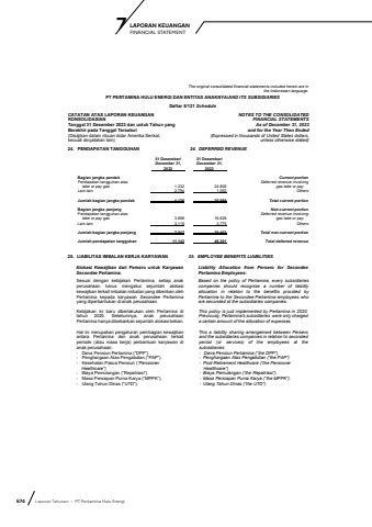 674 Laporan Tahunan %u2022 PT Pertamina Hulu EnergiLAPORAN KEUANGAN 7 FINANCIAL STATEMENTThe original consolidated financial statements included herein are in the Indonesian language.PT PERTAMINA HULU ENERGI DAN ENTITAS ANAKNYA/AND ITS SUBSIDIARIESDaftar 5/121 ScheduleCATATAN ATAS LAPORAN KEUANGANKONSOLIDASIANTanggal 31 Desember 2023 dan untuk Tahun yang Berakhir pada Tanggal Tersebut(Disajikan dalam ribuan dolar Amerika Serikat, kecuali dinyatakan lain)NOTES TO THE CONSOLIDATEDFINANCIAL STATEMENTS As of December 31, 2023and for the Year Then Ended(Expressed in thousands of United States dollars,unless otherwise stated)24. PENDAPATAN TANGGUHAN 24. DEFERRED REVENUE31 Desember/ 31 Desember/December 31, December 31, 2023 2022Bagian jangka pendek Current portionPendapatan tangguhan atas Deferred revenue involvingtake or pay gas 1.332 24.806 gas take or payLain-lain 2.794 1.092 OthersJumlah bagian jangka pendek 4.126 25.898 Total current portionBagian jangka panjang Non-current portionPendapatan tangguhan atas Deferred revenue involvingtake or pay gas 3.898 16.628 gas take or payLain-lain 3.119 3.775 OthersJumlah bagian jangka panjang 7.017 20.403 Total non-current portionJumlah pendapatan tangguhan 11.143 46.301 Total deferred revenue25. LIABILITAS IMBALAN KERJA KARYAWAN 25. EMPLOYEE BENEFITS LIABILITIES Alokasi Kewajiban dari Persero untuk Karyawan Secondee Pertamina:Sesuai dengan kebijakan Pertamina, setiap anakperusahaan harus mengakui sejumlah alokasikewajiban terkait imbalan-imbalan yang diberikan oleh Pertamina kepada karyawan Secondee Pertamina yang diperbantukan di anak perusahaan.Liability Allocation from Persero for SecondeePertamina Employees:Based on the policy of Pertamina, every subsidiariescompanies should recognize a number of liabilityallocation in relation to the benefits provided byPertamina to the Secondee Pertamina employees whoare seconded at the subsidiaries companies.Kebijakan ini baru diberlakukan oleh Pertamina ditahun 2020. Sebelumnya, anak perusahaanPertamina hanya dibebankan sejumlah alokasi beban.Hal ini merupakan pengaturan pembagian kewajibanantara Pertamina dan anak perusahaan terkaitperiode (atau masa kerja) perbantuan karyawan dianak perusahaan:- Dana Pensiun Pertamina (%u201cDPP%u201d).- Penghargaan Atas Pengabdian (%u201cPAP%u201d).- Kesehatan Pasca Pensiun (%u201cPensionerHealthcare%u201d)- Biaya Pemulangan (%u201cRepatriasi%u201d).- Masa Persiapan Purna Karya (%u201cMPPK%u201d).- Ulang Tahun Dinas (%u201cUTD%u201d).This policy is just implemented by Pertamina in 2020.Previously, Pertamina's subsidiaries were only charged a certain amount of the allocation of expenses.This a liability sharing arrangement between Perseroand the subsidiaries companies in relation to seconded period (or services) of the employees at thesubisidiaries:- Dana Pensiun Pertamina (%u201cthe DPP%u201d).- Penghargaan Atas Pengabdian (%u201cthe PAP%u201d)- Post-Retirement Healthcare (%u201cthe PensionerHealthcare%u201d)- Biaya Pemulangan (%u201cthe Repatriasi%u201d).- Masa Persiapan Purna Karya (%u201cthe MPPK%u201d).- Ulang Tahun Dinas (%u201cthe UTD%u201d)