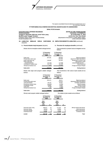 678 Laporan Tahunan %u2022 PT Pertamina Hulu EnergiLAPORAN KEUANGAN 7 FINANCIAL STATEMENTThe original consolidated financial statements included herein are in the Indonesian language.PT PERTAMINA HULU ENERGI DAN ENTITAS ANAKNYA/AND ITS SUBSIDIARIESDaftar 5/125 ScheduleCATATAN ATAS LAPORAN KEUANGANKONSOLIDASIANTanggal 31 Desember 2023 dan untuk Tahun yang Berakhir pada Tanggal Tersebut(Disajikan dalam ribuan dolar Amerika Serikat, kecuali dinyatakan lain)NOTES TO THE CONSOLIDATEDFINANCIAL STATEMENTS As of December 31, 2023and for the Year Then Ended(Expressed in thousands of United States dollars,unless otherwise stated)25. LIABILITAS IMBALAN KERJA KARYAWAN(lanjutan)25. EMPLOYEE BENEFITS LIABILITIES (continued)b. Provisi imbalan kerja karyawan (lanjutan) b. Provision for employee benefits (continued)Mutasi nilai kini kewajiban adalah sebagai berikut: The movements in present value of obligation are as follows:31 Desember/ 31 Desember/December 31, December 31, 2023 2022Saldo awal 557.225 308.948 Beginning balancePenyesuaian saldo awal - 218.109 Adjustment beginning balanceDiakui pada laba rugi 125.528 105.160 Recognized in profit or lossDiakui pada laba Recognized in otherkomprehensif lain (12.104) (17.709) comprehensive incomePembayaran imbalan kerja (34.703) (39.392) Benefit paymentDampak perubahan kurs (154) (17.891) Foreign exchange changesSaldo akhir 635.792 557.225 Ending balanceMutasi nilai wajar aset program adalah sebagai berikut:The movements in fair value of plan assets are as follows:31 Desember/ 31 Desember/December 31, December 31, 2023 2022Saldo awal 293.410 99.011 Beginning balancePenyesuaian saldo awal - 174.414 Adjustment beginning balanceIuran perusahaan 55.122 20.707 Company contributionPerubahan imbalan kerja (34.620) (5.786) Benefit changesPendapatan bunga 20.868 19.646 Interest incomeImbal hasil (5.798) (7.523) Return on plan assetsDampak perubahan kurs 170 (7.059) Foreign exchange changesSaldo akhir 329.152 293.410 Ending balanceRincian aset program adalah sebagai berikut: The details of plan assets are as follows:31 Desember/ 31 Desember/December 31, December 31, 2023 2022Nilai NilaiWajar/ Wajar/Fair Fairvalue % value % Instrumen pasar uang 185.277 57 171.437 58 Money market instrumentsInstrumen utang 95.658 29 90.690 31 Debt instrumentsInstrumen ekuitas 27.327 8 16.787 6 Equity instrumentsInvestment funds 20.890 6 14.496 5 Investment fundsJumlah 329.152 100 293.410 100 Total