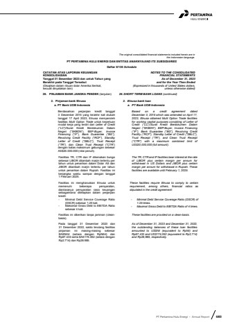 PT Pertamina Hulu Energi %u2022 Annual Report 683The original consolidated financial statements included herein are in the Indonesian language.PT PERTAMINA HULU ENERGI DAN ENTITAS ANAKNYA/AND ITS SUBSIDIARIESDaftar 5/130 ScheduleCATATAN ATAS LAPORAN KEUANGANKONSOLIDASIANTanggal 31 Desember 2023 dan untuk Tahun yang Berakhir pada Tanggal Tersebut(Disajikan dalam ribuan dolar Amerika Serikat,kecuali dinyatakan lain)NOTES TO THE CONSOLIDATEDFINANCIAL STATEMENTSAs of December 31, 2023and for the Year Then Ended(Expressed in thousands of United States dollars,unless otherwise stated)26. PINJAMAN BANK JANGKA PENDEK (lanjutan) 26. SHORT TERM BANK LOANS (continued)2. Pinjaman bank Elnusa 2. Elnusa bank loana. PT Bank UOB Indonesia a. PT Bank UOB IndonesiaBerdasarkan perjanjian kredit tanggal 3 Desember 2015 yang terakhir kali diubah tanggal 17 April 2023, Elnusa memperoleh fasilitas Multi Option Trade untuk keperluan modal kerja yang terdiri dari Letter of Credit (%u201cLC%u201d)/Surat Kredit Berdokumen Dalam Negeri (%u201cSKBDN%u201d), BEP-Buyer, Invoice Financing (%u201cIF%u201d), Bank Guarantee (%u201cBG%u201d), Revolving Credit Facility (%u201cRCF%u201d), Standby Letter of Credit (%u201cSBLC%u201d), Trust Receipt (%u201cTR%u201d), dan Clean Trust Receipt (%u201cCTR%u201d) dengan batas maksimum gabungan sebesar AS$20.000.000 (nilai penuh).Based on a credit agreement dated December 3, 2015 which was amended on April 17, 2023, Elnusa obtained Multi Option Trade facilities for working capital purposes consisting of Letter of Credit (%u201cLC%u201d)/Surat Kredit Berdokumen Dalam Negeri (%u201cSKBDN%u201d), BEP-Buyer, Invoice Financing (%u201cIF%u201d), Bank Guarantee (%u201cBG%u201d), Revolving Credit Facility (%u201cRCF%u201d), Standby Letter of Credit (%u201cSBLC%u201d), Trust Receipt (%u201cTR%u201d), and Clean Trust Receipt (%u201cCTR%u201d) with a maximum combined limit of US$20,000,000 (full amount).Fasilitas TR, CTR dan IF dikenakan bunga sebesar LIBOR ditambah marjin tertentu per tahun untuk penarikan dalam Dolar AS dan JIBOR ditambah marjin tertentu per tahun untuk penarikan dalam Rupiah. Fasilitas ini berjangka waktu sampai dengan tanggal 1 Februari 2025.The TR, CTR and IF facilities bear interest at the rate of LIBOR plus certain margin per annum for withdrawal in US Dollars and JIBOR plus certain margin per annum for withdrawal in Rupiah. These facilities are available until February 1, 2025.Fasilitas ini mengharuskan Elnusa untuk memenuhi beberapa persyaratan, diantaranya persyaratan rasio keuangan sebagaimana ditetapkan dalam perjanjian kredit:- Minimal Debt Service Coverage Ratio(DSCR) sebesar 1,25 kali.- Maksimal Gross Debt to EBITDA Ratio sebesar 4 kali.Fasilitas ini diberikan tanpa jaminan (cleanbasis).These facilities require Elnusa to comply to certain requirement, among others, financial ratios as stipulated in the credit agreement:- Minimal Debt Service Coverage Ratio (DSCR) of 1.25 times.- Maximal Gross Debt to EBITDA Ratio of 4 times.These facilities are provided on a clean-basis.Pada tanggal 31 Desember 2023 dan 31 Desember 2022, saldo terutang fasilitas pinjaman ini masing-masing sebesar $ASNihil (setara dengan RpNihil) dan Rp67.433 serta $AS174.052 (setara dengan Rp2.714) dan Rp28.985.As of December 31, 2023 and December 31, 2022, the outstanding balances of these loan facilities amounted to US$Nil (equivalent to RpNil) and Rp67,433 and US$174,052 (equivalent to Rp2,714) and Rp28,985, respectively.