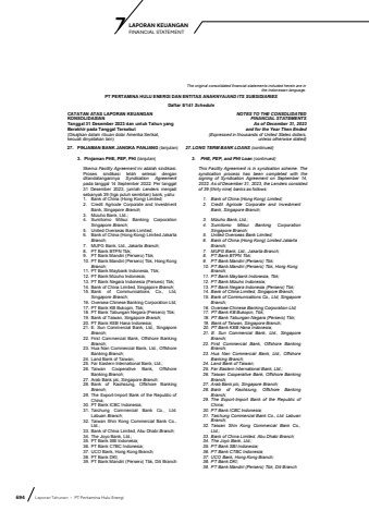 694 Laporan Tahunan %u2022 PT Pertamina Hulu EnergiLAPORAN KEUANGAN 7 FINANCIAL STATEMENTThe original consolidated financial statements included herein are in the Indonesian language.PT PERTAMINA HULU ENERGI DAN ENTITAS ANAKNYA/AND ITS SUBSIDIARIESDaftar 5/141 ScheduleCATATAN ATAS LAPORAN KEUANGANKONSOLIDASIANTanggal 31 Desember 2023 dan untuk Tahun yang Berakhir pada Tanggal Tersebut(Disajikan dalam ribuan dolar Amerika Serikat, kecuali dinyatakan lain)NOTES TO THE CONSOLIDATEDFINANCIAL STATEMENTS As of December 31, 2023and for the Year Then Ended(Expressed in thousands of United States dollars,unless otherwise stated)27. PINJAMAN BANK JANGKA PANJANG (lanjutan) 27.LONG TERM BANK LOANS (continued)3. Pinjaman PHE, PEP, PHI (lanjutan) 3. PHE, PEP, and PHI Loan (continued)Skema Facility Agreement ini adalah sindikasi.Proses sindikasi telah selesai denganditandatanganinya Syndication Agreementpada tanggal 14 September 2022. Per tanggal31 Desember 2023, jumlah Lenders menjadi sebanyak 39 (tiga puluh sembilan) bank, yaitu:1. Bank of China (Hong Kong) Limited;2. Credit Agricole Corporate and InvestmentBank, Singapore Branch; 3. Mizuho Bank, Ltd.; 4. Sumitomo Mitsui Banking CorporationSingapore Branch; 5. United Overseas Bank Limited;6. Bank of China (Hong Kong) Limited Jakarta Branch; 7. MUFG Bank, Ltd., Jakarta Branch; 8. PT Bank BTPN Tbk;9. PT Bank Mandiri (Persero) Tbk;10. PT Bank Mandiri (Persero) Tbk, Hong Kong Branch; 11. PT Bank Maybank Indonesia, Tbk;12. PT Bank Mizuho Indonesia;13. PT Bank Negara Indonesia (Persero) Tbk;14. Bank of China Limited, Singapore Branch; 15. Bank of Communications Co., Ltd,Singapore Branch; 16. Oversea-Chinese Banking Corporation Ltd;17. PT Bank KB Bukopin, Tbk;18. PT Bank Tabungan Negara (Persero) Tbk;19. Bank of Taiwan, Singapore Branch; 20. PT Bank KEB Hana Indonesia;21. E. Sun Commercial Bank, Ltd., SingaporeBranch; 22. First Commercial Bank, Offshore BankingBranch; 23. Hua Nan Commercial Bank, Ltd., OffshoreBanking Branch; 24. Land Bank of Taiwan;25. Far Eastern International Bank, Ltd.;26. Taiwan Cooperative Bank, OffshoreBanking Branch; 27. Arab Bank plc, Singapore Branch; 28. Bank of Kaohsiung, Offshore BankingBranch; 29. The Export-Import Bank of the Republic ofChina;30. PT Bank ICBC Indonesia;31. Taichung Commercial Bank Co., Ltd.Labuan Branch; 32. Taiwan Shin Kong Commercial Bank Co.,Ltd.;33. Bank of China Limited, Abu Dhabi Branch; 34. The Joyo Bank, Ltd.;35. PT Bank SBI Indonesia;36. PT Bank CTBC Indonesia;37. UCO Bank, Hong Kong Branch;38. PT Bank DKI;39. PT Bank Mandiri (Persero) Tbk, Dili BranchThis Facility Agreement is in syndication scheme. Thesyndication process has been completed with thesigning of Syndication Agreement on September 14,2022. As of December 31, 2023, the Lenders consistedof 39 (thirty nine) banks as follows:1. Bank of China (Hong Kong) Limited;2. Credit Agricole Corporate and InvestmentBank, Singapore Branch;3. Mizuho Bank, Ltd.;4. Sumitomo Mitsui Banking CorporationSingapore Branch;5. United Overseas Bank Limited;6. Bank of China (Hong Kong) Limited JakartaBranch;7. MUFG Bank, Ltd., Jakarta Branch;8. PT Bank BTPN Tbk;9. PT Bank Mandiri (Persero) Tbk;10. PT Bank Mandiri (Persero) Tbk, Hong KongBranch;11. PT Bank Maybank Indonesia, Tbk;12. PT Bank Mizuho Indonesia;13. PT Bank Negara Indonesia (Persero) Tbk;14. Bank of China Limited, Singapore Branch;15. Bank of Communications Co., Ltd, SingaporeBranch;16. Oversea-Chinese Banking Corporation Ltd;17. PT Bank KB Bukopin, Tbk;18. PT Bank Tabungan Negara (Persero) Tbk;19. Bank of Taiwan, Singapore Branch;20. PT Bank KEB Hana Indonesia;21. E. Sun Commercial Bank, Ltd., Singapore Branch;22. First Commercial Bank, Offshore BankingBranch;23. Hua Nan Commercial Bank, Ltd., OffshoreBanking Branch;24. Land Bank of Taiwan;25. Far Eastern International Bank, Ltd.;26. Taiwan Cooperative Bank, Offshore BankingBranch;27. Arab Bank plc, Singapore Branch;28. Bank of Kaohsiung, Offshore Banking Branch;29. The Export-Import Bank of the Republic of China;30. PT Bank ICBC Indonesia;31. Taichung Commercial Bank Co., Ltd. LabuanBranch;32. Taiwan Shin Kong Commercial Bank Co.,Ltd.;33. Bank of China Limited, Abu Dhabi Branch;34. The Joyo Bank, Ltd.;35. PT Bank SBI Indonesia;36. PT Bank CTBC Indonesia;37. UCO Bank, Hong Kong Branch;38. PT Bank DKI; 39. PT Bank Mandiri (Persero) Tbk, Dili Branch