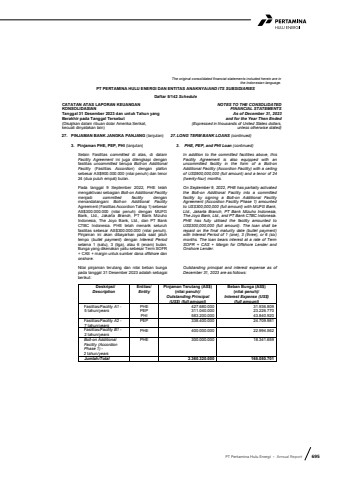 PT Pertamina Hulu Energi %u2022 Annual Report 695The original consolidated financial statements included herein are in the Indonesian language.PT PERTAMINA HULU ENERGI DAN ENTITAS ANAKNYA/AND ITS SUBSIDIARIESDaftar 5/142 ScheduleCATATAN ATAS LAPORAN KEUANGANKONSOLIDASIANTanggal 31 Desember 2023 dan untuk Tahun yang Berakhir pada Tanggal Tersebut(Disajikan dalam ribuan dolar Amerika Serikat,kecuali dinyatakan lain)NOTES TO THE CONSOLIDATEDFINANCIAL STATEMENTSAs of December 31, 2023and for the Year Then Ended(Expressed in thousands of United States dollars,unless otherwise stated)27. PINJAMAN BANK JANGKA PANJANG (lanjutan) 27.LONG TERM BANK LOANS (continued)3. Pinjaman PHE, PEP, PHI (lanjutan) 3. PHE, PEP, and PHI Loan (continued)Selain Fasilitas committed di atas, di dalam Facility Agreement ini juga dilengkapi dengan fasilitas uncommitted berupa Bolt-on Additional Facility (Fasilitas Accordion) dengan plafon sebesar AS$900.000.000 (nilai penuh) dan tenor 24 (dua puluh empat) bulan.In addition to the committed facilities above, this Facility Agreement is also equipped with an uncommitted facility in the form of a Bolt-on Additional Facility (Accordion Facility) with a ceiling of US$900,000,000 (full amount) and a tenor of 24 (twenty-four) months.Pada tanggal 9 September 2022, PHE telah mengaktivasi sebagian Bolt-on Additional Facility menjadi committed facility dengan menandatangani Bolt-on Additional Facility Agreement (Fasilitas Accordion Tahap 1) sebesar AS$300.000.000 (nilai penuh) dengan MUFGBank, Ltd., Jakarta Branch, PT Bank Mizuho Indonesia, The Joyo Bank, Ltd., dan PT Bank CTBC Indonesia. PHE telah menarik seluruh fasilitas sebesar AS$300.000.000 (nilai penuh). Pinjaman ini akan dibayarkan pada saat jatuh tempo (bullet payment) dengan Interest Periodselama 1 (satu), 3 (tiga), atau 6 (enam) bulan. Bunga yang dikenakan yaitu sebesar Term SOFR + CAS + margin untuk sumber dana offshore dan onshore.On September 9, 2022, PHE has partially activated the Bolt-on Additional Facility into a committed facility by signing a Bolt-on Additional Facility Agreement (Accordion Facility Phase 1) amounted to US$300,000,000 (full amount) with MUFG Bank, Ltd., Jakarta Branch, PT Bank Mizuho Indonesia, The Joyo Bank, Ltd., and PT Bank CTBC Indonesia. PHE has fully utilised the facility amounted to US$300,000,000 (full amount). The loan shall be repaid on the final maturity date (bullet payment) with Interest Period of 1 (one), 3 (three), or 6 (six) months. The loan bears interest at a rate of Term SOFR + CAS + Margin for Offshore Lender and Onshore Lender.Nilai pinjaman terutang dan nilai beban bunga pada tanggal 31 Desember 2023 adalah sebagai berikut:Outstanding principal and interest expense as of December 31, 2023 are as follows:Deskripsi/DescriptionEntitas/ EntityPinjaman Terutang (AS$)(nilai penuh)/Outstanding Principal (US$) (full amount)Beban Bunga (AS$) (nilai penuh)/Interest Expense (US$)(full amount)Fasilitas/Facility A1 -5 tahun/yearsPHEPEPPHI427.680.000311.040.000583.200.00031.936.809 23.226.770 43.840.920Fasilitas/Facility A2 -7 tahun/yearsPEP 338.400.000 24.709.981 Fasilitas/Facility B1 -2 tahun/yearsPHE 400.000.000 22.994.562Bolt-on Additional Facility (Accordion Phase 1) - 2 tahun/yearsPHE 300.000.000 18.341.659Jumlah/Total 2.360.320.000 165.050.701