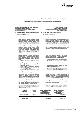 PT Pertamina Hulu Energi %u2022 Annual Report 697The original consolidated financial statements included herein are in the Indonesian language.PT PERTAMINA HULU ENERGI DAN ENTITAS ANAKNYA/AND ITS SUBSIDIARIESDaftar 5/144 ScheduleCATATAN ATAS LAPORAN KEUANGANKONSOLIDASIANTanggal 31 Desember 2023 dan untuk Tahun yang Berakhir pada Tanggal Tersebut(Disajikan dalam ribuan dolar Amerika Serikat,kecuali dinyatakan lain)NOTES TO THE CONSOLIDATEDFINANCIAL STATEMENTSAs of December 31, 2023and for the Year Then Ended(Expressed in thousands of United States dollars,unless otherwise stated)27. PINJAMAN BANK JANGKA PANJANG (lanjutan) 27. LONG TERM BANK LOANS (continued)5. Pinjaman PHE (lanjutan) 5. PHE Loan (continued)Fasilitas A5 Facility A5Batas maksimum Fasilitas A5 adalah sebesar AS$520.000.000 (nilai penuh) dengan tanggal pelunasan terakhir adalah 60 (enam puluh empat) bulan sejak tanggal penarikan pertama. Pinjaman ini akan dibayarkan melalui angsuran (amortized payment) sebanyak 9 (sembilan) kali dimulai di bulan kedua belas sejak tanggal penarikan pertama dengan Interest Periodselama 1 (satu), 3 (tiga) atau 6 (enam) bulan. Bunga yang dikenakan yaitu sebesar Term SOFR + margin 1,25% p.a untuk sumber dana offshore dan Term SOFR + margin 1,35% p.a onshore.Maximum limit of Facility A5 is US$520,000,000 (full amount) with final repayment date of 60 (sixty) months after the first utilisation date. The loan shall be repaid through 9 (nine) semiannual instalment starting 12 (twelve) months from the initial drawdown date with Interest Period of 1 (one), 3 (three) or 6 (six) months. The loan bears interest at a rate of Term SOFR + Margin 1.25% p.a for Offshore Lender and Term SOFR + Margin 1.35% p.a Onshore Lender.Facility Agreement tersebut menimbulkan kewajiban bagi PHE untuk menjaga batasan rasio keuangan secara Grup Konsolidasi sebagaimana ditetapkan dalam perjanjian kredit:- EBITDA Konsolidasi terhadap Utang Bunga Konsolidasi untuk periode perhitungan yang berakhir pada tanggal perhitungan tersebut sama dengan atau lebih besar dari 3,00:1;- Utang Bersih Konsolidasi terhadap Kekayaan Bersih Berwujud sama dengan atau kurang dari 2,00:1;- Kekayaan Bersih Grup Konsolidasi sama dengan atau lebih besar dari AS$8.000.000.000 (nilai penuh).This Facility Agreement requires PHE to meet Financial Covenants on a Group%u2019s Consolidated basis as stipulated in the credit agreement:- Consolidated EBITDA to Consolidated Interest Payable for the calculation period ending on that calculation date is equal to or greater than 3.00:1;- Consolidated Net Debt to Tangible Net Worth is equal to or less than 2.00:1;- Consolidated Group Net Worth is equal to or greater than US$8,000,000,000 (full amount).Pada tanggal 16 Mei 2023, dilakukan pencairan Fasilitas A2 sebesar AS$760.000.000 (nilai penuh), kemudian pada tanggal 5 Oktober 2023 dilakukan pencairan Fasilitas A2 sebesar AS$180.000.000 (nilai penuh) dan setelah dua kali pencairan tersebut Perusahaan mencatat sisa fasilitas yang belum dilakukan pencairan dari Fasilitas A2 sebesar AS$40.000.000 dan dari Fasilitas A5 sebesar AS$520.000.000.Dengan demikian nilai pinjaman terutang dan nilai beban bunga pada tanggal 31 Desember 2023 adalah sebagai berikut:On May 16, 2023, the A2 Facility was withdrawn in the amount of US$760,000,000 (full amount), then in October 5, 2023, the A2 Facility again was withdrawn in the amount of US$180,000,000 (full amount) and after these two withdrawal the Company recorded the remaining undrawn facilities from Facility A2 amounting to US$40,000,000 and from Facility A5 amounting to US$520,000,000.Thus the outstanding loan amount and interest expense as of December 31, 2023 are as follows:Deskripsi/DescriptionEntitas/ EntityPinjaman Terutang (AS$)(nilai penuh)/OutstandingPrincipal (US$) (full amount)Beban Bunga (AS$) (nilai penuh)/Interest Expense (US$)(full amount)Fasilitas/Facility A2 -2 tahun/yearsPHE 940.000.000 32.177.377Jumlah/Total 940.000.000 32.177.377