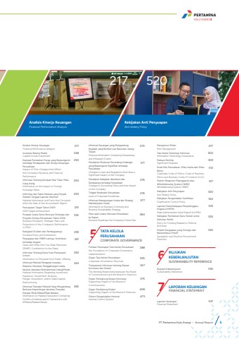 Analisis Kinerja KeuanganFinancial Performance Analysis217Investasi Barang ModalCapital Goods Investment248Dampak Perubahan Harga yang Berpengaruh terhadap Pendapatan dan Kinerja Keuangan PerusahaanImpact of Price Changes that Affect the Company%u2019s Revenue and Financial Performance250Informasi Tentang Dampak Nilai Tukar Mata Uang AsingInformation on the Impact of Foreign Exchange Rates250Informasi dan Fakta Material yang Terjadi Setelah Tanggal Laporan AkuntanMaterial Information and Facts that Occurred After the Date of the Accountant%u2019s Report250Pencapaian Target Tahun 20232023 Target Achievement251Prospek Usaha Serta Rencana Strategis dan Proyeksi Kinerja Perusahaan Tahun 2024Business Prospects, Strategic Plans and Projections of the Company%u2019s Performance in 2024255Kebijakan Dividen dan PembagiannyaDividend Policy and Distribution259Perpajakan dan PNBP Lainnya: Kontribusi terhadap NegaraTaxes and Other Non-Tax State Revenues (PNBP): Contribution to the State261Informasi Tentang Dana Hasil Penawaran UmumInformation on Proceeds from Public offering262Informasi Material Mengenai Investasi, Ekspansi, Divestasi, Penggabungan Usaha, Akuisisi, dan/atau Restrukturisasi Utang/ModalMaterial Information Regarding Investment, Expansion, Divestment, Business Merger, Acquisition, and/or Debt/Capital Restructuring263Informasi Transaksi Material Yang Mengandung Benturan Kepentingan dan/atau Transaksi Dengan Pihak Afiliasi/Pihak BerelasiInformation on Material Transaction Containing Conflict of Interest and/or Transactions with Affiliates/Related Parties265Informasi Keuangan yang Mengandung Kejadian yang Bersifat Luar Biasa dan Jarang TerjadiFinancial Information Containing Extraordinary and Infrequent Events270Perubahan Peraturan Perundang-Undangan yang Berpengaruh Signifikan terhadap PerusahaanChanges in Laws and Regulations that Have a Significant Impact on the Company271Perubahan Kebijakan Akuntansi dan Dampaknya terhadap PerusahaanChanges in Accounting Policy and their Impact on the Company276Tingkat Kesehatan PerusahaanLevel of Corporate Soundness276Informasi Kelangsungan Usaha dan Strategi Keberlanjutan UsahaInformation on Business Continuity and Business Sustainability Strategy277Peta Jalan Usaha: Rencana Perusahaan ke DepanBusiness Roadmap: the Company%u2019s Future Plan2845 TATA KELOLA PERUSAHAAN CORPORATE GOVERNANCEFondasi Penerapan Tata Kelola Perusahaanthe Foundation of Corporate Governance Implementation288Organ Tata Kelola PerusahaanCorporate Governance Structure305Transparansi Informasi tentang Dewan Komisaris dan DireksiThe Working Relationship between the Board of Commissioners and the Board of Directors347Organ Pendukung Dewan KomisarisSupporting Organs of the Board of Commissioners375Organ Pendukung DireksiSupporting Organs of the Board of Directors408Sistem Pengendalian InternalInternal Control System473217Analisis Kinerja KeuanganFinancial Performance Analysis520Kebijakan Anti PenyuapanAnti-bribery PolicyManajemen RisikoRisk Management477Tata Kelola Teknologi InformasiInformation Technology Governance500Perkara PentingSignificant Disputes509Kode Etik Perusahaan: Etika Usaha dan Etika BisnisCorporate Code of Ethics: Code of Business Ethics and Business Code of Conduct (CoC)512Sistem Pelaporan Pelanggaran atau Whistleblowing System (WBS)Whistleblowing System (WBS)517Kebijakan Anti PenyuapanAnti-Bribery Policy520Kebijakan Pengendalian GratifikasiGratification Control Policy522Laporan Harta Kekayaan Penyelenggara Negara (LHKPN)State Administrator Asset Report (LHKPN)523Kebijakan Pemberian Dana Terkait untuk Aktivitas PolitikPolicy for Funding Related to Political Activities524Praktik Pengadaan yang Sinergis dan Berkontribusi PositifSynergistic and Positive Procurement Practices5246 RUJUKANKEBERLANJUTAN SUSTAINABILITY REFERENCERujukan KeberlanjutanSustainability Reference5307 LAPORAN KEUANGANFINANCIAL STATEMENTLaporan KeuanganFinancial Statement537PT Pertamina Hulu Energi %u2022 Annual Report 5