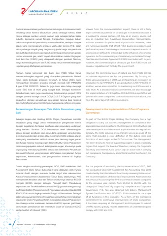 LAPORAN MANAJEMENMANAGEMENT REPORT 2 3 4 5 6 7Dari sisi komersialisasi, potensi komersial migas di Indonesia masih terbilang besar karena dibutuhkan untuk berbagai sektor, tidak hanya sebagai sumber energi, namun juga sebagai bahan bakar industri, konsumsi rumah tangga, transportasi, maupun bahan baku untuk produksi petrokimia, Namun demikian, terdapat banyak aspek yang memengaruhi prospek usaha dan kinerja PHE, salah satunya harga minyak yang bergantung pada harga minyak dunia dan sulit diprekdisi karena pengaruh dinamika perekonomian global, Untuk komersial gas, relatif dapat dikendalikan melalui Perjanjian Jual Beli Gas (PJBG) yang disepakati dengan pembeli, Namun, harga komersial gas bumi dari PJBG tetap harus memertimbangkan regulasi yang ditetapkan pemerintah.Namun, harga komersial gas bumi dari PJBG tetap harus memertimbangkan regulasi yang ditetapkan pemerintah. Melalui fokus pada berbagai program tersebut, di tahun 2024, kami menargetkan kenaikan produksi minyak menjadi 627 MMBOPD & gas 2.769 MMSCFD. Selain itu juga kami akan tetap menjaga score ESG kita di level yang sangat baik. Sebagai komitmen dekarbonisasi, kami juga mendorong terlaksananya project CCS dengan potensi storage untuk CCS/CCUS 7.3 Gigaton yang akan berpartner dengan perusahaan-perusahaan lainnya baik nasional dan multinational yang memiliki target yang sama net zero emission.Perkembangan Penerapan Tata Kelola Perusahaan yang BaikSebagai bagian dari Holding BUMN Migas, Perusahaan memiliki kewajiban yang tinggi untuk melaksanakan pengelolaan bisnis dengan kepatuhan terhadap peraturan dan perundang-undangan yang berlaku. Struktur GCG Perusahaan telah dikembangkan sesuai dengan peraturan dan perundang-undangan yang berlaku. Demikian pula dengan proses atau mekanisme GCG sebagai aturan main yang memberikan definisi secara jelas tentang tugas, peran dan fungsi masing-masing organ dalam struktur GCG. Manajemen telah mengupayakan seluruh kelengkapan organ, khususnya pada organ yang mendukung Direksi, antara lain Sekretaris Perusahaan dan Audit Internal, yang berperan aktif dalam menjalankan fungsi kepatuhan, keterbukaan, dan pengendalian internal di lingkup Perusahaan.Dalam rangka monitoring penerapan GCG, PHE melakukan Self Assessment GCG Tahun Buku 2023 yang dilakukan oleh Fungsi Internal Audit dengan mereviu tindak lanjut atas rekomendasi Area of Improvement Assessment Tahun Buku sebelumnya. PHE memperoleh kenaikan skor dari Tahun sebelumnya sebesar 85.052 menjadi 85.905 dengan kategori \kepatuhan dan Tata Kelola Perusahaan, PHE juga telah mengantongi Sertifikasi Sistem Manajemen Anti Penyuapan yang berstandar ISO 37001:2016 untuk lingkup seluruh Fungsi di Perusahaan. Sebagai salah satu wujud komitmen Perusahaan untuk tetap meningkatkan kepatuhan GCG, Perusahaan telah mewajibkan seluruh Manajemen dan Pekerja untuk melakukan laporan LHKPN, laporan gratifikasi, pernyataan pemahaman dan mematuhi Code of Conduct (COC) serta Conflict of Interest (COI). Viewed from the commercialization aspect, there is still a fairly large commercial potential of oil and gas in Indonesia because it is needed for various sectors, not only as an energy source, but also as industrial fuel, household consumption, transportation, and raw materials for petrochemical production. However, there are numerous aspects that affect PHE%u2019s business prospects and performance, one of them being oil prices which depend on world oil prices and are difficult to predict due to the influence of economic dynamics. As for commercial gas, it is relatively controllable through Gas Sale and Purchase Agreement (PJBG) concluded with buyers; however, the commercial price of natural gas from PJBG must still consider regulations set forth by the government.However, the commercial price of natural gas from PJBG still has to consider regulations set by the government. By focusing on these various programs, in 2024, we are targeting an increase in oil production to 627 MMBOPD & gas production 2,769 MMSCFD. In addition, we are also committed to maintaining our ESG score at a solid level. As a decarbonization commitment, we also encourage the implementation of 7.3 Gigatons CCS & CCUS projects that will partner with other companies, both national and multinational, that have the same target of net zero emissions.Development in the Implementation of Good Corporate GovernanceAs part of the BUMN Migas Holding, the Company has a high obligation to carry out business management in compliance with applicable laws and regulations. The Company%u2019s GCG structure has been developed in accordance with applicable laws and regulations. Similarly, the GCG process or mechanism serves as a rule of the game that provides a clear definition of the duties, roles and functions of each organ in the GCG structure. The Management has been striving to have all supporting organs in place, especially organs that support the Board of Directors, namely the Corporate Secretary and Internal Audit, which play an active role in carrying out compliance, transparency, and internal control functions in the Company.For the purpose of monitoring the implementation of GCG, PHE has conducted GCG Self-Assessment for Accounting Year 2023 conducted by the Internal Audit Function by reviewing follow-up on the recommendations of the Area of Improvement Assessment for the previous Accounting Year. PHE%u2019s score has increased compared to the previous year, namely from 85,052 to 85,905 with the category of %u201cVery Good%u201d. By supporting compliance and Corporate Governance, PHE has also obtained Anti-Bribery Management System Certification with ISO 37001:2016 standard for the scope of all functions in the Company. As a form of the Company%u2019s commitment to continuous improvement of GCG compliance, it has been requiring all Management and Employees to submit LHKPN reports, gratuity reports, statements of understanding and comply with COC and COI.68 Laporan Tahunan %u2022 PT Pertamina Hulu Energi