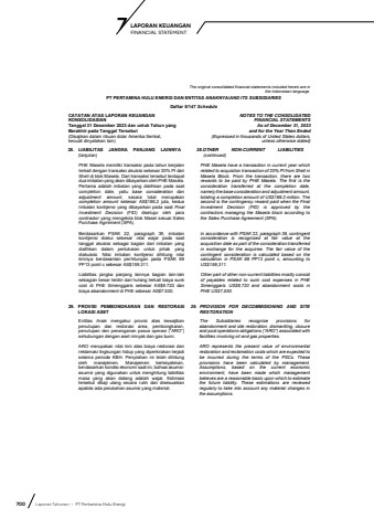 700 Laporan Tahunan %u2022 PT Pertamina Hulu EnergiLAPORAN KEUANGAN 7 FINANCIAL STATEMENTThe original consolidated financial statements included herein are in the Indonesian language.PT PERTAMINA HULU ENERGI DAN ENTITAS ANAKNYA/AND ITS SUBSIDIARIESDaftar 5/147 ScheduleCATATAN ATAS LAPORAN KEUANGANKONSOLIDASIANTanggal 31 Desember 2023 dan untuk Tahun yang Berakhir pada Tanggal Tersebut(Disajikan dalam ribuan dolar Amerika Serikat, kecuali dinyatakan lain)NOTES TO THE CONSOLIDATEDFINANCIAL STATEMENTS As of December 31, 2023and for the Year Then Ended(Expressed in thousands of United States dollars,unless otherwise stated)28. LIABILITAS JANGKA PANJANG LAINNYA(lanjutan)28.OTHER NON-CURRENT LIABILITIES(continued)PHE Masela memiliki transaksi pada tahun berjalanterkait dengan transaksi akuisisi sebesar 20% PI dari Shell di blok Masela. Dari transaksi tersebut terdapatdua imbalan yang akan dibayarkan oleh PHE Masela.Pertama adalah imbalan yang dialihkan pada saatcompletion date, yaitu base consideration danadjustment amount, secara total merupakancompletion amount sebesar AS$186,2 juta, keduaImbalan kontijensi yang dibayarkan pada saat Final Investment Decision (FID) disetujui oleh paracontractor yang mengelola blok Masel sesuai SalesPurchase Agrrement (SPA).PHE Masela have a transaction in current year which related to acquisiton transaction of 20% PI from Shell in Masela Block. From the transaction, there are two rewards to be paid by PHE Masela. The first is the consideration transferred at the completion date, namely the base consideration and adjustment amount, totaling a completion amount of US$186.2 million. The second is the contingency reward paid when the Final Investment Decision (FID) is approved by the contractors managing the Masela block according to the Sales Purchase Agreement (SPA).Berdasarkan PSAK 22, paragraph 39, imbalankontijensi diakui sebesar nilai wajar pada saattanggal akuisisi sebagai bagian dari imbalan yangdialihkan dalam pertukaran untuk pihak yangdiakuisisi. Nilai imbalan kontijensi dihitung nilaikininya berdasarkan perhitungan pada PSAK 68PP13 point c sebesar AS$159.311.In accordance with PSAK 22, paragraph 39, contingent consideration is recognized at fair value at the acquisition date as part of the consideration transferred in exchange for the acquiree. The fair value of the contingent consideration is calculated based on the calculation in PSAK 68 PP13 point c, amounting to US$159,311.Liabilitas jangka panjang lainnya bagian lain-lainsebagian besar terdiri dari hutang terkait biaya sunkcost di PHE Simenggaris sebesar AS$9.720 danbiaya abandonment di PHE sebesar AS$7.530.Other part of other non-current liabilities mostly consist of payables related to sunk cost expenses in PHE Simenggaris US$9,720 and abandonment costs in PHE US$7,530.29. PROVISI PEMBONGKARAN DAN RESTORASI LOKASI ASET29. PROVISION FOR DECOMMISIONING AND SITERESTORATIONEntitas Anak mengakui provisi atas kewajibanpenutupan dan restorasi area, pembongkaran,penutupan dan penanganan pasca operasi (%u201cARO%u201d)sehubungan dengan aset minyak dan gas bumi.The Subsidiaries recognize provisions forabandonment and site restoration, dismantling, closureand post operations obligations (%u201cARO%u201d) associated with facilities involving oil and gas properties.ARO merupakan nilai kini atas biaya restorasi danreklamasi lingkungan hidup yang diperkirakan terjadi selama periode KBH. Penyisihan ini telah dihitungoleh manajemen. Manajemen berkeyakinan,berdasarkan kondisi ekonomi saat ini, bahwa asumsiasumsi yang digunakan untuk menghitung liabilitasmasa yang akan datang adalah wajar. Estimasitersebut dikaji ulang secara rutin dan disesuaikanapabila ada perubahan asumsi yang material.ARO represents the present value of environmentalrestoration and reclamation costs which are expected to be incurred during the terms of the PSCs. Theseprovisions have been calculated by management.Assumptions, based on the current economicenvironment, have been made which managementbelieves are a reasonable basis upon which to estimate the future liability. These estimations are reviewedregularly to take into account any material changes inthe assumptions.