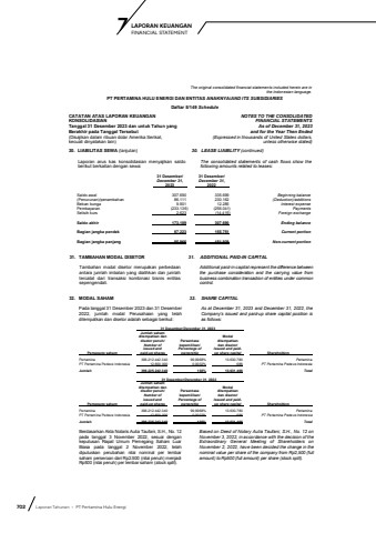 702 Laporan Tahunan %u2022 PT Pertamina Hulu EnergiLAPORAN KEUANGAN 7 FINANCIAL STATEMENTThe original consolidated financial statements included herein are in the Indonesian language.PT PERTAMINA HULU ENERGI DAN ENTITAS ANAKNYA/AND ITS SUBSIDIARIESDaftar 5/149 ScheduleCATATAN ATAS LAPORAN KEUANGANKONSOLIDASIANTanggal 31 Desember 2023 dan untuk Tahun yang Berakhir pada Tanggal Tersebut(Disajikan dalam ribuan dolar Amerika Serikat, kecuali dinyatakan lain)NOTES TO THE CONSOLIDATEDFINANCIAL STATEMENTS As of December 31, 2023and for the Year Then Ended(Expressed in thousands of United States dollars,unless otherwise stated)30. LIABILITAS SEWA (lanjutan) 30. LEASE LIABILITY (continued)Laporan arus kas konsolidasian menyajikan saldoberikut berkaitan dengan sewa:The consolidated statements of cash flows show thefollowing amounts related to leases:31 Desember/ 31 Desember/December 31, December 31, 2023 2022Saldo awal 307.690 335.699 Beginning balance(Penurunan)/penambahan 86.111 230.162 (Deduction)/additionsBeban bunga 9.901 12.285 Interest expensePembayaran (233.136) (256.041) PaymentsSelisih kurs 2.623 (14.415) Foreign exchangeSaldo akhir 173.189 307.690 Ending balanceBagian jangka pendek 87.223 155.751 Current portionBagian jangka panjang 85.966 151.939 Non-current portion31. TAMBAHAN MODAL DISETOR 31. ADDITIONAL PAID-IN CAPITALTambahan modal disetor merupakan perbedaanantara jumlah imbalan yang dialihkan dan jumlahtercatat dari transaksi kombinasi bisnis entitassepengendali.Additional paid-in capital represent the difference between the purchase consideration and the carrying value frombusiness combination transaction of entities under common control.32. MODAL SAHAM 32. SHARE CAPITALPada tanggal 31 Desember 2023 dan 31 Desember 2022, jumlah modal Perusahaan yang telahditempatkan dan disetor adalah sebagai berikut:As at December 31, 2023 and December 31, 2022, the Company%u2019s issued and paid-up share capital position isas follows: 31 Desember/December 31, 2023 ______________ Jumlah sahamditempatkan dan Modal disetor penuh/ Persentase ditempatkan Number of kepemilikan/ dan disetor/issued and Percentage of Issued and paidPemegang saham paid-up shares ownership up share capital ShareholdersPertamina 396.212.442.340 99,9968% 13.630.780 PertaminaPT Pertamina Pedeve Indonesia 12.800.000 0,0032% 686 PT Pertamina Pedeve IndonesiaJumlah 396.225.242.340 100% 13.631.466 Total31 Desember/December 31, 2022Jumlah sahamditempatkan dan Modal disetor penuh/ Persentase ditempatkan Number of kepemilikan/ dan disetor/issued and Percentage of Issued and paidPemegang saham paid-up shares ownership up share capital ShareholdersPertamina 396.212.442.340 99,9968% 13.630.780 PertaminaPT Pertamina Pedeve Indonesia 12.800.000 0,0032% 686 PT Pertamina Pedeve IndonesiaJumlah 396.225.242.340 100% 13.631.466 TotalBerdasarkan Akta Notaris Aulia Taufani, S.H., No. 12 pada tanggal 3 November 2022, sesuai dengan keputusan Rapat Umum Pemegang Saham Luar Biasa pada tanggal 2 November 2022, telah diputuskan perubahan nilai nominal per lembar saham perseroan dari Rp2.500 (nilai penuh) menjadi Rp500 (nilai penuh) per lembar saham (stock split). Based on Deed of Notary Aulia Taufani, S.H., No. 12 on November 3, 2022, in accordance with the decision of the Extraordinary General Meeting of Shareholders on November 2, 2022, have been decided the change in the nominal value per share of the company from Rp2,500 (full amount) to Rp500 (full amount) per share (stock split).