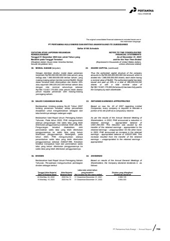 PT Pertamina Hulu Energi %u2022 Annual Report 703The original consolidated financial statements included herein are in the Indonesian language.PT PERTAMINA HULU ENERGI DAN ENTITAS ANAKNYA/AND ITS SUBSIDIARIESDaftar 5/150 ScheduleCATATAN ATAS LAPORAN KEUANGANKONSOLIDASIANTanggal 31 Desember 2023 dan untuk Tahun yang Berakhir pada Tanggal Tersebut(Disajikan dalam ribuan dolar Amerika Serikat,kecuali dinyatakan lain)NOTES TO THE CONSOLIDATEDFINANCIAL STATEMENTSAs of December 31, 2023and for the Year Then Ended(Expressed in thousands of United States dollars,unless otherwise stated)32. MODAL SAHAM (lanjutan) 32. SHARE CAPITAL (continued)Dengan demikian struktur modal dasar perseroan berjumlah Rp790.000.000.000.000 (nilai penuh) yang terbagi atas 1.580.000.000.000 lembar saham, yang masing-masing saham bernilai nominal Rp500. Modal dasar tersebut telah ditempatkan dan disetor 25% atau sejumlah 396.225.242.340 lembar saham atau dengan nilai nominal seluruhnya sebesar Rp198.112.621.170.000 (nilai penuh) telah disetor penuh kepada perseroan oleh masing-masing pemegang saham.Thus the authorized capital structure of the company amounts to Rp790,000,000,000,000 (full amount) which is divided into 1,580,000,000,000 shares, each share having a nominal value of Rp500. The authorized capital has been issued and paid up 25% or a total of 396,225,242,340 shares or with a total nominal value of Rp198,112,621,170,000 (full amount) has been fully paid to the Company by each shareholder.33. SALDO CADANGAN WAJIB 33. RETAINED EARNINGS APPROPRIATEDBerdasarkan Undang-undang No.40 Tahun 2007 tentang perseroan terbatas, setiap perusahaan diwajibkan untuk mengalokasikan sebagian dari laba bersihnya sebagai cadangan wajib. Based on Law No. 40 of 2007 regarding Limited Companies, every company is required to allocate a portion of its net profit as a compulsory reserve.Bedasarkan hasil Rapat Umum Pemegang Saham Tahunan, Pada tahun 2022, PHE mengumumkan adanya pengurangan nilai saldo laba yang telah ditentukan penggunaannya sebesar AS$1.262.250. Pengurangan tersebut disebabkan oleh pemindahan saldo laba yang telah ditentukan penggunaannya ke saldo laba yang belum ditentukan penggunaannya. Sedangkan, pada tahun 2023, PHE mengumumkan adanya penambahan saldo laba yang telah ditentukan penggunaannya sebesar AS$327.995. Kenaikan tersebut merupakan hasil dari pemindahan saldo laba yang belum ditentukan penggunaannya ke saldo laba yang telah ditentukan penggunaannya.As per the results of the Annual General Meeting of Shareholders, in 2022, PHE announced a reduction in retained earnings - appropriated balance of US$1,262,250. This reduction was caused by the transfer of the retained earnings - appropriated to the retained earnings %u2013 unappropriated. On the other hand, in 2023, PHE announced an increase in the retained earnings - appropriated balance of US$327,995. This increase resulted from the transfer of the retained earnings %u2013 unappropriated to the retained earnings -appropriated.34. DIVIDEN 34. DIVIDENDSBerdasarkan hasil Rapat Umum Pemegang Saham Tahunan, Perusahaan mengumumkan pembagiandividen sebagai berikut:Based on results of the Annual General Meetings of Shareholders, the Company declared dividends in as follows:Laba neto untuk tahunTanggal Akta Notaris/ Akta Notaris/ yang berakhir/ Dividen yang dibagikan/Date of Notarial Deed Notarial Deed Net income for the years ended Dividends declared24 Mei/May 24, 2022 2022 No.13 31 Desember/December 31, 2021 2.888.10515 Mei/May 15, 2023 2023 No.79 31 Desember/December 31, 2022 3.664.303