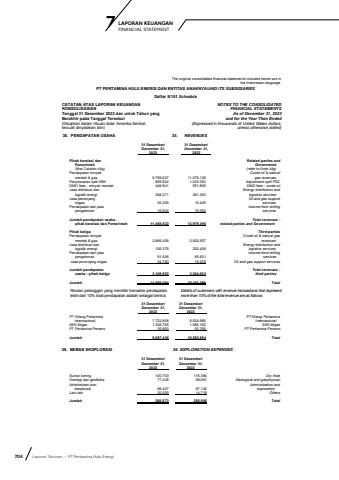 704 Laporan Tahunan %u2022 PT Pertamina Hulu EnergiLAPORAN KEUANGAN 7 FINANCIAL STATEMENTThe original consolidated financial statements included herein are in the Indonesian language.PT PERTAMINA HULU ENERGI DAN ENTITAS ANAKNYA/AND ITS SUBSIDIARIESDaftar 5/151 ScheduleCATATAN ATAS LAPORAN KEUANGANKONSOLIDASIANTanggal 31 Desember 2023 dan untuk Tahun yang Berakhir pada Tanggal Tersebut(Disajikan dalam ribuan dolar Amerika Serikat,kecuali dinyatakan lain)NOTES TO THE CONSOLIDATEDFINANCIAL STATEMENTSAs of December 31, 2023and for the Year Then Ended(Expressed in thousands of United States dollars,unless otherwise stated)35. PENDAPATAN USAHA 35. REVENUES31 Desember/ 31 Desember/December 31, December 31,2023 2022Pihak berelasi dan Related parties andPemerintah Government(lihat Catatan 44g) (refer to Note 44g)Pendapatan minyak Crude oil & naturalmentah & gas 9.799.637 11.078.139 gas revenues Penyesuaian split KBH 859.924 1.033.353 Adjustment split PSCDMO fees - minyak mentah 448.841 551.809 DMO fees - crude oilJasa distribusi dan Energy distribution andlogistik energi 308.271 281.303 logistics servicesJasa penunjang Oil and gas supportmigas 25.255 15.429 servicesPendapatan dari jasa Income from drillingpengeboran 16.904 19.363 servicesJumlah pendapatan usaha - Total revenues -pihak berelasi dan Pemerintah 11.458.832 12.979.396 related parties and GovernmentPihak ketiga Third partiesPendapatan minyak Crude oil & natural gasmentah & gas 2.866.458 2.920.557 revenuesJasa distribusi dan Energy distribution andlogistik energi 126.378 202.406 logistics servicesPendapatan dari jasa Income from drillingpengeboran 81.936 65.831 servicesJasa penunjang migas 34.780 15.209 Oil and gas support servicesJumlah pendapatan Total revenues -usaha - pihak ketiga 3.109.552 3.204.003 third partiesJumlah 14.568.384 16.183.399 TotalRincian pelanggan yang memiliki transaksi pendapatan lebih dari 10% total pendapatan adalah sebagai berikut:Details of customers with revenue transactions that represent more than 10% of the total revenue are as follows:31 Desember/ 31 Desember/December 31, December 31,2023 2022 PT Kilang Pertamina PT Kilang PertaminaInternasional 7.722.808 8.924.966 InternasionalSKK Migas 1.308.765 1.585.162 SKK MigasPT Pertamina Persero 35.862 52.766 PT Pertamina Persero Jumlah 9.067.435 10.562.894 Total36. BEBAN EKSPLORASI 36. EXPLORATION EXPENSES31 Desember/ 31 Desember/December 31, December 31,2023 2022Sumur kering 100.703 116.384 Dry HoleGeologi dan geofisika 77.408 58.661 Geological and geophysicalAdministrasi dan Administration andeksplorasi 68.407 67.142 explorationLain-lain 20.055 14.719 OthersJumlah 266.573 256.906 Total