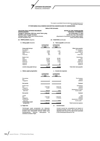 708 Laporan Tahunan %u2022 PT Pertamina Hulu EnergiLAPORAN KEUANGAN 7 FINANCIAL STATEMENTThe original consolidated financial statements included herein are in the Indonesian language.PT PERTAMINA HULU ENERGI DAN ENTITAS ANAKNYA/AND ITS SUBSIDIARIESDaftar 5/155 ScheduleCATATAN ATAS LAPORAN KEUANGANKONSOLIDASIANTanggal 31 Desember 2023 dan untuk Tahun yang Berakhir pada Tanggal Tersebut(Disajikan dalam ribuan dolar Amerika Serikat, kecuali dinyatakan lain)NOTES TO THE CONSOLIDATEDFINANCIAL STATEMENTS As of December 31, 2023and for the Year Then Ended(Expressed in thousands of United States dollars,unless otherwise stated)43. PERPAJAKAN (lanjutan) 43. TAXATION (continued)b. Utang pajak (lanjutan) b. Taxes payable (continued)31 Desember/ 31 Desember/December 31, December 31, 2023 2022Utang pajak lainnya Other taxes payablePerusahaan: The Company: Pasal 21 5.566 4.461 Article 21Pasal 23,26,15 2.087 118 Article 23,26,15 PPN 344 552 VATPasal 4(2) (87) 117 Article 4(2) Entitas Anak: Subsidiaries: PPN 93.748 89.566 VATPasal 21 36.827 34.410 Article 21Pasal 23 10.334 8.167 Article 23Pasal 4(2) 2.223 2.106 Article 4(2)Pasal 26 1.338 77 Article 26Pasal 22 96 96 Article 22Jumlah utang pajak lainnya 152.476 139.670 Total other taxes payablec. Beban pajak penghasilan c. Income tax expense31 Desember/ 31 Desember/December 31, December 31, 2023 2022Perusahaan The CompanyKini - - CurrentTangguhan - - DeferredSub jumlah - - SubtotalEntitas Anak SubsidiariesKini 1.847.853 2.553.797 CurrentTangguhan 14.651 (118.353) DeferredPenyesuaian Adjustments in respecttahun lalu (96.013) 8.641 of prior yearsSub jumlah 1.766.491 2.444.085 SubtotalJumlah TotalKini 1.847.853 2.553.797 CurrentTangguhan 14.651 (118.353) DeferredPenyesuaian Adjustments in respect tahun lalu (96.013) 8.641 of prior yearsJumlah beban pajak penghasilan 1.766.491 2.444.085 Total income tax expensed. Pajak kini d. Current taxesPerhitungan pajak penghasilan kini dilakukanberdasarkan estimasi penghasilan kena pajak. Nilai tersebut akan disesuaikan kembali ketika SuratPemberitahuan Tahunan disampaikan keDirektorat Jenderal Pajak.Current income tax computations are based onestimated taxable income. The amounts will beadjusted when Annual Tax Refund are submitted to the Directorate General of Tax.