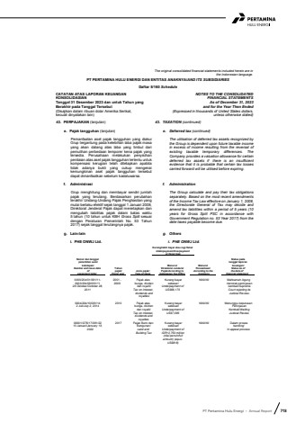 PT Pertamina Hulu Energi %u2022 Annual Report 713The original consolidated financial statements included herein are in the Indonesian language.PT PERTAMINA HULU ENERGI DAN ENTITAS ANAKNYA/AND ITS SUBSIDIARIESDaftar 5/160 ScheduleCATATAN ATAS LAPORAN KEUANGANKONSOLIDASIANTanggal 31 Desember 2023 dan untuk Tahun yang Berakhir pada Tanggal Tersebut(Disajikan dalam ribuan dolar Amerika Serikat,kecuali dinyatakan lain)NOTES TO THE CONSOLIDATEDFINANCIAL STATEMENTSAs of December 31, 2023and for the Year Then Ended(Expressed in thousands of United States dollars,unless otherwise stated)43. PERPAJAKAN (lanjutan) 43. TAXATION (continued)e. Pajak tangguhan (lanjutan) e. Deferred tax (continued)Pemanfaatan aset pajak tangguhan yang diakui Grup tergantung pada kelebihan laba pajak masa yang akan datang atas laba yang timbul dari pemulihan perbedaan temporer kena pajak yang tersedia. Perusahaan melakukan penyisihan penilaian atas aset pajak tangguhan tertentu untuk kompensasi kerugian telah ditetapkan apabila tidak adanya bukti yang cukup mengenai kemungkinan aset pajak tangguhan tersebut dapat dimanfaatkan sebelum kadaluwarsa.The utilisation of deferred tax assets recognized by the Group is dependent upon future taxable income in excess of income resulting from the reversal of existing taxable temporary differences. The Company provides a valuation allowance for certain deferred tax assets if there is an insufficient evidence that it is probable that certain tax losses carried forward will be utilised before expiring.f. Administrasi f. AdministrationGrup menghitung dan membayar sendiri jumlah pajak yang terutang. Berdasarkan perubahan terakhir Undang-Undang Pajak Penghasilan yang mulai berlaku efektif sejak tanggal 1 Januari 2008, Direktorat Jenderal Pajak dapat menetapkan dan mengubah liabilitas pajak dalam batas waktu 5 tahun (10 tahun untuk KBH Gross Split sesuai dengan Peraturan Pemerintah No. 53 Tahun 2017) sejak tanggal terutangnya pajak.The Group calculate and pay their tax obligations separately. Based on the most recent amendments of the Income Tax Law effective on January 1, 2008, the Directorate General of Tax may decide and amend tax liabilities within a period of 5 years (10 years for Gross Split PSC in accordance with Government Regulation no. 53 Year 2017) from the date taxes payable become due. g. Lain-lain g. Othersi. PHE ONWJ Ltd. i. PHE ONWJ Ltd. Kurang/lebih bayar atau rugi fiskalUnderpayment/Overpayment__________or fiscal loss__________ Nomor dan tanggal penerbitan surat ketetapan/Number and issue date ofassesment letterTahunpajak/Fiscal yearJenis pajak/Type of taxesMenurutDirektorat Jenderal Pajak/According to Indonesian Tax OfficeMenurutPerusahaan/According to the CompanyStatus padatanggal laporankeuangan/Status as ofthe date offinancial statement0003/204/01/091/11-0003/204/09/091/1128 Oktober/October 28,20112001 -2009Pajak atas bunga, dividen dan royalti/Tax on Interest, dividends and royaltiesKurang bayarsebesar/ Underpayment of US$66,173Nihil/Nil Mahkamah Agung menolak peninjauan kembali/Supreme Court rejecting its Judicial Review.0004/204/10/081/142 Juli/July 2, 20142010 Pajak atas bunga, dividen dan royalti/Tax on Interest, dividends and royaltiesKurang bayarsebesar/ Underpayment ofUS$7,585Nihil/Nil Menunggu keputusan Peninjauan Kembali/Waiting Judicial Review00001//276/17/081/2213 Januari/January 13, 20222017 Pajak Bumi dan Bangunan/Land and Building TaxKurang bayarsebesar/ Underpayment ofIDR12,753 million (nilai penuh/full amount) (equiv. US$818)Nihil/Nil Dalam proses banding/In appeal process