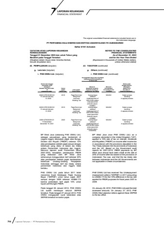 714 Laporan Tahunan %u2022 PT Pertamina Hulu EnergiLAPORAN KEUANGAN 7 FINANCIAL STATEMENTThe original consolidated financial statements included herein are in the Indonesian language.PT PERTAMINA HULU ENERGI DAN ENTITAS ANAKNYA/AND ITS SUBSIDIARIESDaftar 5/161 ScheduleCATATAN ATAS LAPORAN KEUANGANKONSOLIDASIANTanggal 31 Desember 2023 dan untuk Tahun yang Berakhir pada Tanggal Tersebut(Disajikan dalam ribuan dolar Amerika Serikat,kecuali dinyatakan lain)NOTES TO THE CONSOLIDATEDFINANCIAL STATEMENTSAs of December 31, 2023and for the Year Then Ended(Expressed in thousands of United States dollars,unless otherwise stated)43. PERPAJAKAN (lanjutan) 43. TAXATION (continued)g. Lain-lain (lanjutan) g. Others (continued)i. PHE ONWJ Ltd. (lanjutan) i. PHE ONWJ Ltd. (continued)Kurang/lebih bayar atau rugi fiskalUnderpayment/Overpayment__________or fiscal loss__________BP West Java (sekarang PHE ONWJ Ltd.) sebagai perusahaan yang berdomisili di negara Inggris dikenakan pajak atas Bunga, Dividen dan Royalti (%u201cPBDR%u201d) sebesar 10% atas pendapatan setelah pajak sesuai dengan ketentuan yang diatur di dalam tax treatyantara Pemerintah Indonesia dan Inggris. Menurut laporan audit Pemerintah tahun 2001-2010, kewajiban pembayaran PBDR yang dilakukan oleh BP West Java seharusnya menggunakan tarif sebesar 20% atas pendapatan setelah pajak berdasarkan ketentuan Undang-Undang Perpajakan Indonesia sehingga tarif tax treaty antara pemerintah Indonesia dan Inggris tidak berlaku.BP West Java (now PHE ONWJ Ltd.) as a company domiciled in the United Kingdom (%u201cUK%u201d), applied a 10% rate of tax on Interest, Dividends and Royalties (%u201cPBDR%u201d) on income after income tax in accordance with the provisions stipulated in the Tax Treaty between the Governments of Indonesia and the UK. Based on the Government audit reports for 2001-2010, PBDR payments by BP West Java should have been made at the rate of 20% of income after tax based on the provisions of Indonesian Tax Law, and that the tax treaty rate between Indonesian and the UK Governments are not applicable in these circumstances.PHE ONWJ Ltd. pada tahun 2011 telah menerima Surat Ketetapan Pajak Kurang Bayar (%u201cSKPKB%u201d) untuk tahun pajak 2001 sampai dengan 2009 sebesar AS$66.173 karena perbedaan tarif pajak 10% untuk tujuan perhitungan PBDR.PHE ONWJ Ltd has received Tax Underpayment Assessment Letters (%u201cSKPKB%u201d) in 2011 amounting to US$66,173 for the 10% difference in the tax rate applied for PBDR purposes for fiscal years 2001 to 2009. Pada tanggal 26 Januari 2012, PHE ONWJ Ltd sudah membayar seluruh SKPKB tersebut. Pada tanggal 27 Januari 2012, PHE ONWJ mengajukan surat keberatan atas SKPKB tersebut ke kantor pajak. On January 26, 2012, PHE ONWJ Ltd paid the total assessed amounts. On January 27, 2012, PHE ONWJ filed objection letters against these SKPKB to the tax office. Nomor dan tanggal penerbitan surat ketetapan/Number and issue date ofassesment letterTahunpajak/Fiscal yearJenis pajak/Type of taxesMenurutDirektorat Jenderal Pajak/According to Indonesian Tax OfficeMenurutPerusahaan/According to the CompanyStatus padatanggal laporankeuangan/Status as ofthe date offinancial statement00001//276/18/081/2213 Januari/January13, 20222018 Pajak Bumi dan Bangunan/Land and Building TaxKurang bayarsebesar/ Underpayment ofIDR13,262 million(nilai penuh/full amount) (equiv. US$851)Nihil/Nil Dalam proses banding/In appeal process00001//276/19/081/2213 Januari/January13, 20222019 Pajak Bumi dan Bangunan/Land and Building TaxKurang bayarsebesar/ Underpayment ofIDR15,030 million ((nilai penuh/full amount) (equiv. US$964)Nihil/Nil Dalam proses banding/In appeal process00001/276/20/081/2115 Desember/December 15, 20212020 Pajak Bumi dan Bangunan/Land and Building TaxKurang bayarsebesar/ Underpayment ofIDR134,090 million ((nilai penuh/full amount) (equiv. US$8,600)Nihil/Nil Dalam proses banding/In appeal process