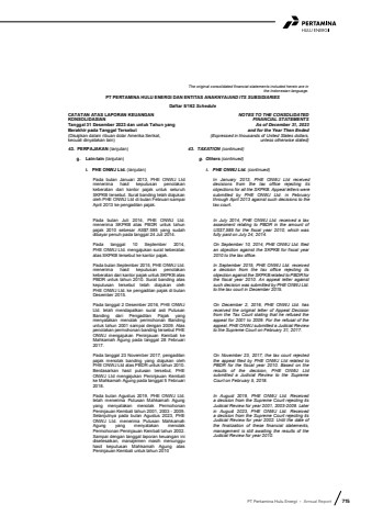 PT Pertamina Hulu Energi %u2022 Annual Report 715The original consolidated financial statements included herein are in the Indonesian language.PT PERTAMINA HULU ENERGI DAN ENTITAS ANAKNYA/AND ITS SUBSIDIARIESDaftar 5/162 ScheduleCATATAN ATAS LAPORAN KEUANGANKONSOLIDASIANTanggal 31 Desember 2023 dan untuk Tahun yang Berakhir pada Tanggal Tersebut(Disajikan dalam ribuan dolar Amerika Serikat,kecuali dinyatakan lain)NOTES TO THE CONSOLIDATEDFINANCIAL STATEMENTSAs of December 31, 2023and for the Year Then Ended(Expressed in thousands of United States dollars,unless otherwise stated)43. PERPAJAKAN (lanjutan) 43. TAXATION (continued)g. Lain-lain (lanjutan) g. Others (continued)i. PHE ONWJ Ltd. (lanjutan) i. PHE ONWJ Ltd. (continued)Pada bulan Januari 2013, PHE ONWJ Ltd menerima hasil keputusan penolakan keberatan dari kantor pajak untuk seluruh SKPKB tersebut. Surat banding telah diajukan oleh PHE ONWJ Ltd di bulan Februari sampai April 2013 ke pengadilan pajak.In January 2013, PHE ONWJ Ltd received decisions from the tax office rejecting its objections for all the SKPKB. Appeal letters were submitted by PHE ONWJ Ltd. in February through April 2013 against such decisions to the tax court.Pada bulan Juli 2014, PHE ONWJ Ltd. menerima SKPKB atas PBDR untuk tahun pajak 2010 sebesar AS$7.585 yang sudah dibayar penuh pada tanggal 24 Juli 2014.In July 2014, PHE ONWJ Ltd. received a tax assesment relating to PBDR in the amount of US$7,585 for the fiscal year 2010, which was fully paid on July 24, 2014.Pada tanggal 10 September 2014, PHE ONWJ Ltd. mengajukan surat keberatan atas SKPKB tersebut ke kantor pajak.On September 10, 2014, PHE ONWJ Ltd. filed an objection against the SKPKB for fiscal year 2010 to the tax office.Pada bulan September 2015, PHE ONWJ Ltd. menerima hasil keputusan penolakan keberatan dari kantor pajak untuk SKPKB atas PBDR untuk tahun 2010. Surat banding atas keputusan tersebut telah diajukan oleh PHE ONWJ Ltd. ke pengadilan pajak di bulan Desember 2015.In September 2015, PHE ONWJ Ltd. received a decision from the tax office rejecting its objection against the SKPKB related to PBDR for the fiscal year 2010. An appeal letter against such decision was submitted by PHE ONWJ Ltd. to the tax court in December 2015.Pada tanggal 2 Desember 2016, PHE ONWJ Ltd. telah mendapatkan surat asli Putusan Banding dari Pengadilan Pajak yang menyatakan menolak permohonan Banding untuk tahun 2001 sampai dengan 2009. Atas penolakan permohonan banding tersebut PHE ONWJ mengajukan Peninjauan Kembali ke Mahkamah Agung pada tanggal 28 Februari 2017.On December 2, 2016, PHE ONWJ Ltd. has received the original letter of Appeal Decision from the Tax Court stating that he refused the appeal for 2001 to 2009. For the refusal of the appeal, PHE ONWJ submitted a Judicial Review to the Supreme Court on February 31, 2017.Pada tanggal 23 November 2017, pengadilan pajak menolak banding yang diajukan oleh PHE ONWJ Ltd atas PBDR untuk tahun 2010. Berdasarkan hasil putusan tersebut, PHE ONWJ Ltd mengajukan Peninjauan Kembali ke Mahkamah Agung pada tanggal 5 Februari2018.On November 23, 2017, the tax court rejected the appeal filed by PHE ONWJ Ltd related to PBDR for the fiscal year 2010. Based on the results of the decision, PHE ONWJ Ltd submitted a Judicial Review to the Supreme Court on February 5, 2018.Pada bulan Agustus 2019, PHE ONWJ Ltd. telah menerima Putusan Mahkamah Agung yang menyatakan menolak Permohonan Peninjauan Kembali tahun 2001, 2003 - 2009. Selanjutnya pada bulan Agustus 2023, PHE ONWJ Ltd. menerima Putusan Mahkamah Agung yang menyatakan menolak Permohonan Peninjauan Kembali tahun 2002. Sampai dengan tanggal laporan keuangan ini diselesaikan, manajemen masih menunggu hasil keputusan Mahkamah Agung atas Peninjauan Kembali untuk tahun 2010In August 2019, PHE ONWJ Ltd. Received a decision from the Supreme Court rejecting its Judicial Review for year 2001, 2003-2009. Later in August 2023, PHE ONWJ Ltd. Received a decision from the Supreme Court rejecting its Judicial Review for year 2002. Until the date ofthe finalization of these financial statements, management is still awaiting the results of the Judicial Review for year 2010.