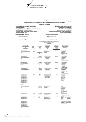 724 Laporan Tahunan %u2022 PT Pertamina Hulu EnergiLAPORAN KEUANGAN 7 FINANCIAL STATEMENTThe original consolidated financial statements included herein are in the Indonesian language.PT PERTAMINA HULU ENERGI DAN ENTITAS ANAKNYA/AND ITS SUBSIDIARIESDaftar 5/171 ScheduleCATATAN ATAS LAPORAN KEUANGANKONSOLIDASIANTanggal 31 Desember 2023 dan untuk Tahun yang Berakhir pada Tanggal Tersebut(Disajikan dalam ribuan dolar Amerika Serikat, kecuali dinyatakan lain)NOTES TO THE CONSOLIDATEDFINANCIAL STATEMENTS As of December 31, 2023and for the Year Then Ended(Expressed in thousands of United States dollars,unless otherwise stated)43. PERPAJAKAN (lanjutan) 43. TAXATION (continued)g. Lain-lain (lanjutan) g. Others (continued)iii. PEP (lanjutan) iii. PEP (continued)Kurang/lebih bayar atau rugi fiskal (nilai penuh/full amount)Underpayment/Overpayment__________or fiscal loss ________Nomor dan tanggalpenerbitan surat ketetapan/ Numberandissue date of assessment letter Tahun pajak/ Fiscal year Jenis pajak/Type of taxesMenurut Direktorat Jenderal Pajak/ according to IndonesianTaxOffice Menurut Perusahaan/ according to the Company Status pada tanggallaporan keuangan/Status as ofthe date offinancial statement00002/206/14/081/1817 September/September 17, 20182014 PPh Badan/Corporate Income TaxKurang bayar sebesar/ Underpayment of US$20.597Nihil/Nil Pengadilan Pajak mengabulkan seluruhnya Banding/Tax Court fully granted the Company%u2019s appeal00002/206/15/081/1828 November/November 28,. 20182015 PPh Badan/Corporate Income TaxKurang bayar sebesar/ Underpayment of US$15.732Nihil/Nil Pengadilan Pajak mengabulkan seluruhnya Banding/Tax Court fully granted the Company%u2019s appeal00005/206/16/081/1828 November/November 28, 20182016 PPh Badan/Corporate Income TaxKurang bayar sebesar/ Underpayment of US$12.019Nihil/Nil Pengadilan Pajak mengabulkan seluruhnya Banding/Tax Court fully granted the Company%u2019s appeal00002/206/17/081/1926 Desember/December 26, 20192017 PPh Badan/ Corporate Income TaxKurang bayar sebesar/ Underpayment of US$13.120 Nihil/Nil Pengadilan Pajak mengabulkan seluruhnya Banding/Tax Court fully grantedthe Company%u2019s appeal00036/287/17/081/1900037/287/17/081/1900038/287/17/081/1900039/287/17/081/1900040/287/17/081/1900041/287/17/081/1900042/287/17/081/1900043/287/17/081/1900044/287/17/081/1900045/287/17/081/1900046/287/17/081/1900047/287/17/081/1926 Desember/December 26, 20192017 PPN/VATKurang bayar sebesar/ Underpayment of IDR 7,990 million (nilai penuh/full amount)(Equiv. US$512)Nihil/Nil Pengadilan Pajak mengabulkan seluruhnya Banding/Tax Court fully granted the Company%u2019s appeal00002/206/18/081/1919 Desember/December 19, 20192018 PPh Badan/ Corporate Income TaxKurang bayar sebesar/ Underpayment of US$10.812Nihil/Nil Pengadilan Pajak mengabulkan seluruhnya Banding/Tax Court fully grantedthe Company%u2019sappeal00002/206/19/081/2030 Desember/December 30,20202019 PPh Badan/ Corporate Income TaxKurang bayar sebesar/ Underpayment of US$5.585 millionNihil/Nil Pengadilan Pajak mengabulkan seluruhnya Banding/Tax Court fully granted the Company%u2019sappeal 00001/287/17/081/1900002/287/17/081/1900003/287/17/081/1900004/287/17/081/1900005/287/17/081/1900006/287/17/081/1900007/287/17/081/1900008/287/17/081/1900009/287/17/081/1900010/287/17/081/1900011/287/17/081/1900012/287/17/081/1930 Desember/December 30,20202019 PPN/VATKurang bayar sebesar/ Underpayment of Rp4,919 million (nilai penuh/full amount) (Equiv. US$315)Nihil/Nil Pengadilan Pajak menolak Banding dan Perusahaan telah mengajukan permohonan Peninjauan Kembali ke Mahkamah Agung /Tax Court rejected the appeal and Company had submitted a request for Judicial Review to Supreme Court