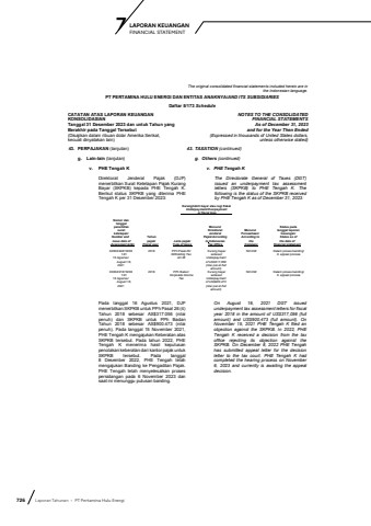 726 Laporan Tahunan %u2022 PT Pertamina Hulu EnergiLAPORAN KEUANGAN 7 FINANCIAL STATEMENTThe original consolidated financial statements included herein are in the Indonesian language.PT PERTAMINA HULU ENERGI DAN ENTITAS ANAKNYA/AND ITS SUBSIDIARIESDaftar 5/173 ScheduleCATATAN ATAS LAPORAN KEUANGANKONSOLIDASIANTanggal 31 Desember 2023 dan untuk Tahun yang Berakhir pada Tanggal Tersebut(Disajikan dalam ribuan dolar Amerika Serikat,kecuali dinyatakan lain)NOTES TO THE CONSOLIDATEDFINANCIAL STATEMENTSAs of December 31, 2023and for the Year Then Ended(Expressed in thousands of United States dollars,unless otherwise stated)43. PERPAJAKAN (lanjutan) 43. TAXATION (continued)g. Lain-lain (lanjutan) g. Others (continued)v. PHE Tengah K v. PHE Tengah KDirektorat Jenderal Pajak (DJP) menerbitkan Surat Ketetapan Pajak Kurang Bayar (SKPKB) kepada PHE Tengah K. Berikut status SKPKB yang diterima PHE Tengah K per 31 Desember 2023:The Directorate General of Taxes (DGT) issued an underpayment tax assessment letters (SKPKB) to PHE Tengah K. The following is the status of the SKPKB received by PHE Tengah K as of December 31, 2023:Kurang/lebih bayar atau rugi fiskalUnderpayment/Overpayment__________or fiscal loss__________ Nomor dan tanggal penerbitan surat ketetapan/Number and issue date ofAssesment letterTahunpajak/Fiscal yearJenis pajak/Type of taxesMenurutDirektorat Jenderal Pajak/According to Indonesian Tax OfficeMenurutPerusahaan/According to theCompanyStatus padatanggal laporankeuangan/Status as ofthe date offinancial statement00002/246/18/081/21 16 Agustus/ August 16,20212018 PPh Pasal 26/Witholding TaxArt.26Kurang bayarsebesar/ Underpayment of US$317,056 (nilai penuh/full amount)Nihil/Nil Dalam proses banding/In appeal process00002/216/18/081/21 16 Agustus/ August 16,20212018 PPh Badan/Corporate Income TaxKurang bayarsebesar/ Underpayment of US$900,473 (nilai penuh/full amount)Nihil/Nil Dalam proses banding/In appeal processPada tanggal 16 Agustus 2021, DJP menerbitkan SKPKB untuk PPh Pasal 26 (4) Tahun 2018 sebesar AS$317.056 (nilai penuh) dan SKPKB untuk PPh Badan Tahun 2018 sebesar AS$900.473 (nilai penuh). Pada tanggal 15 November 2021, PHE Tengah K mengajukan Keberatan atas SKPKB tersebut. Pada tahun 2022, PHE Tengah K menerima hasil keputusan penolakan keberatan dari kantor pajak untuk SKPKB tersebut. Pada tanggal 8 Desember 2022, PHE Tengah telah mengajukan Banding ke Pengadilan Pajak. PHE Tengah telah menyelesaikan proses persidangan pada 6 November 2023 dan saat ini menunggu putusan banding.On August 16, 2021 DGT issued underpayment tax assessment letters for fiscal year 2018 in the amount of US$317,056 (full amount) and US$900,473 (full amount). On November 15, 2021 PHE Tengah K filed an objection against the SKPKB. In 2022, PHE Tengah K received a decision from the tax office rejecting its objection against the SKPKB. On December 8, 2022 PHE Tengah has submitted appeal letter for the decision letter to the tax court. PHE Tengah K had completed the hearing process on November 6, 2023 and currently is awaiting the appeal decision.