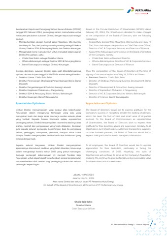 Berdasarkan Keputusan Pemegang Saham Secara Sirkuler (KPSSS) tanggal 20 Februari 2024, pemegang saham memutuskan untuk melakukan perubahan susunan Direksi, dengan keputusan sebagai berikut:%u2022 Memberhentikan dengan hormat Wiko Migantoro, Oto Gurnita,dan Harry M. Zen, dari posisinya masing-masing sebagai Direktur Utama, Direktur SDM & Penunjang Bisnis, dan Direktur Keuangan.%u2022 Mengangkat nama-nama berikut untuk menjabat dalam jajaranDireksi Perusahaan, yaitu:%u2022 Chalid Said Salim sebagai Direktur Utama.%u2022 Whisnu Bahriansyah sebagai Direktur SDM & Penunjang Bisnis.%u2022 Dannif Danusaputro sebagai Direktur Keuangan.Dengan demikian, susunan Direksi pada saat ditandatanganinya laporan tahunan ini per tanggal 14 Mei 2024 adalah sebagai berikut:%u2022 Direktur Utama: Chalid Said Salim%u2022 Direktur Perencanaan Strategis & Pengembangan Bisnis: DanarDojoadhi%u2022 Direktur Pengembangan & Produksi: Awang Lazuardi%u2022 Direktur Eksplorasi: Muharram J. Panguriseng%u2022 Direktur SDM & Penunjang Bisnis: Whisnu Bahriansyah%u2022 Direktur Keuangan: Dannif DanusaputroApresiasi dan OptimismeIzinkan Direksi menyampaikan ucap syukur atas keberhasilan Perusahaan dalam mengarungi tantangan yang ada, yang merupakan buah dari kerja keras dan kerja cerdas seluruh pihak yang terlibat. Kepada Dewan Komisaris selaku representasi pemegang saham, Direksi menyampaikan rasa terima kasihnya atas arahan, nasihat dan pengawasan yang telah dilakukan. Demikian pula kepada seluruh pemangku kepentingan, baik itu pemegang saham, pelanggan, transporter, pemasok, maupun mitra usaha lainnya, Direksi menyampaikan terima kasih atas kolaborasi yang terbina dengan baik.Kepada seluruh karyawan, izinkan Direksi menyampaikan apresiasinya atas seluruh dedikasi yang telah diberikan, khususnya dalam menghadapi kondisi tahun 2023 yang penuh tantangan. Semoga semangat kebersamaan ini menjadi fondasi bagi Perusahaan untuk dapat dapat terus tumbuh secara berkelanjutan dan memberikan nilai tambah bagi pemegang saham dan seluruh pemangku kepentingan.Jakarta, 14 Mei 2024Jakarta, May 14, 2024Atas nama Direksi dan seluruh Insan PT Pertamina Hulu Energi,On behalf of the Board of Directors and all Personnel of PT Pertamina Hulu Energi,Chalid Said SalimDirektur UtamaChief Executive OfficerBased on the Circular Resolution of Shareholders (KPSSS) dated February 20, 2024, the Shareholders decided to make changes to the composition of the Board of Directors, with the following resolutions:%u2022 Respectfully dismiss Wiko Migantoro, Oto Gurnita, and Harry M. Zen, from their respective positions as Chief Executive Officer,Director of HC & Corporate Services, and Director of Finance.%u2022 Appoint the following persons to serve on the Board of Directors of the Company, namely:%u2022 Chalid Said Salim as President Director.%u2022 Whisnu Bahriansyah as Director of HC & Corporate Services.%u2022 Dannif Danusaputro as Director of Finance.Thus, the composition of the Board of Directors at the time ofsigning of this annual report as of May 14, 2024 is as follows:%u2022 President Director: Chalid Said Salim%u2022 Director of Strategic Planning & Business Development: DanarDojoadhi%u2022 Director of Development & Production: Awang Lazuardi%u2022 Director of Exploration: Muharram J. Panguriseng%u2022 Director of HC & Corporate Services: Whisnu Bahriansyah%u2022 Director of Finance: Dannif DanusaputroAppreciation and OptimismThe Board of Directors would like to express gratitude for the Company%u2019s success in navigating amidst the existing challenges, which has been the fruit of hard and smart work of all parties involved. To the Board of Commissioners as representative of Shareholders, the Board of Directors wish to express their gratitude for their direction, advice and supervision. Similarly, to all stakeholders, be it shareholders, customers, transporters, suppliers, or other business partners, the Board of Directors would like to express their gratitude for a well- managed collaboration.To all employees, the Board of Directors would like to express appreciation for their dedication, particularly in facing the challenging conditions of 2023. Hopefully, this spirit of togetherness will continue to serve as the Company%u2019s foundation enabling it to continue to grow sustainably and provide added value for shareholders and all stakeholders.PT Pertamina Hulu Energi %u2022 Annual Report 71