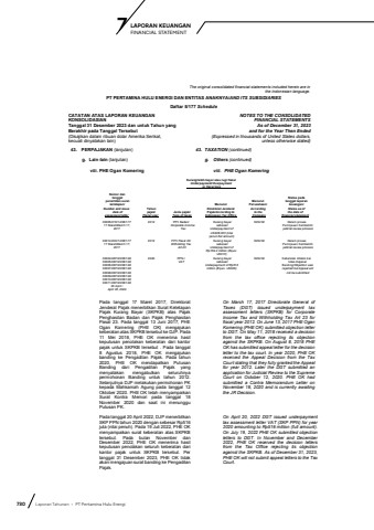 730 Laporan Tahunan %u2022 PT Pertamina Hulu EnergiLAPORAN KEUANGAN 7 FINANCIAL STATEMENTThe original consolidated financial statements included herein are in the Indonesian language.PT PERTAMINA HULU ENERGI DAN ENTITAS ANAKNYA/AND ITS SUBSIDIARIESDaftar 5/177 ScheduleCATATAN ATAS LAPORAN KEUANGANKONSOLIDASIANTanggal 31 Desember 2023 dan untuk Tahun yang Berakhir pada Tanggal Tersebut(Disajikan dalam ribuan dolar Amerika Serikat,kecuali dinyatakan lain)NOTES TO THE CONSOLIDATEDFINANCIAL STATEMENTSAs of December 31, 2023and for the Year Then Ended(Expressed in thousands of United States dollars,unless otherwise stated)43. PERPAJAKAN (lanjutan) 43. TAXATION (continued)g. Lain-lain (lanjutan) g. Others (continued)viii. PHE Ogan Komering viii. PHE Ogan KomeringKurang/lebih bayar atau rugi fiskalUnderpayment/Overpayment or fiscal loss . Nomor dan tanggal penerbitan surat ketetapan/Number and issue date ofassesment letterTahunpajak/Fiscal yearJenis pajak/Type of taxesMenurutDirektorat Jenderal Pajak/According toIndonesian Tax OfficeMenurutPerusahaan/According to theCompanyStatus padatanggal laporankeuangan/Status as ofthe date offinancial statement00005/216/12/081/17 17 Maret/March 17,20172012 PPh Badan/Corporate Income TaxKurang bayarsebesar/ Underpayment ofUS$38,023 (nilai penuh/full amount)Nihil/Nil Dalam proses Peninjauan Kembali/In judicial review process00014/203/12/081/1717 Maret/March 17,20172012 PPh Pasal 23/Witholding Tax Art.23Kurang bayarsebesar/ Underpayment of Rp159.2 million (Equiv. US$10)Nihil/Nil Dalam proses Peninjauan Kembali/In judicial review process00004/287/20/081/2200005/287/20/081/2200006/287/20/081/2200007/287/20/081/2200008/287/20/081/2200009/287/20/081/2200010/287/20/081/2200011/287/20/081/2220 April /April 20, 20222020 PPN /VATKurang bayarsebesar/ Underpayment of Rp516 million (Equiv. US$36)Nihil/Nil Keberatan ditolak dan tidak diajukan Banding/Objection was rejected but Appeal will not be submittedPada tanggal 17 Maret 2017, Direktorat Jenderal Pajak menerbitkan Surat Ketetapan Pajak Kurang Bayar (SKPKB) atas Pajak Penghasilan Badan dan Pajak Penghasilan Pasal 23. Pada tanggal 13 Juni 2017, PHE Ogan Komering (PHE OK) mengajukan keberatan atas SKPKB tersebut ke DJP. Pada 11 Mei 2018, PHE OK menerima hasil keputusan penolakan keberatan dari kantor pajak untuk SKPKB tersebut . Pada tanggal 8 Agustus 2018, PHE OK mengajukan banding ke Pengadilan Pajak. Pada tahun 2020, PHE OK mendapatkan Putusan Banding dari Pengadilan Pajak yang menyatakan mengabulkan seluruhnya permohonan Banding untuk tahun 2012. Selanjutnya DJP melakukan permohonan PK kepada Mahkamah Agung pada tanggal 12 Oktober 2020. PHE OK telah menyampaikan Surat Kontra Memori pada tanggal 18 November 2020 dan saat ini menunggu Putusan PK. On March 17, 2017 Directorate General of Taxes (DGT) issued underpayment tax assessment letters (SKPKB) for Corporate Income Tax and Withholding Tax Art 23 for fiscal year 2012. On June 13, 2017 PHE Ogan Komering (PHE OK) submitted objection letter to DGT. On May 11, 2018 received a decision from the tax office rejecting its objection against the SKPKB. On August 8, 2018 PHE OK has submitted appeal letter for the decision letter to the tax court. In year 2020, PHE OK received the Appeal Decision from the Tax Court stating that they fully granted the Appeal for year 2012. Later the DGT submitted an application for Judicial Review to the Supreme Court on October 12, 2020. PHE OK had submitted a Contra Memorandum Letter on November 18, 2020 and is currently awaiting the JR Decision. Pada tanggal 20 April 2022, DJP menerbitkan SKP PPN tahun 2020 dengan sebesar Rp516 juta (nilai penuh). Pada 19 Juli 2022, PHE OK menyampaikan surat keberatan atas SKPKB tersebut. Pada bulan November dan Desember 2022, PHE OK menerima hasil keputusan penolakan seluruh keberatan dari kantor pajak untuk SKPKB tersebut. Per tanggal 31 Desember 2023, PHE OK tidak akan mengajuan surat banding ke Pengadilan Pajak. On April 20, 2022 DGT issued underpayment tax assessment letter VAT (SKP PPN) for year 2020 amounting to Rp516 million (full amount). On July 19, 2022 PHE OK submitted objection letters to DGT. In November and December 2022, PHE OK received the decision letters from the Tax Office rejecting its objection against the SKPKB. As of December 31, 2023, PHE OK will not submit appeal letters to the Tax Court.