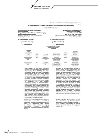 732 Laporan Tahunan %u2022 PT Pertamina Hulu EnergiLAPORAN KEUANGAN 7 FINANCIAL STATEMENTThe original consolidated financial statements included herein are in the Indonesian language.PT PERTAMINA HULU ENERGI DAN ENTITAS ANAKNYA/AND ITS SUBSIDIARIESDaftar 5/179 ScheduleCATATAN ATAS LAPORAN KEUANGANKONSOLIDASIANTanggal 31 Desember 2023 dan untuk Tahun yang Berakhir pada Tanggal Tersebut(Disajikan dalam ribuan dolar Amerika Serikat, kecuali dinyatakan lain)NOTES TO THE CONSOLIDATEDFINANCIAL STATEMENTS As of December 31, 2023and for the Year Then Ended(Expressed in thousands of United States dollars,unless otherwise stated)43. PERPAJAKAN (lanjutan) 43. TAXATION (continued)g. Lain-lain (lanjutan) g. Others (continued)x. PHE Salawati x. PHE SalawatiKurang/lebih bayar atau rugi fiskalUnderpayment/Overpayment or fiscal loss .Nomor dan tanggal penerbitan surat ketetapan/Number and issue date ofassesment letterTahun pajak/Fiscal yearJenis pajak/ Type of taxesMenurutDirektorat Jenderal Pajak/According toIndonesian Tax Office Menurut Perusahaan/Accordingto theCompanyStatus padatanggal laporankeuangan/ Status as ofthe date offinancial statement00002/216/11/081/16 13 April/April 13,20162011 PPh Badan/Corporate Income TaxKurang bayarsebesar/ Underpayment of US$283,127 (nilai penuh/full amount)Nihil/Nil Mahkamah Agung menolak peninjauan kembali /the Supreme Court rejecting its Judicial Review00036/203/11/081/16 13 April/April 13,20162011 PPh Pasal 23/Witholding Tax Art 23Kurang bayarsebesar/ Underpayment of Rp899 million (nilai penuh/full amount) (Equiv US$58)Nihil/Nil Mahkamah Agung menolak peninjauan kembali /the Supreme Court rejecting its Judicial ReviewPada tanggal 13 April 2016, Direktorat Jenderal Pajak menerbitkan Surat Ketetapan Pajak Kurang Bayar (SKPKB) atas Pajak Penghasilan Badan dan Pajak Penghasilan Pasal 23 untuk tahun 2011. Pada tanggal 12 Juli 2016, PHE Salawati mengajukan keberatan atas SKPKB tersebut ke DJP. Pada 21 Juni 2017, PHE Salawati menerima hasil keputusan penolakan keberatan dari kantor pajak untuk SKPKB tersebut. Pada tanggal 14 September 2017, PHE Salawati mengajukan banding ke Pengadilan Pajak. Pada 13 November 2019, PHE Salawati telah mendapatkan surat Putusan Banding dari Pengadilan Pajak yang menyatakan menolak permohonan Banding tersebut. Atas penolakan permohonan banding tersebut PHE Salawati telah mengajukan Peninjauan Kembali ke Mahkamah Agung pada 24 Februari 2020. Pada tanggal 2 Maret 2023, PHE Salawati telah menerima Putusan Mahkamah Agung yang menyatakan menolak Permohonan Peninjauan Kembali.On April 13, 2016 Directorate General of Taxes (DGT) issued underpayment tax assessment letters (SKPKB) for Corporate Income Tax and Withholding Tax Art. 23 for fiscal year 2011. On July 12, 2016 PHE Salawati submitted objection letter to DGT. On June 21, 2017 PHE Salawati received a decision from the tax office rejecting its objection against the SKPKB. On September 14, 2017 PHE Salawati has submitted appeal letter for the decision letter to the Tax Court. On November 13, 2019 PHE Salawati has received the letter of Appeal Decision from the Tax Court stating that they refused the appeal. For the refusal of the appeal, PHE Salawati has submitted a Judicial Review to the Supreme Court on February 24, 2020. On March 2, 2023, PHE ONWJ Ltd. received a decision from the Supreme Court rejecting its Judicial Review. Pada tanggal 2 Maret 2023, Mahkamah Agung memutuskan menolak permohonan Peninjauan Kembali PHE Salawati untuk PPh Pasal 23. Selanjutnya pada tanggal 2 Oktober 2023, Mahkamah Agung memutuskan menolak permohonan Peninjauan Kembali PHE Salawati untuk PPh Badan.On March 2, 2023, Supreme Court rejected the Judicial Review by PHE Salawati for Withholding Tax Art. 23. Later on October 2, 2023, Supreme Court rejected the Judicial Review by PHE Salawati for Corporate Income Tax.