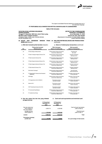 PT Pertamina Hulu Energi %u2022 Annual Report 735The original consolidated financial statements included herein are in the Indonesian language.PT PERTAMINA HULU ENERGI DAN ENTITAS ANAKNYA/AND ITS SUBSIDIARIESDaftar 5/182 ScheduleCATATAN ATAS LAPORAN KEUANGANKONSOLIDASIANTanggal 31 Desember 2023 dan untuk Tahun yang Berakhir pada Tanggal Tersebut(Disajikan dalam ribuan dolar Amerika Serikat,kecuali dinyatakan lain)NOTES TO THE CONSOLIDATEDFINANCIAL STATEMENTSAs of December 31, 2023and for the Year Then Ended(Expressed in thousands of United States dollars,unless otherwise stated)44. SALDO DAN TRANSAKSI DENGAN PIHAK BERELASI (lanjutan)44. RELATED PARTIES BALANCES AND TRANSACTIONS(continued)a. Sifat dari transaksi pihak berelasi (lanjutan) a. Nature of related party transactions (continued) Pihak-pihak berelasi/ Sifat hubungan/ Sifat transaksi/No. Related parties Nature of relationship Nature of transaction 22. PT Bina Bangun Wibawa Mukti Entitas berelasi dengan pemerintah/ Penjualan gas/Government-related entity Gas sales 23. PT Bank Tabungan Negara (Persero) Tbk. Entitas berelasi dengan pemerintah/ Transaksi perbankan/Government-related entity Banking service24. PT Bank Syariah Indonesia Tbk. Entitas berelasi dengan pemerintah/ Transaksi perbankan/Government-related entity Banking service25. PT Bank Rakyat Indonesia (Persero) Tbk. Entitas berelasi dengan pemerintah/ Transaksi perbankan/Government-related entity Banking service26. PT Bank Negara Indonesia (Persero) Tbk. Entitas berelasi dengan pemerintah/ Transaksi perbankan/Government-related entity Banking service 27. PT Bank Mandiri (Persero) Tbk. Entitas berelasi dengan pemerintah/ Transaksi perbankan/Government-related entity Banking service28. Kementerian Keuangan Entitas berelasi dengan pemerintah/ Jasa sewa aset/ Government-related entity Asset rental service29. PT Migas Mandiri Pratama Kutai Mahakam Entitas berelasi dengan pemerintah/ Penjualan minyak dan gas/(%u201cMMPKM%u201d) Government-related entity Oil and gas sales 30. SKK Migas Entitas berelasi dengan pemerintah/ Penjualan minyak dan gas/Government-related entity Oil and gas sales31. PT Donggi Senoro LNG (%u201cDSLNG%u201d) Perusahaan asosiasi/ Kepemilikan tidak langsung/associate company Indirect ownership32. Natuna 2 B.V. Perusahaan asosiasi/ Kepemilikan tidak langsung/associate company Indirect ownership33. PCPP Operating Company Sdn. Bhd. Perusahaan asosiasi/ Kepemilikan tidak langsung/associate company Indirect ownership 34. PT Lampung Energi Berjaya Entitas berelasi dengan pemerintah/ Penjualan minyak dan gas /Government-related entity Oil and gas sales35. PT Jakarta Oses Energi Entitas berelasi dengan pemerintah/ Penjualan minyak dan gas /Government-related entity Oil and gas salesb. Kas dan setara kas dan kas yang dibatasi penggunaannyab. Cash and cash equivalents and restricted cash31 Desember/ 31 Desember/December 31, December 31,2023 2022Kas dan setara kas Cash and cash equivalents(lihat Catatan 6) 4.839.713 4.235.894 (refer to Note 6)Kas yang dibatasipenggunaannya Restricted cash(lihat Catatan 7) 1.726.588 1.607.649 (refer to Note 7)Jumlah 6.566.301 5.843.543 TotalPersentase terhadap jumlah aset 21,26% 18,56% As a percentage of total assets