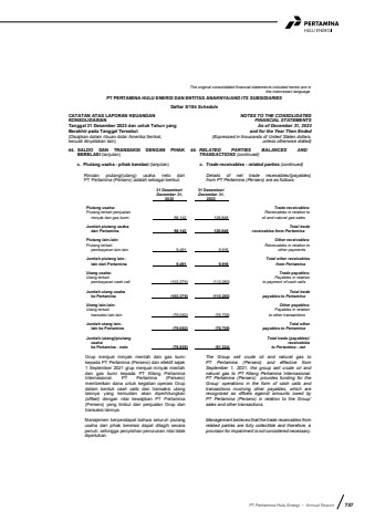 PT Pertamina Hulu Energi %u2022 Annual Report 737The original consolidated financial statements included herein are in the Indonesian language.PT PERTAMINA HULU ENERGI DAN ENTITAS ANAKNYA/AND ITS SUBSIDIARIESDaftar 5/184 ScheduleCATATAN ATAS LAPORAN KEUANGANKONSOLIDASIANTanggal 31 Desember 2023 dan untuk Tahun yang Berakhir pada Tanggal Tersebut(Disajikan dalam ribuan dolar Amerika Serikat,kecuali dinyatakan lain)NOTES TO THE CONSOLIDATEDFINANCIAL STATEMENTSAs of December 31, 2023and for the Year Then Ended(Expressed in thousands of United States dollars,unless otherwise stated)44. SALDO DAN TRANSAKSI DENGAN PIHAK BERELASI (lanjutan)44. RELATED PARTIES BALANCES AND TRANSACTIONS (continued)c. Piutang usaha - pihak berelasi (lanjutan) c. Trade receivables - related parties (continued)Rincian piutang/(utang) usaha neto dari PT Pertamina (Persero) adalah sebagai berikut:Details of net trade receivables/(payables) from PT Pertamina (Persero) are as follows:31 Desember/ 31 Desember/December 31, December 31,2023 2022Piutang usaha: Trade receivables:Piutang terkait penjualan Receivables in relation tominyak dan gas bumi 96.142 128.848 oil and natural gas salesJumlah piutang usaha Total tradedari Pertamina 96.142 128.848 receivables from PertaminaPiutang lain-lain: Other receivables:Piutang terkait Receivables in relation topembayaran lain-lain 9.491 9.916 other payments Jumlah piutang lain- Total other receivableslain dari Pertamina 9.491 9.916 from PertaminaUtang usaha: Trade payables:Utang terkait Payables in relationpembayaran cash call (103.376) (113.283) to payment of cash callsJumlah utang usaha Total tradeke Pertamina (103.376) (113.283) payables to PertaminaUtang lain-lain: Other payables:Utang terkait Payables in relationtransaksi lain-lain (79.062) (76.705) to other transactionsJumlah utang lain- Total otherlain ke Pertamina (79.062) (76.705) payables to PertaminaJumlah (utang)/piutang Total trade (payables)/usaha receivableske Pertamina - neto (76.805) (51.224) to Pertamina - netGrup menjual minyak mentah dan gas bumi kepada PT Pertamina (Persero) dan efektif sejak 1 September 2021 grup menjual minyak mentah dan gas bumi kepada PT Kilang Pertamina Internasional. PT Pertamina (Persero)memberikan dana untuk kegiatan operasi Grupdalam bentuk cash calls dan transaksi utang lainnya yang kemudian akan diperhitungkan (offset) dengan nilai kewajiban PT Pertamina (Persero) yang timbul dari penjualan Grup dan transaksi lainnya.The Group sell crude oil and natural gas to PT Pertamina (Persero) and effective from September 1, 2021, the group sell crude oil and natural gas to PT Kilang Pertamina Internasional.PT Pertamina (Persero) provides funding for the Group%u2019 operations in the form of cash calls and transactions involving other payables, which are recognized as offsets against amounts owed by PT Pertamina (Persero) in relation to the Group%u2019sales and other transactions. Manajemen berpendapat bahwa seluruh piutang usaha dari pihak berelasi dapat ditagih secara penuh, sehingga penyisihan penurunan nilai tidak diperlukan.Management believes that the trade receivables from related parties are fully collectible and therefore, a provision for impairment is not considered necessary.