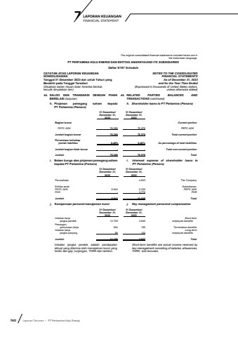740 Laporan Tahunan %u2022 PT Pertamina Hulu EnergiLAPORAN KEUANGAN 7 FINANCIAL STATEMENTThe original consolidated financial statements included herein are in the Indonesian language.PT PERTAMINA HULU ENERGI DAN ENTITAS ANAKNYA/AND ITS SUBSIDIARIESDaftar 5/187 ScheduleCATATAN ATAS LAPORAN KEUANGANKONSOLIDASIANTanggal 31 Desember 2023 dan untuk Tahun yang Berakhir pada Tanggal Tersebut(Disajikan dalam ribuan dolar Amerika Serikat, kecuali dinyatakan lain)NOTES TO THE CONSOLIDATEDFINANCIAL STATEMENTS As of December 31, 2023and for the Year Then Ended(Expressed in thousands of United States dollars,unless otherwise stated)44. SALDO DAN TRANSAKSI DENGAN PIHAKBERELASI (lanjutan)44. RELATED PARTIES BALANCES AND TRANSACTIONS (continued)h. Pinjaman pemegang saham kepada PT Pertamina (Persero)h. Shareholder loans to PT Pertamina (Persero)31 Desember/ 31 Desember/December 31, December 31, 2023 2022Bagian lancar Current portion PEPC ADK 76.289 75.976 PEPC ADKJumlah bagian lancar 76.289 75.976 Total current portionPersentase terhadap jumlah liabilitas 0,46% 0,46% As percentage of total liabilitiesJumlah bagian tidak lancar - - Total non-current portionJumlah 76.289 75.976 Totali. Beban bunga atas pinjaman pemegang saham kepada PT Pertamina (Persero)i. Intereset expense of shareholder loans toPT Pertamina (Persero)31 Desember/ 31 Desember/December 31, December 31, 2023 2022Perusahaan - 4.843 The CompanyEntitas anak: Subsidiaries:PEPC ADK 6.943 5.230 PEPC ADKPHR - 3.772 PHRJumlah 6.943 13.845 Totalj. Kompensasi personel manajemen kunci j. Key management personnel compensation31 Desember/ 31 Desember/December 31, December 31, 2023 2022Imbalan kerja Short-term jangka pendek 12.795 3.640 employee benefitsPesangonpemutusan kerja 264 195 Termination benefitsImbalan kerja Long-term jangka panjang 99 102 employee benefitsJumlah 13.158 3.937 TotalImbalan jangka pendek adalah pendapatan aktual yang diterima oleh manajemen kunci yang terdiri dari gaji, tunjangan, THRK dan tantiem.Short-term benefits are actual income received by key management consisting of salaries, allowances, THRK, and bonuses.