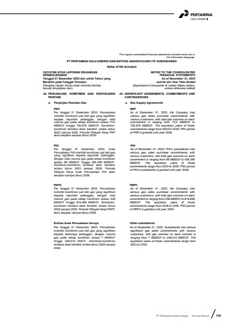 PT Pertamina Hulu Energi %u2022 Annual Report 741The original consolidated financial statements included herein are in the Indonesian language.PT PERTAMINA HULU ENERGI DAN ENTITAS ANAKNYA/AND ITS SUBSIDIARIESDaftar 5/188 ScheduleCATATAN ATAS LAPORAN KEUANGANKONSOLIDASIANTanggal 31 Desember 2023 dan untuk Tahun yang Berakhir pada Tanggal Tersebut(Disajikan dalam ribuan dolar Amerika Serikat,kecuali dinyatakan lain)NOTES TO THE CONSOLIDATEDFINANCIAL STATEMENTSAs of December 31, 2023and for the Year Then Ended(Expressed in thousands of United States dollars,unless otherwise stated)45. PERJANJIAN, KOMITMEN DAN KONTINJENSI PENTING45. SIGNIFICANT AGREEMENTS, COMMITMENTS AND CONTINGENCIESa. Perjanjian Pasokan Gas a. Gas Supply AgreementsPEPPer tanggal 31 Desember 2023, Perusahaan memiliki komitmen jual beli gas yang signifikan kepada sejumlah pelanggan, dengan totalvolume gas pada setiap komitmen antara 73.2MMSCF hingga 735.816 MMSCF. Komitmenkomitmen tersebut akan berakhir antara tahun 2023 sampai 2035. Periode Wilayah Kerja PEP akan berjalan sampai tahun 2035.PEPAs of December 31, 2023, the Company had various gas sales purchase commitments with various customers, with total gas volumes on each commitment is ranging from 73,2 MMSCF to 735,816 MMSCF. The expiration years of those commitments range from 2023 to 2035. PSC period of PEP is granted until year 2035.PHIPer tanggal 31 Desember 2023, Anak Perusahaan PHI memiliki komitmen jual beli gas yang signifikan kepada sejumlah pelanggan, dengan total volume gas pada setiap komitmen antara 98 MMSCF hingga 409.399 MMSCF.Komitmen-komitmen tersebut akan berakhir antara tahun 2023 sampai 2028. Periode Wilayah Kerja Anak Perusahaan PHI akan berjalan sampai tahun 2038.PHIAs of December 31, 2023, PHI%u2019s subsidiaries had various gas sales purchase commitments with various customers, with total gas volumes on each commitment is ranging from 98 MMSCF to 409,399MMSCF. The expiration years of those commitments range from 2023 to 2028. PSC period of PHI%u2019s subsidiaries is granted until year 2038.PEPCPer tanggal 31 Desember 2023, Perusahaan memiliki komitmen jual beli gas yang signifikan kepada sejumlah pelanggan, dengan totalvolume gas pada setiap komitmen antara 438 MMSCF hingga 816.656 MMSCF. Komitmenkomitmen tersebut akan berakhir antara tahun 2029 sampai 2035. Periode Wilayah Kerja PEPC akan berjalan sampai tahun 2035.PEPCAs of December 31, 2023, the Company had various gas sales purchase commitments with various customers, with total gas volumes on each commitment is ranging from 438 MMSCF to 816,656MMSCF. The expiration years of those commitments range from 2029 to 2035. PSC period of PEPC is granted until year 2035.Entitas Anak Perusahaan lainnyaPer tanggal 31 Desember 2023, Perusahaanmemiliki komitmen jual beli gas yang signifikan kepada beberapa pelanggan, dengan volume gas pada setiap komitmen antara 7 MMSCFhingga 246.510 MSCF. Komitmen-komitmentersebut akan berakhir antara tahun 2023 sampai 2042.Other subsidiariesAs of December 31, 2023, Subsidiaries has various significant gas sales commitments with various customers, with gas volumes on each contract is ranging from 7 MMSCF to 246,510 MMSCF. The expiration years of those commitments range from 2023 to 2042.