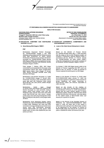 742 Laporan Tahunan %u2022 PT Pertamina Hulu EnergiLAPORAN KEUANGAN 7 FINANCIAL STATEMENTThe original consolidated financial statements included herein are in the Indonesian language.PT PERTAMINA HULU ENERGI DAN ENTITAS ANAKNYA/AND ITS SUBSIDIARIESDaftar 5/189 ScheduleCATATAN ATAS LAPORAN KEUANGANKONSOLIDASIANTanggal 31 Desember 2023 dan untuk Tahun yang Berakhir pada Tanggal Tersebut(Disajikan dalam ribuan dolar Amerika Serikat,kecuali dinyatakan lain)NOTES TO THE CONSOLIDATEDFINANCIAL STATEMENTSAs of December 31, 2023and for the Year Then Ended(Expressed in thousands of United States dollars,unless otherwise stated)45. PERJANJIAN, KOMITMEN DAN KONTINJENSI PENTING (lanjutan)45. SIGNIFICANT AGREEMENTS, COMMITMENTS AND CONTINGENCIES (continued)b. Sewa Barang Milik Negara (%u201cBMN%u201d) b. Lease of the State Owned Enterprises%u2019s Assets PEP PEPBerdasarkan Keputusan Menteri Keuangan No. 92/KMK.06/2008 tanggal 2 Mei 2008 ditetapkan bahwa status aset eks Pertamina Lama yang tidak dimasukkan ke dalam Neraca Pembukaan Pertamina sesuai dengan SK Menteri Keuangan No. 23/KMK.06/2008, adalah Barang Milik Negara (%u201cBMN%u201d) dimana pengelolaan barangbarang tersebut dilakukan oleh Direktorat Jendral Kekayaan Negara (%u201cDJKN%u201d).Based on the Minister of Finance Decree No. 92/KMK.06/2008 dated May 2, 2008 stipulates that the status of the ex-Old Pertamina assets not included in Pertamina's Opening Balance Sheet in accordance with the Minister of Finance Decree No. 23/KMK.06/2008, are State Assets (\where the management of such assets is carried out by Direktorat Jendral Kekayaan Negara (%u201cDJKN%u201d).Pada tanggal 7 Oktober 2008, SKK Migas menerbitkan surat kepada Menteri Keuangan yang menyarankan bahwa PEP dapat menggunakan BMN secara bebas. Pada tanggal 14 Januari 2009, Menteri Keuangan menolak saran yang diberikan SKK Migas.On October 7, 2008, SKK Migas issued a letter to the Minister of Finance suggesting that PEP could use BMN for free. On January 14, 2009, the Minister of Finance rejected the advice given by SKK Migas.Berdasarkan surat Menteri Keuangan cq. DJKN No. S-23/MK.6/2009 tanggal 21 Januari 2009, Pemerintah menyetujui untuk menerapkan skema sewa atas aset eks Pertamina Lama senilai Rp16.226.357 juta (nilai penuh) (setara dengan AS$1.444.269).Based on the Minister of Finance cq. DJKN Letter No.S-23/MK.6/2009 dated January 21, 2009, the Government agreed to implement a lease scheme for former Pertamina old assets amounting to Rp16,226,357 million (full amount) (equivalent to US$1,444,269).Berdasarkan risalah rapat tanggal 23 Januari 2009, yang dihadiri oleh Pertamina dan Menteri Keuangan cq. wakil penDJKN, disetujui bahwa skema sewa berlaku untuk aset eks Pertamina Lama, kecuali untuk sumur dan tanah senilai Rp6.753.549 juta (nilai penuh), dengan jumlah sewa untuk aset yang bersangkutan senilai Rp9.472.808 juta (nilai penuh) untuk jangka waktu 32 tahun.Based on the minutes of the meeting on January 23, 2009, which was attended by Pertamina and the Minister of Finance cq. DJKN representative, agreed that the lease scheme applies to former Pertamina%u2019s assets, except for wells and land valued at Rp6,753,549 million (full amount), with total leases for the related assets of Rp9,472,808 million (full amount) for a period of 32 years.Berdasarkan Surat Keputusan Direktur Utama Pertamina No. Kpts-023/C00000/2009-S0 tanggal 6 Maret 2009, ditetapkan tarif sewa aset KKS sementara menunggu ditetapkannya kontrak sewa secara resmi oleh Kementerian Keuangan sebesar Rp9.472.808 juta (nilai penuh) untuk jangka waktu 32 tahun atau Rp296.025 juta (nilai penuh) per tahun.Based on the Decree of the President Director of Pertamina No. Kpts-023/C00000/2009-S0 dated March 6, 2009, the lease rate of PSC assets is determined while waiting for the official lease contract to be determined by the Ministry of Finance of Rp9,472,808 million (full amount) for a period of 32 years or Rp296,025 million (full amount) per year.