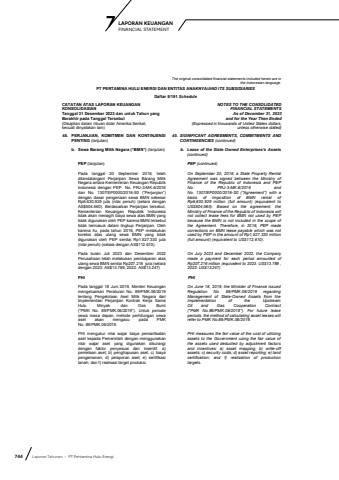744 Laporan Tahunan %u2022 PT Pertamina Hulu EnergiLAPORAN KEUANGAN 7 FINANCIAL STATEMENTThe original consolidated financial statements included herein are in the Indonesian language.PT PERTAMINA HULU ENERGI DAN ENTITAS ANAKNYA/AND ITS SUBSIDIARIESDaftar 5/191 ScheduleCATATAN ATAS LAPORAN KEUANGANKONSOLIDASIANTanggal 31 Desember 2023 dan untuk Tahun yang Berakhir pada Tanggal Tersebut(Disajikan dalam ribuan dolar Amerika Serikat,kecuali dinyatakan lain)NOTES TO THE CONSOLIDATEDFINANCIAL STATEMENTSAs of December 31, 2023and for the Year Then Ended(Expressed in thousands of United States dollars,unless otherwise stated)45. PERJANJIAN, KOMITMEN DAN KONTINJENSI PENTING (lanjutan)45. SIGNIFICANT AGREEMENTS, COMMITMENTS AND CONTINGENCIES (continued)b. Sewa Barang Milik Negara (%u201cBMN%u201d) (lanjutan) b. Lease of the State Owned Enterprises%u2019s Assets (continued) PEP (lanjutan) PEP (continued)Pada tanggal 20 September 2016, telah ditandatangani Perjanjian Sewa Barang Milik Negara antara Kementerian Keuangan Republik Indonesia dengan PEP No. PRJ-3-MK.6/2016dan No. 1307/EP0000/2016-S0 (%u201cPerjanjian%u201d) dengan dasar pengenaan sewa BMN sebesar Rp6.630.929 juta (nilai penuh) (setara dengan AS$504.560). Berdasarkan Perjanjian tersebut, Kementerian Keuangan Republik Indonesia tidak akan menagih biaya sewa atas BMN yang tidak digunakan oleh PEP karena BMN tersebut tidak termasuk dalam lingkup Perjanjian. Oleh karena itu, pada tahun 2016, PEP melakukan koreksi atas utang sewa BMN yang tidak digunakan oleh PEP senilai Rp1.527.330 juta (nilai penuh) (setara dengan AS$112.610).On September 20, 2016, a State Property Rental Agreement was signed between the Ministry of Finance of the Republic of Indonesia and PEPNo. PRJ-3-MK.6/2016 andNo. 1307/EP0000/2016-S0 (\basis of imposition of BMN rental of Rp6,630,929 million (full amount) (equivalent to US$504,560). Based on the agreement, the Ministry of Finance of the Republic of Indonesia will not collect lease fees for BMN not used by PEP because the BMN is not included in the scope of the Agreement. Therefore, in 2016, PEP made corrections on BMN lease payable which was not used by PEP in the amount of Rp1,527,330 million (full amount) (equivalent to US$112,610).Pada bulan Juli 2023 dan Desember 2022 Perusahaan telah melakukan pembayaran atas utang sewa BMN senilai Rp207.216 juta (setara dengan 2023: AS$13.789, 2022: AS$13.247)On July 2023 and December 2022, the Company made a payment for each period amounted of Rp207,216 million (equivalent to 2023: US$13.789 , 2022: US$13,247) PHI PHI Pada tanggal 18 Juni 2019, Menteri Keuangan mengeluarkan Peraturan No. 89/PMK.06/2019 tentang Pengelolaan Aset Milik Negara dari Implementasi Perjanjian Kontrak Kerja Sama Hulu Minyak dan Gas Bumi (%u201cPMK No. 89/PMK.06/2019%u201d). Untuk periode sewa masa depan, metode perhitungan sewa aset akan mengacu pada PMK No. 89/PMK.06/2019.On June 18, 2019, the Minister of Finance issued Regulation No. 89/PMK.06/2019 regarding Management of State-Owned Assets from the Implementation of the Upstream Oil and Gas Cooperation Contract (\periods, the method of calculating asset leases will refer to PMK No.89/PMK.06/2019.PHI mengukur nilai wajar biaya pemanfaatan aset kepada Pemerintah dengan menggunakan nilai wajar aset yang digunakan dikurangi dengan faktor penyesuai dan insentif: a) pemetaan aset; b) penghapusan aset; c) biaya pengamanan; d) pelaporan aset; e) sertifikasi tanah; dan f) realisasi target produksi.PHI measures the fair value of the cost of utilizing assets to the Government using the fair value of the assets used deducted by adjustment factors and incentives: a) asset mapping; b) write-off assets; c) security costs; d) asset reporting; e) land certification; and f) realization of production targets.