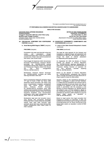 746 Laporan Tahunan %u2022 PT Pertamina Hulu EnergiLAPORAN KEUANGAN 7 FINANCIAL STATEMENTThe original consolidated financial statements included herein are in the Indonesian language.PT PERTAMINA HULU ENERGI DAN ENTITAS ANAKNYA/AND ITS SUBSIDIARIESDaftar 5/193 ScheduleCATATAN ATAS LAPORAN KEUANGANKONSOLIDASIANTanggal 31 Desember 2023 dan untuk Tahun yang Berakhir pada Tanggal Tersebut(Disajikan dalam ribuan dolar Amerika Serikat, kecuali dinyatakan lain)NOTES TO THE CONSOLIDATEDFINANCIAL STATEMENTS As of December 31, 2023and for the Year Then Ended(Expressed in thousands of United States dollars,unless otherwise stated)45. PERJANJIAN, KOMITMEN DAN KONTINJENSIPENTING (lanjutan)45. SIGNIFICANT AGREEMENTS, COMMITMENTS ANDCONTINGENCIES (continued)b. Sewa Barang Milik Negara (%u201cBMN%u201d) (lanjutan) b. Lease of the State Owned Enterprises%u2019s Assets(continued) PHE ONWJ (lanjutan) PHE ONWJ (continued)Pendekatan nilai wajar aset diperoleh antara lain melalui self assessment dengan mempertimbangkan faktor utilitas dan kapasitas produksi atau melalui hasil external assessmentoleh Kantor Jasa Penilai Publik.The asset fair value approach for the Company andSubsidiaries is obtained through self assessment withconsidering the utility factor and production capacity orthrough the results of external assessmentby independent public appraisal service.Pada tanggal 28 September 2020, Kementerian Keuangan memberlakukan Peraturan Menteri Keuangan No. 140/PMK.06/2020 tentang Pengelolaan Barang Milik Negara yang Berasal dari Pelaksanaan Kegiatan Usaha Hulu Minyak dan Gas Bumi menggantikan PMK No. 89/PMK.06/2019.On September 28, 2020, the Ministry of Financeenacted the Minister of Finance RegulationNo. 140/PMK.06/2020 regarding Management ofState Assets Originating from the Implementation ofProduction Sharing Contract of Upstream Oiland Gas Business Activities replacingPMK No. 89/PMK.06/2019.Berdasarkan Peraturan Menteri Keuangan No. 140/PMK.06/2020, kontraktor alih kelola tidak lagi dikenakan sewa aset.Based on the Minister of Finance RegulationNo. 140/PMK.06/2020, subsidiaries that receivedright to manage terminated oil and gas blocks are no longer subject to lease the State assets.Namun berdasarkan Ketentuan Peralihan Pasal 171 ayat (1) huruf d PMK 140 Tahun 2020 disebutkan bahwa Kontraktor Alih Kelola yang belum menyelesaikan kewajiban pembayaran sewa aset sesuai dengan ketentuan dalam Peraturan Menteri Keuangan No 89/PMK.06/2019 dinyatakan tetap wajib melaksanakan kewajiban tersebut. Berdasarkan Ketentuan Peralihan tersebut, KKKS Alih Kelola berpotensi diwajibkan untuk menyelesaikan pembayaran sewa asset sebagaimana diatur dalam PMK No. 89/PMK.06/2019.However, based on the Transitional Provisions ofArticle 171 paragraph (1) letter d of PMK 140/2020,it is stated that the subsidiaries that received right tomanage terminated oil and gas blocks who has notcompleted the obligation to pay the leased Stateassets in accordance with the provisions in theMinister of Finance Regulation No. 89/PMK.06/2019still obliged to carry out these obligations. Based onthe Transitional Provisions, the Transferred KKKS will potentially be required to settle obligations to pay the leased State assets as stipulated inPMK No. 89/PMK.06/2019.Berdasarkan legal opini dari konsultan hukum yang ditunjuk oleh perusahaan tertanggal 6 November 2023, entitas-entitas alih kelola atas wilayah kerja yang telah terminasi tidakmencatat akrual atas sewa asset Barang Milik Negara sebagaimana diatur dalam pasal 24 PMK 140/2020.Based on legal opinion from legal consultant thatassigned by company on November, 6 2023, thesubsidiaries that received right to manage termanited oil and gas blocks will not record the accrual on the leased state assets as stipulated in article 24 PMK 140/2020.