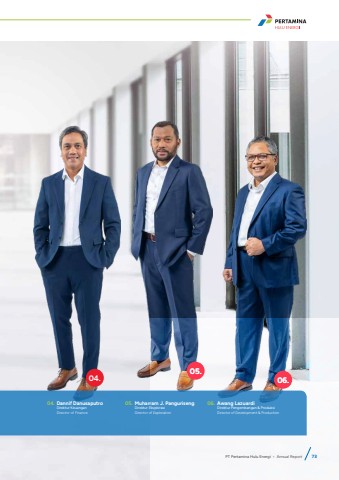 04.05.06.04. Dannif DanusaputroDirektur KeuanganDirector of Finance06. Awang Lazuardi Direktur Pengembangan & ProduksiDirector of Development & Production05. Muharram J. PangurisengDirektur EksplorasiDirector of ExplorationPT Pertamina Hulu Energi %u2022 Annual Report 73