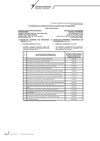 748 Laporan Tahunan %u2022 PT Pertamina Hulu EnergiLAPORAN KEUANGAN 7 FINANCIAL STATEMENTThe original consolidated financial statements included herein are in the Indonesian language.PT PERTAMINA HULU ENERGI DAN ENTITAS ANAKNYA/AND ITS SUBSIDIARIESDaftar 5/195 ScheduleCATATAN ATAS LAPORAN KEUANGANKONSOLIDASIANTanggal 31 Desember 2023 dan untuk Tahun yang Berakhir pada Tanggal Tersebut(Disajikan dalam ribuan dolar Amerika Serikat,kecuali dinyatakan lain)NOTES TO THE CONSOLIDATEDFINANCIAL STATEMENTSAs of December 31, 2023and for the Year Then Ended(Expressed in thousands of United States dollars,unless otherwise stated)45. PERJANJIAN, KOMITMEN DAN KONTINJENSI PENTING (lanjutan)45. SIGNIFICANT AGREEMENTS, COMMITMENTS AND CONTINGENCIES (continued)c. Komitmen eksplorasi (lanjutan) c. Exploration commitments (continued)Komitmen eksplorasi (komitmen pasti dan komitmen kerja) Entitas Anak dengan KBH Gross Split adalah sebagai berikut:The exploration commitments (firm commitment and working commitment) of Subsidiaries with Gross Split PSC are as follows:No Nama Entitas Anak dan Wilayah Kerja/Name of Subsidiaries and Working AreaKomitmen Program Kerja dan Pengeluaran (nilai penuh)/Work Program and Expenditure Commitment (full amount)1. PT Pertamina Hulu Energi ONWJ - Blok ONWJ/ONWJ Block 82.300.0002. PT Pertamina Hulu Energi NSO - Blok NSO/NSO Block 43.000.0003. PT Pertamina Hulu Energi Ogan Komering - Blok Ogan Komering/Ogan Komering Block 60.600.0004. PT Pertamina Hulu Energi Tuban East Java - Blok Tuban/Tuban Block 114.070.0005. PT Pertamina Hulu Energi OSES - Blok OSES/OSES Block 231.000.0006. PT Pertamina Hulu Energi Raja Tempirai - Blok Pendopo - Raja/Pendopo - Raja Block 15.550.0007. PT Pertamina Hulu Energi Jambi Merang - Blok Jambi Merang/Jambi Merang Block 239.300.0008. PT Pertamina Hulu Energi Salawati Basin - Blok Kepala Burung/Kepala Burung Block 61.222.0009. PT Pertamina Hulu Energi Salawati - Blok Salawati/Salawati Block 36.250.00010. PT Pertamina Hulu Energi East Sepinggan - Blok East Sepinggan/East Sepinggan Block 80.610.00011. PT Pertamina Hulu Energi Corridor - Blok Corridor/Corridor Block 250.000.00012. PT Pertamina Hulu Energi South East Jambi - Blok South East Jambi/South East Jambi Block* 26.400.00013. PT Pertamina Hulu Sanga Sanga - Blok Sanga Sanga/Sanga Sanga Block 703.000.00014. PT Pertamina Hulu Kalimantan Timur - Blok East Kalimantan dan Attaka/East Kalimantan and Attaka Block 141.300.00015. PT Pertamina Hulu West Ganal - Blok West Ganal/West Ganal Block* 159.700.00016. PT Pertamina Hulu Energi Lepas Pantai Bunyu - Blok Maratua/Maratua Block* 66.050.00017. PT Pertamina Hulu Rokan 500.000.000* Entitas Anak masih dalam tahap eksplorasi/the Subsidiary is still in the exploration stage