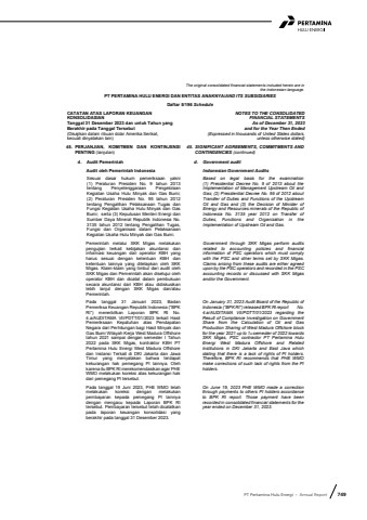 PT Pertamina Hulu Energi %u2022 Annual Report 749The original consolidated financial statements included herein are in the Indonesian language.PT PERTAMINA HULU ENERGI DAN ENTITAS ANAKNYA/AND ITS SUBSIDIARIESDaftar 5/196 ScheduleCATATAN ATAS LAPORAN KEUANGANKONSOLIDASIANTanggal 31 Desember 2023 dan untuk Tahun yang Berakhir pada Tanggal Tersebut(Disajikan dalam ribuan dolar Amerika Serikat, kecuali dinyatakan lain)NOTES TO THE CONSOLIDATEDFINANCIAL STATEMENTS As of December 31, 2023and for the Year Then Ended(Expressed in thousands of United States dollars,unless otherwise stated)45. PERJANJIAN, KOMITMEN DAN KONTINJENSIPENTING (lanjutan)45. SIGNIFICANT AGREEMENTS, COMMITMENTS ANDCONTINGENCIES (continued)d. Audit Pemerintah d. Government auditAudit oleh Pemerintah Indonesia Indonesian Government AuditsSesuai dasar hukum pemeriksaan yakni(1) Peraturan Presiden No. 9 tahun 2013tentang Penyelenggaraan PengelolaanKegiatan Usaha Hulu Minyak dan Gas Bumi;(2) Peraturan Presiden No. 95 tahun 2012tentang Pengalihan Pelaksanaan Tugas danFungsi Kegiatan Usaha Hulu Minyak dan GasBumi; serta (3) Keputusan Menteri Energi danSumber Daya Mineral Republik Indonesia No. 3135 tahun 2012 tentang Pengalihan Tugas,Fungsi dan Organisasi dalam PelaksanaanKegiatan Usaha Hulu Minyak dan Gas Bumi.Based on legal basis for the examination(1) Presidential Decree No. 9 of 2013 about theImplementation of Management Upstream Oil andGas; (2) Presidential Decree No. 95 of 2012 aboutTransfer of Duties and Functions of the UpstreamOil and Gas and (3) the Decision of Minister of Energy and Resources minerals of the Republic ofIndonesia No. 3135 year 2012 on Transfer ofDuties, Functions and Organization in theImplementation of Upstream Oil and Gas. Pemerintah melalui SKK Migas melakukan pengujian terkait kebijakan akuntansi dan informasi keuangan dari operator KBH yang harus sesuai dengan ketentuan KBH dan ketentuan lainnya yang ditetapkan oleh SKK Migas. Klaim-klaim yang timbul dari audit oleh SKK Migas dan Pemerintah akan disetujui oleh operator KBH dan dicatat dalam pembukuan secara akuntansi dari KBH atau didiskusikan lebih lanjut dengan SKK Migas dan/atau Pemerintah.Government through SKK Migas perform audits related to accounting policies and financial information of PSC operators which must comply with the PSC and other terms set by SKK Migas. Claims arising from these audits are either agreed upon by the PSC operators and recorded in the PSC accounting records or discussed with SKK Migas and/or the Government.Pada tanggal 31 Januari 2023, Badan Pemeriksa Keuangan Republik Indonesia (%u201cBPK RI%u201d) menerbitkan Laporan BPK RI No. 4.a/AUDITAMA VII/PDTT/01/2023 terkait HasilPemeriksaan Kepatuhan atas PendapatanNegara dari Perhitungan bagi Hasil Minyak danGas Bumi Wilayah Kerja West Madura Offshore tahun 2021 sampai dengan semester I Tahun2022 pada SKK Migas, kontraktor KBH PT Pertamina Hulu Energi West Madura Offshoredan Instansi Terkait di DKI Jakarta dan JawaTimur yang menyatakan bahwa terdapatkekurangan hak pemegang PI lainnya. Oleh karena itu BPK RI merekomendasikan agar PHE WMO melakukan koreksi atas kekurangan hakdari pemegang PI tersebut. On January 31, 2023 Audit Board of the Republic of Indonesia (%u201cBPK RI%u201d) released BPK RI report No. 4.a/AUDITAMA VII/PDTT/01/2023 regarding theResult of Compliance Investigation on GovernmentShare from the Calculation of Oil and GasProduction Sharing of West Madura Offshore blockfor the year 2021 up to 1st semester of 2022 towards SKK Migas, PSC contractor PT Pertamina HuluEnergi West Madura Offshore and RelatedInstitutions in DKI Jakarta and East Java whichstating that there is a lack of rights of PI holders.Therefore, BPK RI recommends that PHE WMOmake corrections of such lack of rights from the PIholders.Pada tanggal 19 Juni 2023, PHE WMO telah melakukan koreksi dengan melakukan pembayaran kepada pemegang PI lainnya dengan mengacu kepada Laporan BPK RI tersebut. Pembayaran tersebut telah dicatatkan pada laporan keuangan konsolidasi yang berakhir pada tanggal 31 Desember 2023.On June 19, 2023 PHE WMO made a correction through payments to others PI holders accordance to BPK RI report. Those payment have been recorded in consolidated financial statements for the year ended on December 31, 2023.