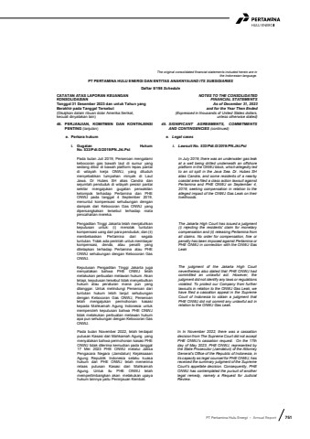 PT Pertamina Hulu Energi %u2022 Annual Report 751The original consolidated financial statements included herein are in the Indonesian language.PT PERTAMINA HULU ENERGI DAN ENTITAS ANAKNYA/AND ITS SUBSIDIARIESDaftar 5/198 ScheduleCATATAN ATAS LAPORAN KEUANGANKONSOLIDASIANTanggal 31 Desember 2023 dan untuk Tahun yang Berakhir pada Tanggal Tersebut(Disajikan dalam ribuan dolar Amerika Serikat, kecuali dinyatakan lain)NOTES TO THE CONSOLIDATEDFINANCIAL STATEMENTS As of December 31, 2023and for the Year Then Ended(Expressed in thousands of United States dollars,unless otherwise stated)45. PERJANJIAN, KOMITMEN DAN KONTINJENSIPENTING (lanjutan)45. SIGNIFICANT AGREEMENTS, COMMITMENTSAND CONTINGENCIES (continued)e. Perkara hukum e. Legal cases i. Gugatan HukumNo. 533/Pdt.G/2019/PN.Jkt.PstPada bulan Juli 2019, Perseroan mengalamikebocoran gas bawah laut di sumur yangsedang dibor di bawah platform lepas pantaidi wilayah kerja ONWJ, yang dituduhmenyebabkan tumpahan minyak di LautJawa. Dr Hubes SH alias Candra dansejumlah penduduk di wilayah pesisir pantaisekitar mengajukan gugatan perwakilankelompok terhadap Pertamina dan PHEONWJ pada tanggal 4 September 2019,menuntut kompensasi sehubungan dengandampak dari Kebocoran Gas ONWJ yangdipersangkakan tersebut terhadap matapencaharian mereka.i. Lawsuit No. 533/Pdt.G/2019/PN.Jkt.PstIn July 2019, there was an underwater gas leak at a well being drilled underneath an offshore platform in the ONWJ block, which allegedly led to an oil spill in the Java Sea. Dr. Hubes SH alias Candra, and some residents of a nearby coastal area filed a class action lawsuit against Pertamina and PHE ONWJ on September 4, 2019, seeking compensation in relation to the alleged impact of the ONWJ Gas Leak on their livelihoods.Pengadilan Tinggi Jakarta telah menjatuhkankeputusan untuk: (i) menolak tuntutankompensasi uang dari para penduduk; dan (ii) membebaskan Pertamina dari segalatuntutan. Tidak ada perintah untuk membayar kompensasi, denda, atau penalti yangditetapkan terhadap Pertamina atau PHEONWJ sehubungan dengan Kebocoran GasONWJ.Keputusan Pengadilan Tinggi Jakarta jugamenyatakan bahwa PHE ONWJ telahmelakukan perbuatan melawan hukum. Akantetapi, keputusan tersebut tidak menyebutkan hukum atau peraturan mana pun yangdilanggar. Untuk melindungi Perseroan darituntutan hukum lebih lanjut sehubungandengan Kebocoran Gas ONWJ, Perseroantelah mengajukan permohonan kasasikepada Mahkamah Agung Indonesia untukmemperoleh keputusan bahwa PHE ONWJtidak melakukan perbuatan melawan hukumapa pun sehubungan dengan Kebocoran Gas ONWJ.The Jakarta High Court has issued a judgment (i) rejecting the residents' claim for monetarycompensation and (ii) releasing Pertamina from all claims. No order for compensation, fine orpenalty has been imposed against Pertamina or PHE ONWJ in connection with the ONWJ GasLeakThe judgment of the Jakarta High Court nevertheless also stated that PHE ONWJ had committed an unlawful act. However, the judgment did not identify any laws or regulations violated. To protect our Company from further lawsuits in relation to the ONWJ Gas Leak, we have filed a cassation appeal in the Supreme Court of Indonesia to obtain a judgment that PHE ONWJ did not commit any unlawful act in relation to the ONWJ Gas Leak.Pada bulan November 2022, telah terdapatputusan Kasasi dari Mahkamah Agung yangmenyatakan bahwa permohonan kasasi PHEONWJ tidak diterima kemudian pada tanggal17 Mei 2023 PHE ONWJ melalui JaksaPengacara Negara (Jamdatun) KejaksaaanAgung Republik Indonesia selaku kuasahukum dari PHE ONWJ telah menerimarelaas putusan Kasasi dari MahkamahAgung. Untuk itu PHE ONWJ telahmempertimbangkan akan melakukan upayahukum lainnya yaitu Peninjauan Kembali.In In November 2022, there was a cassation decision from The Supreme Court did not accept PHE ONWJ%u2019s cassation request. On the 17th day of May 2023, PHE ONWJ, represented by the State Prosecutor (Jamdatun) of the Attorney General's Office of the Republic of Indonesia, in its capacity as legal counsel for PHE ONWJ, has received the summary judgment of the Supreme Court's appellate decision. Consequently, PHE ONWJ has contemplated the pursuit of another legal remedy, namely a Request for Judicial Review.